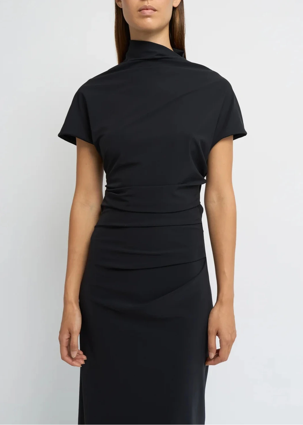 Cap-sleeve ankle-length dress defined by a high mock neckline and soft waist folds that shape the silhouette with subtle definition. Made in recycled Italian stretch fabric, chosen for its smooth feel and gentle structure. A timeless, versatile piece designed with clean lines and quiet refinement.