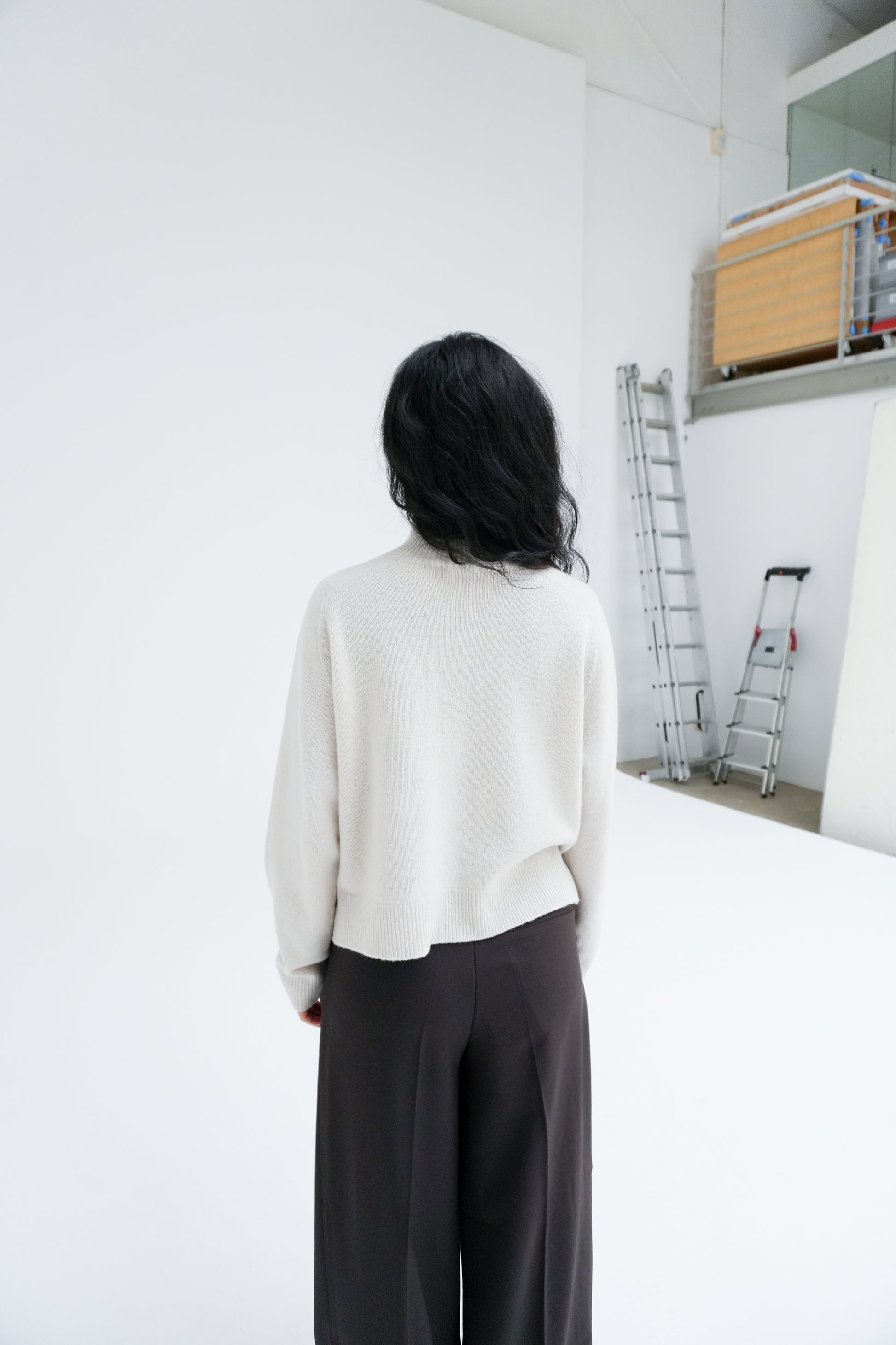 Lyzima is a turtleneck jumper with a cropped length and side slits. The virgin wool is characterised by its unique fibre structure.