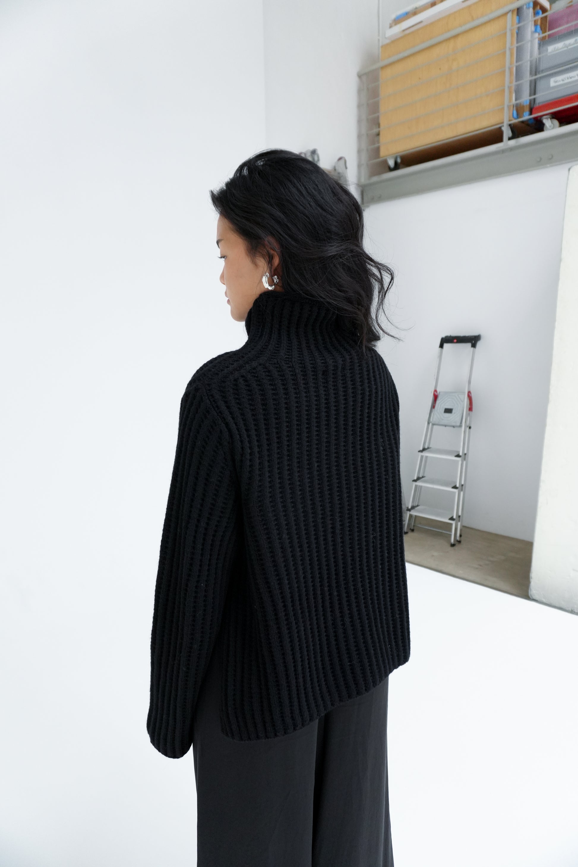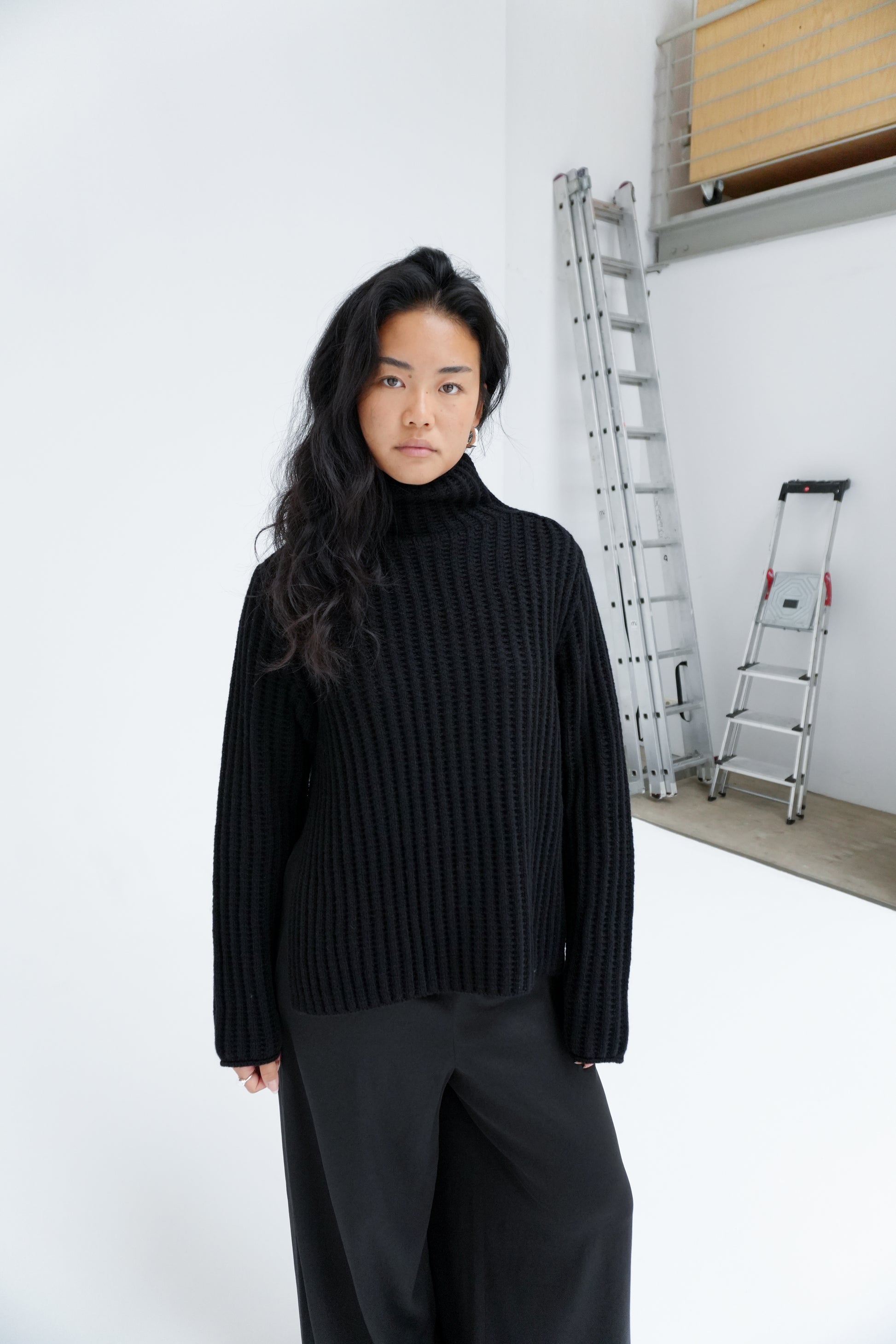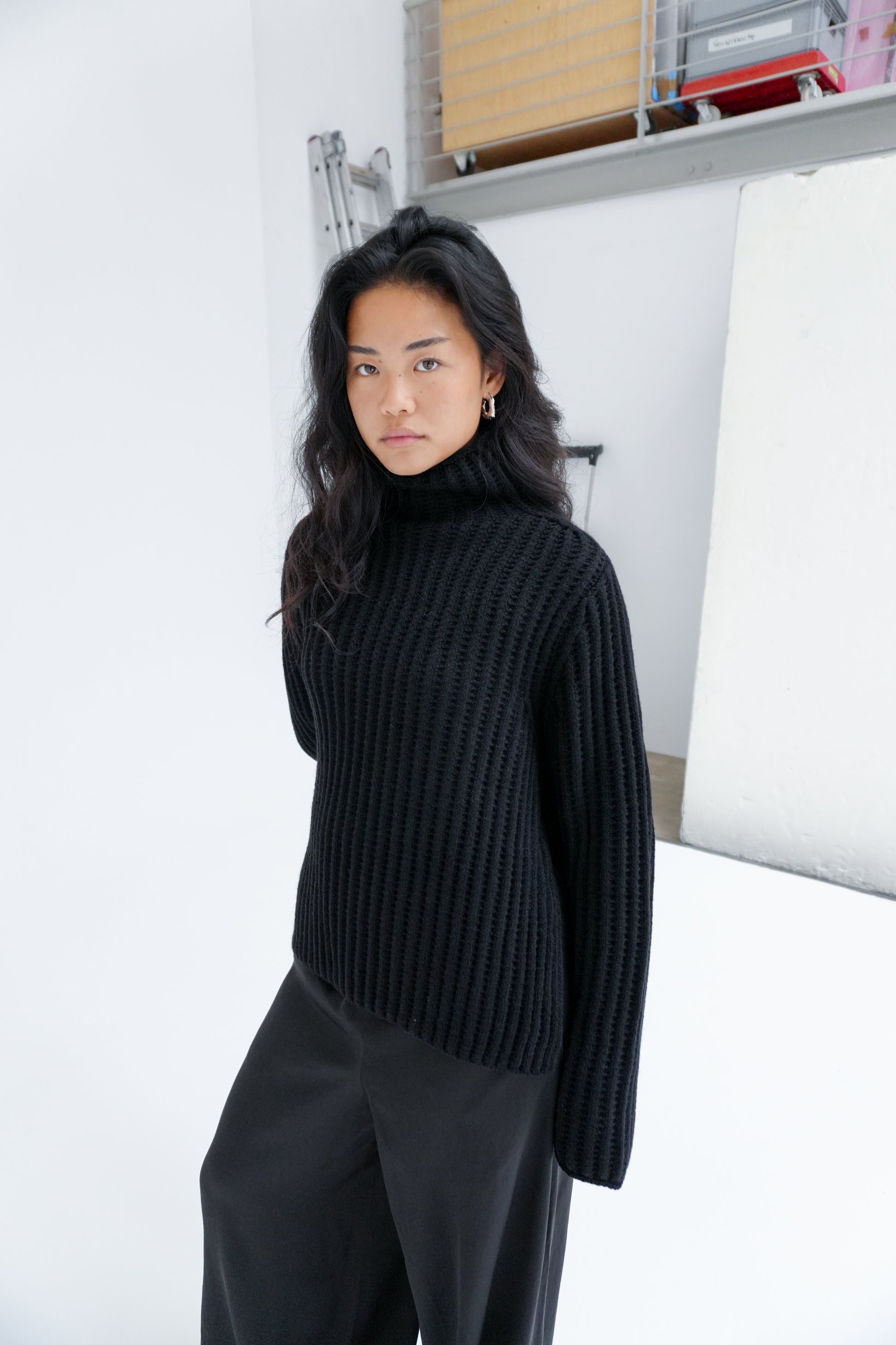 VARISA is a straight-cut turtleneck sweater. The side slits at the hem provide more freedom of movement and a modern fit. The high collar emphasises the clear design. Made from Drykorns signature alpaca yarn.