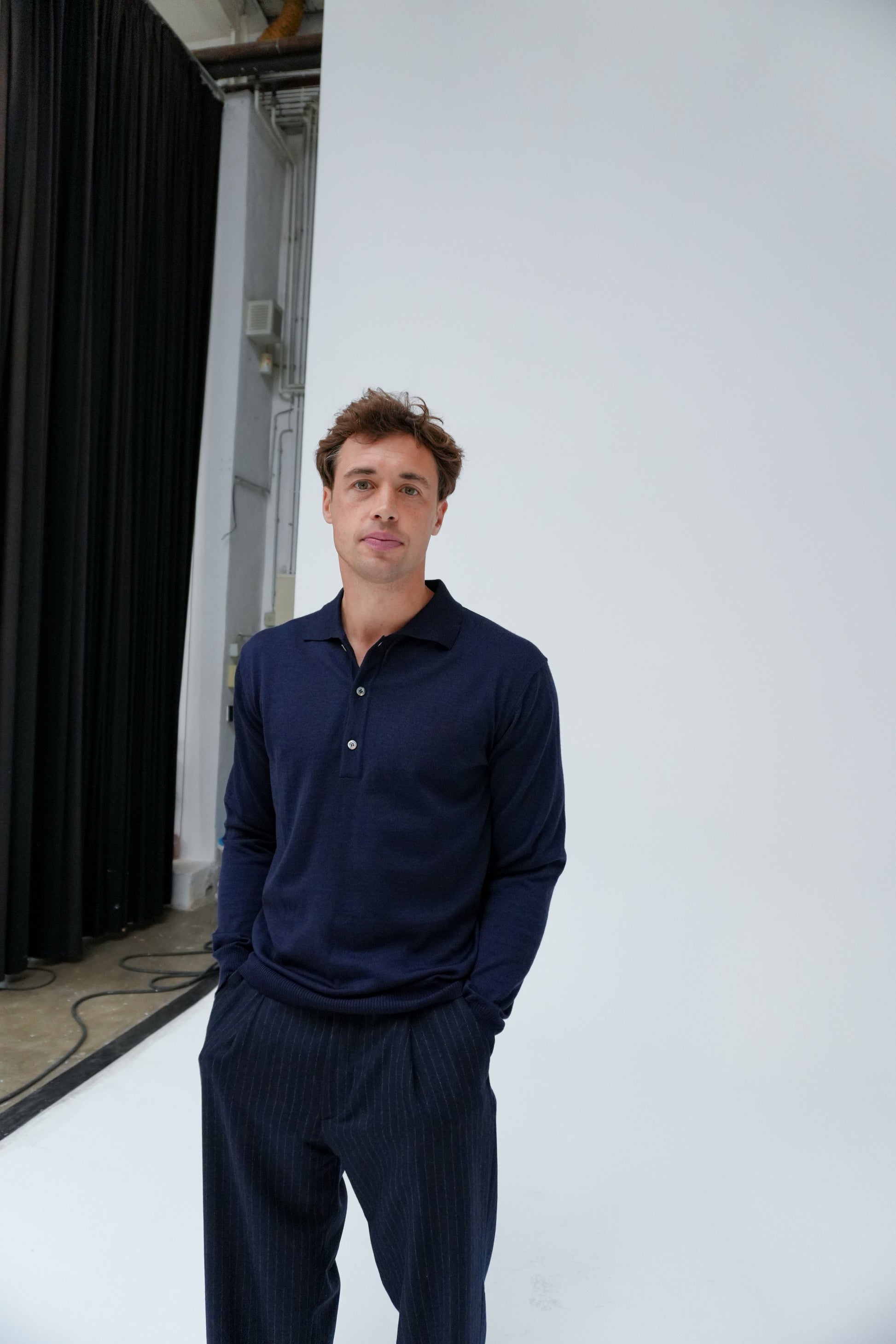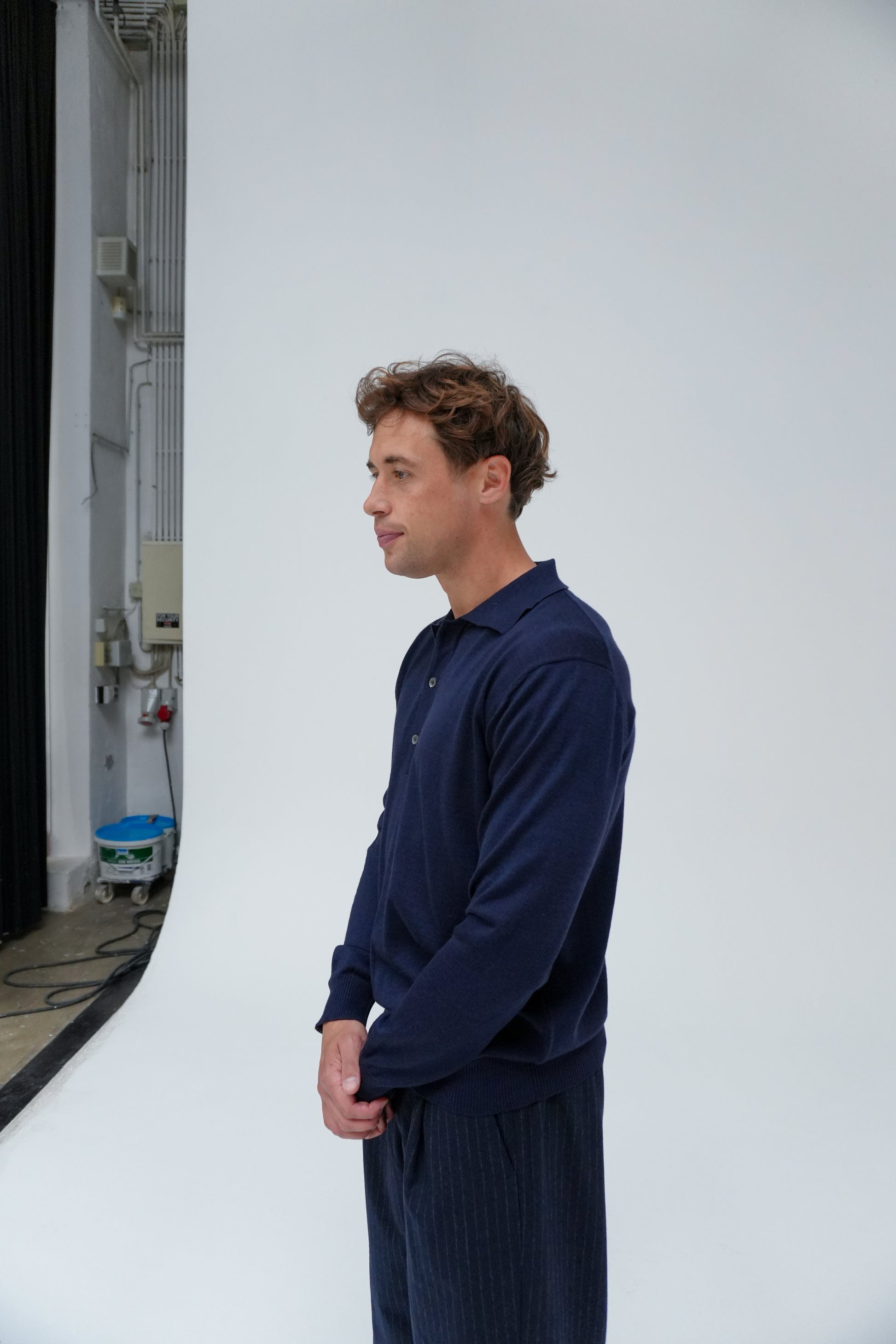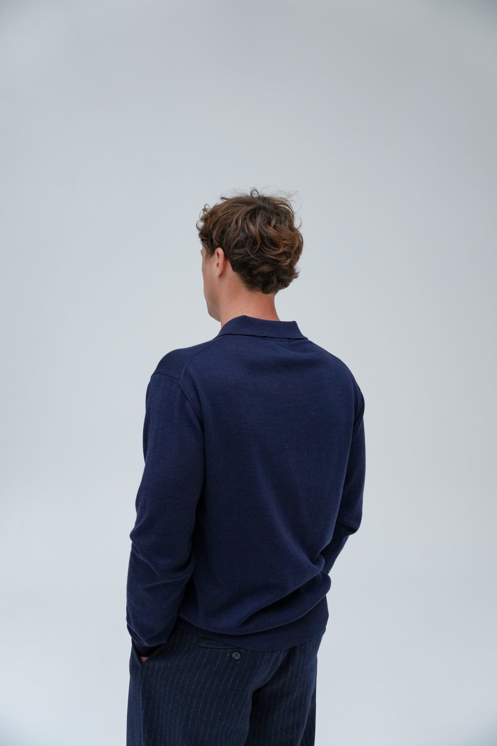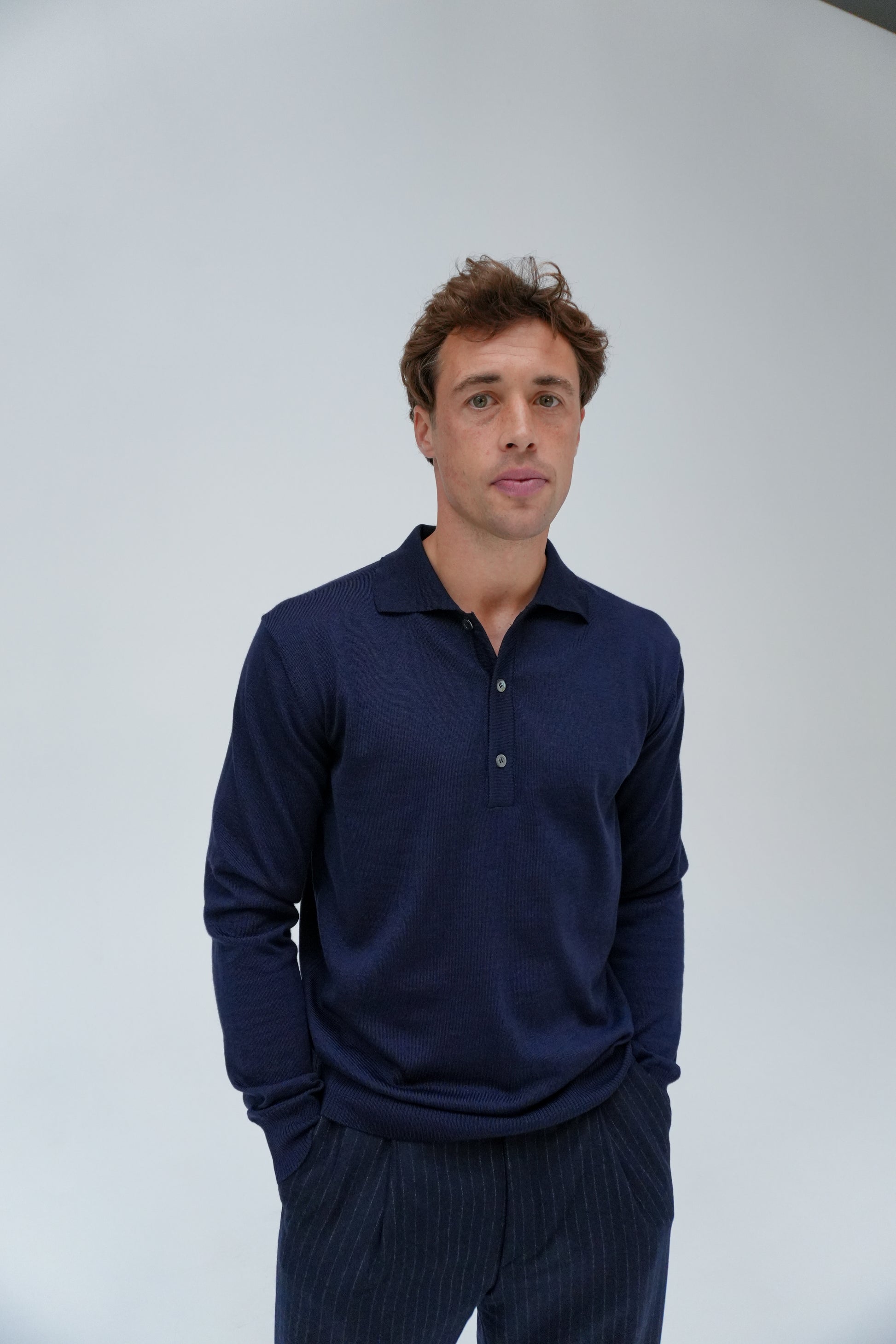 A lightly knitted long-sleeved polo shirt that we genuinely love. Works all year-round worn on its own with a pair of trousers or under a coat in colder times. Knitted in Italy in soft, organic merino wool with mother-of-pearl buttons.