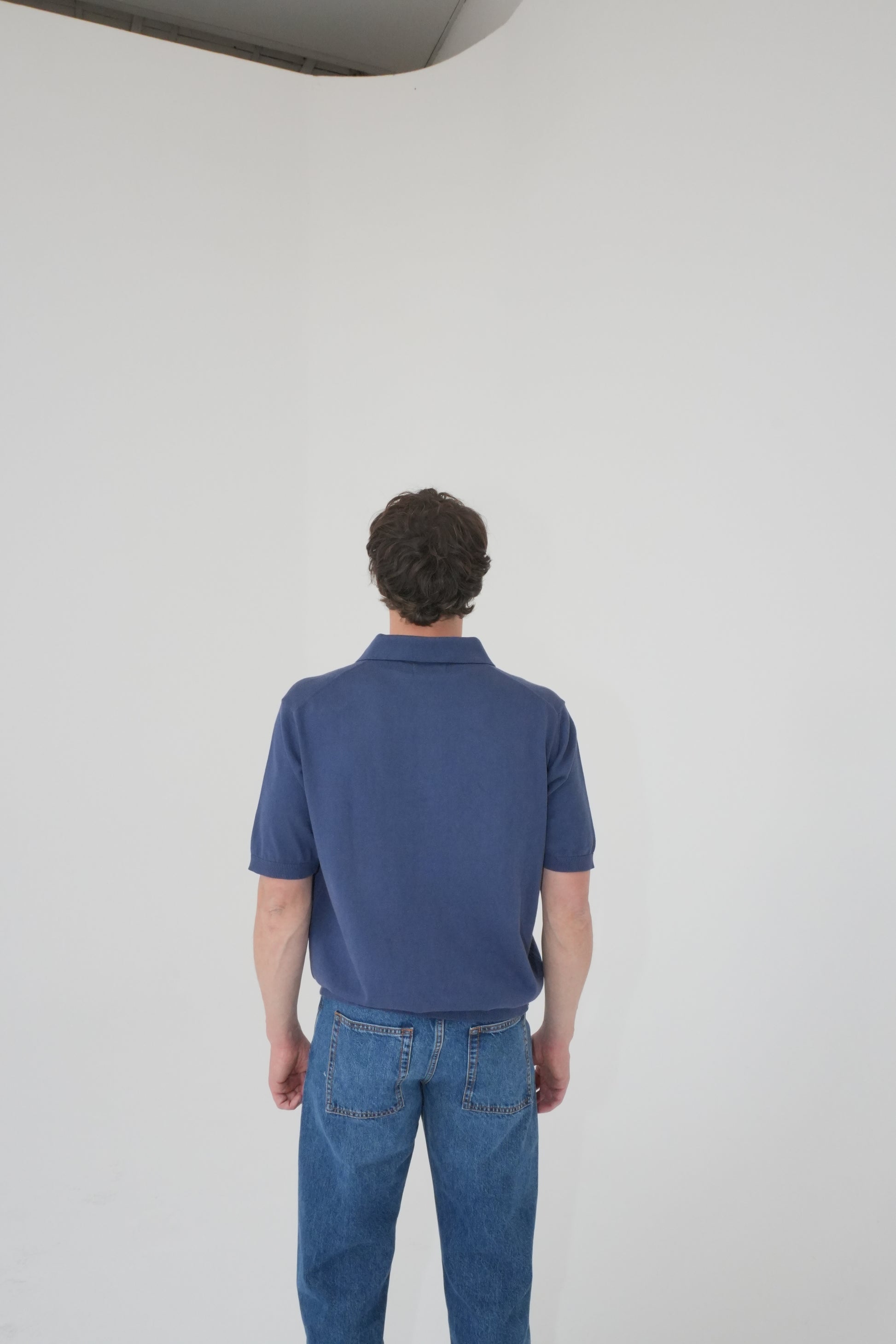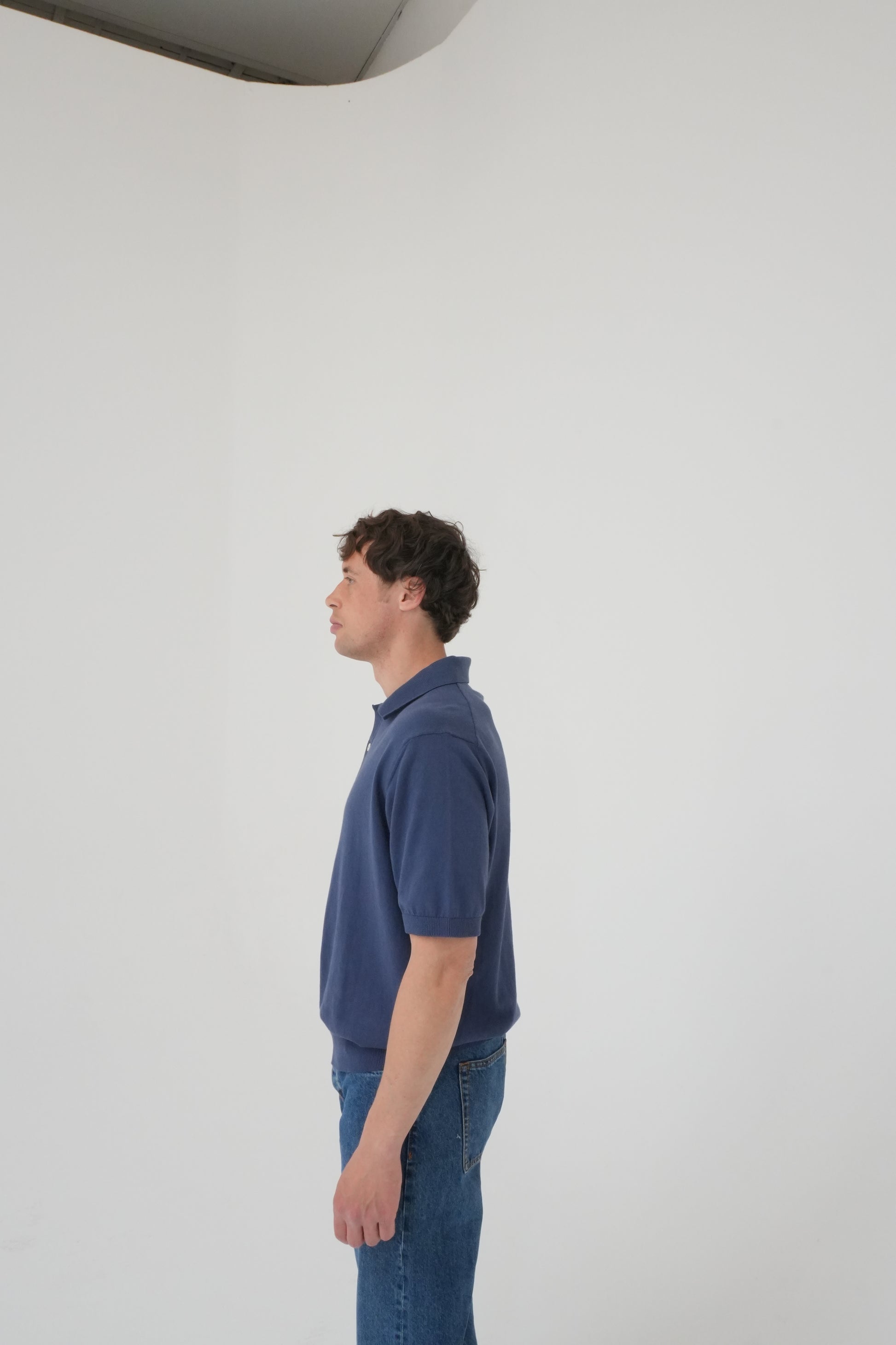 A clean lightly knitted short-sleeved polo shirt. Works for both the warmer days and colder evenings, worn on its own with a pair of jeans or under a coat in colder times.