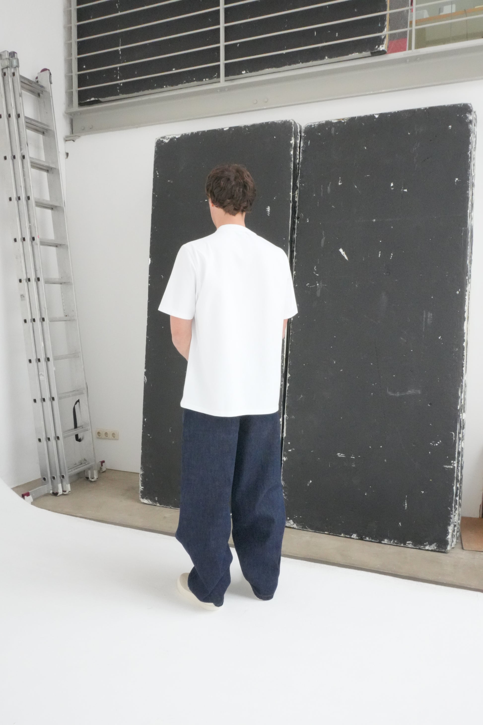 The denim trousers are an everyday pair of pants that feature a woven branded label on the right back pocket. The dark blue denim pair comes in a classic 5-pocket style and has a relaxed, more baggy fit.