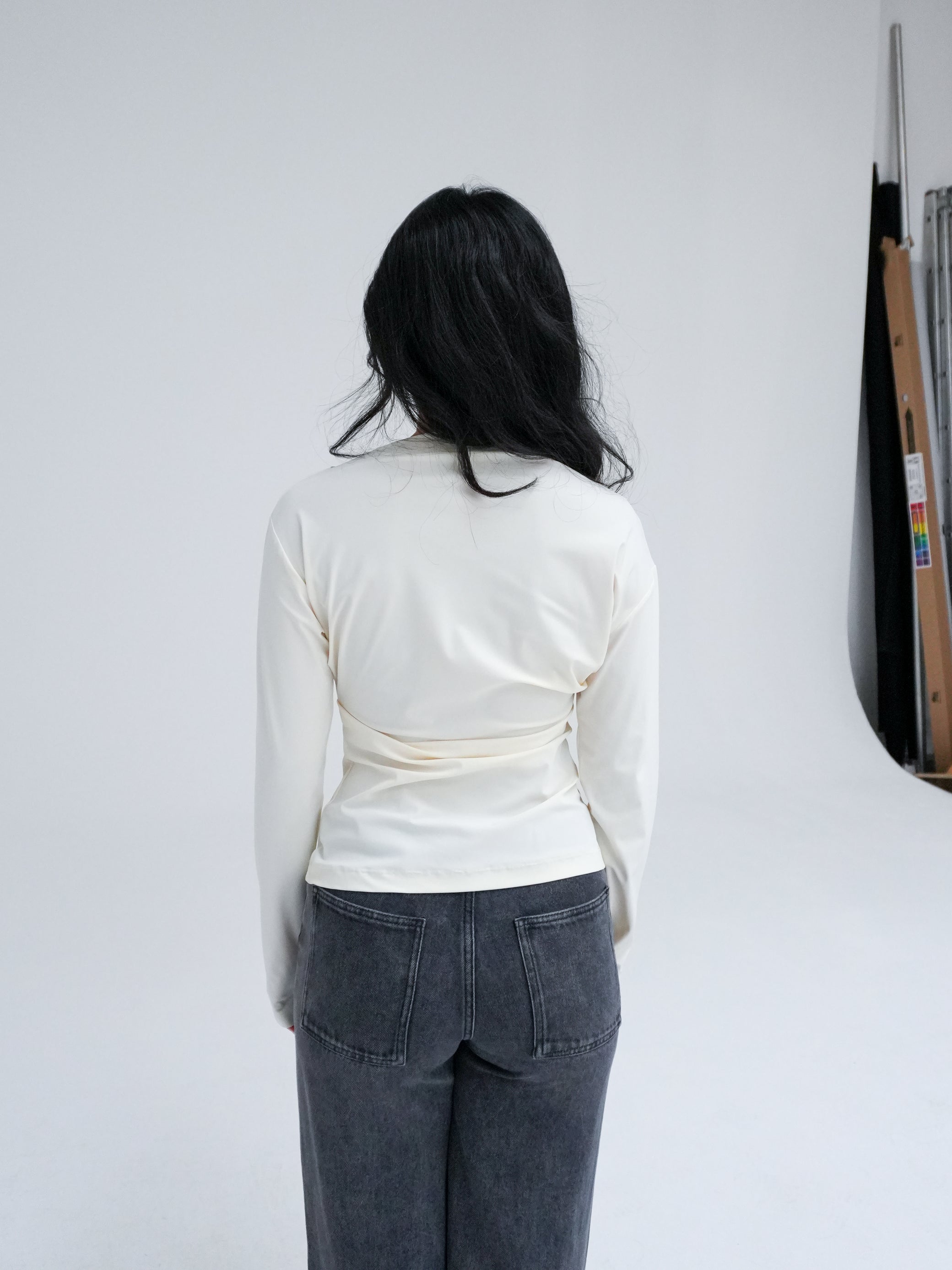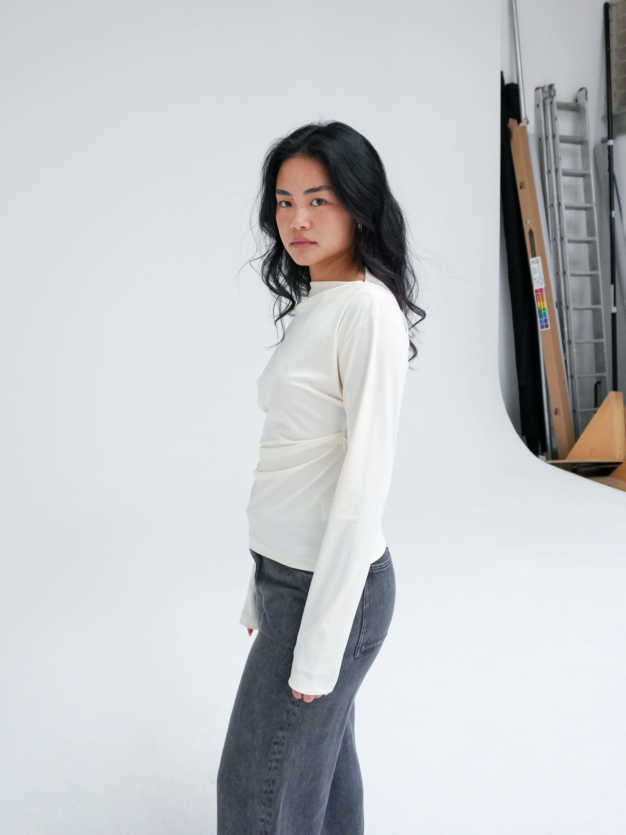 Longsleeve top with an asymmetrical neckline and side waist folds for a sleek, contemporary silhouette. Made from recycled Italian stretch fabric, this top is a classic and versatile wardrobe essential. Wear it with our Side-split midi skirt for an elevated look.