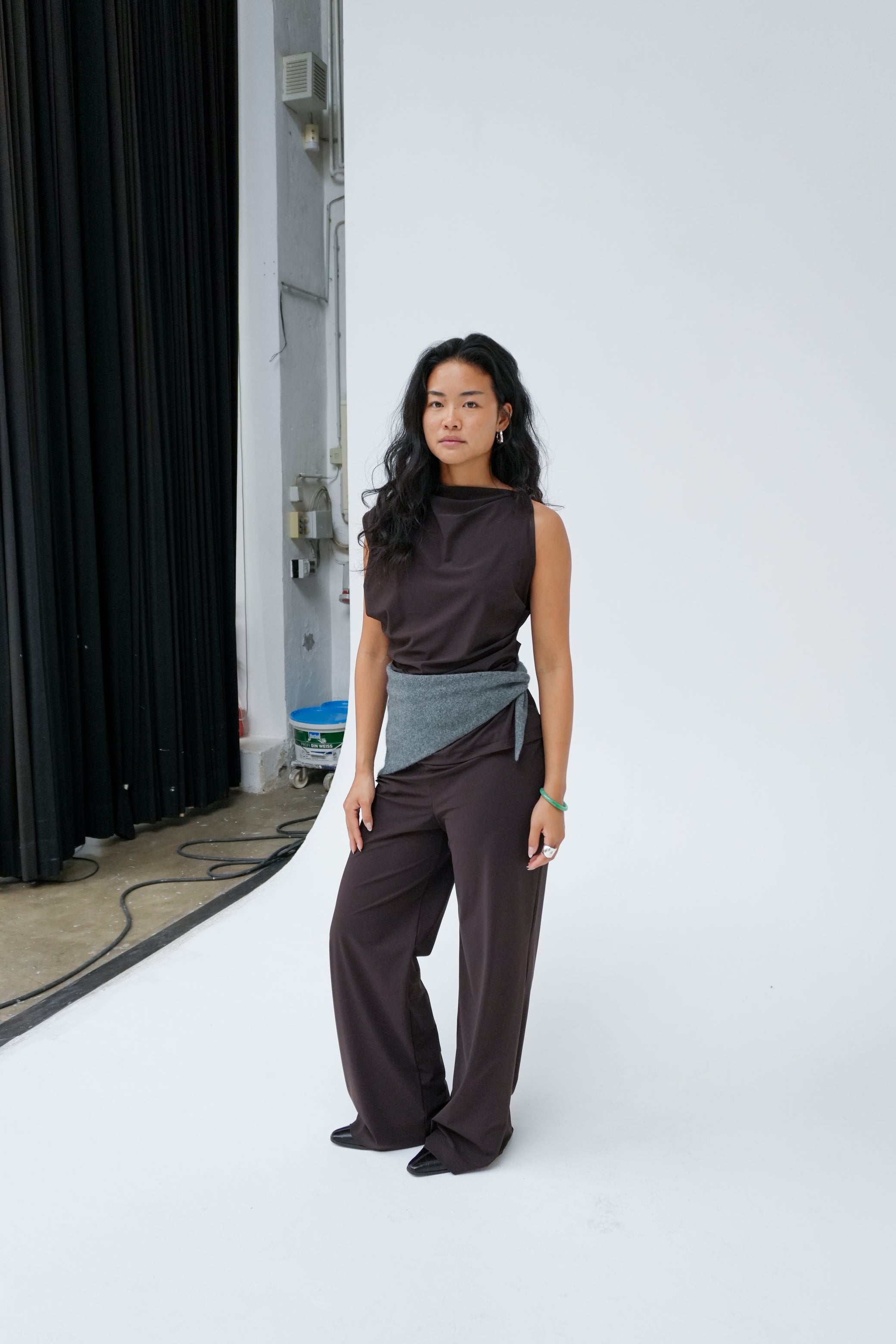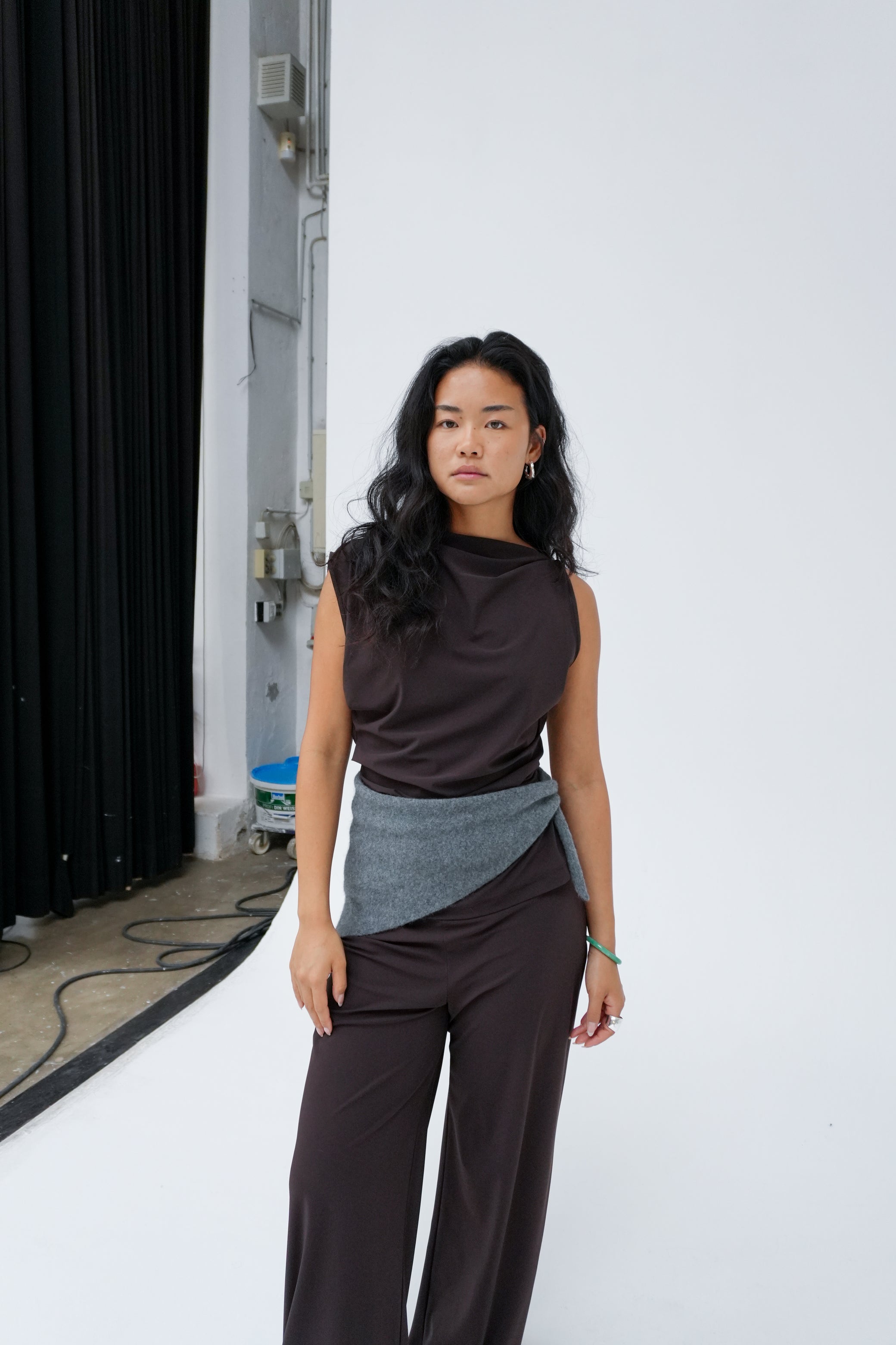 Sleeveless top with an asymmetrical neckline and side waist folds for a sleek, contemporary silhouette. Made from recycled Italian stretch fabric, this top is a classic and versatile wardrobe essential. Wear it with our Side-split midi skirt for an elevated look.