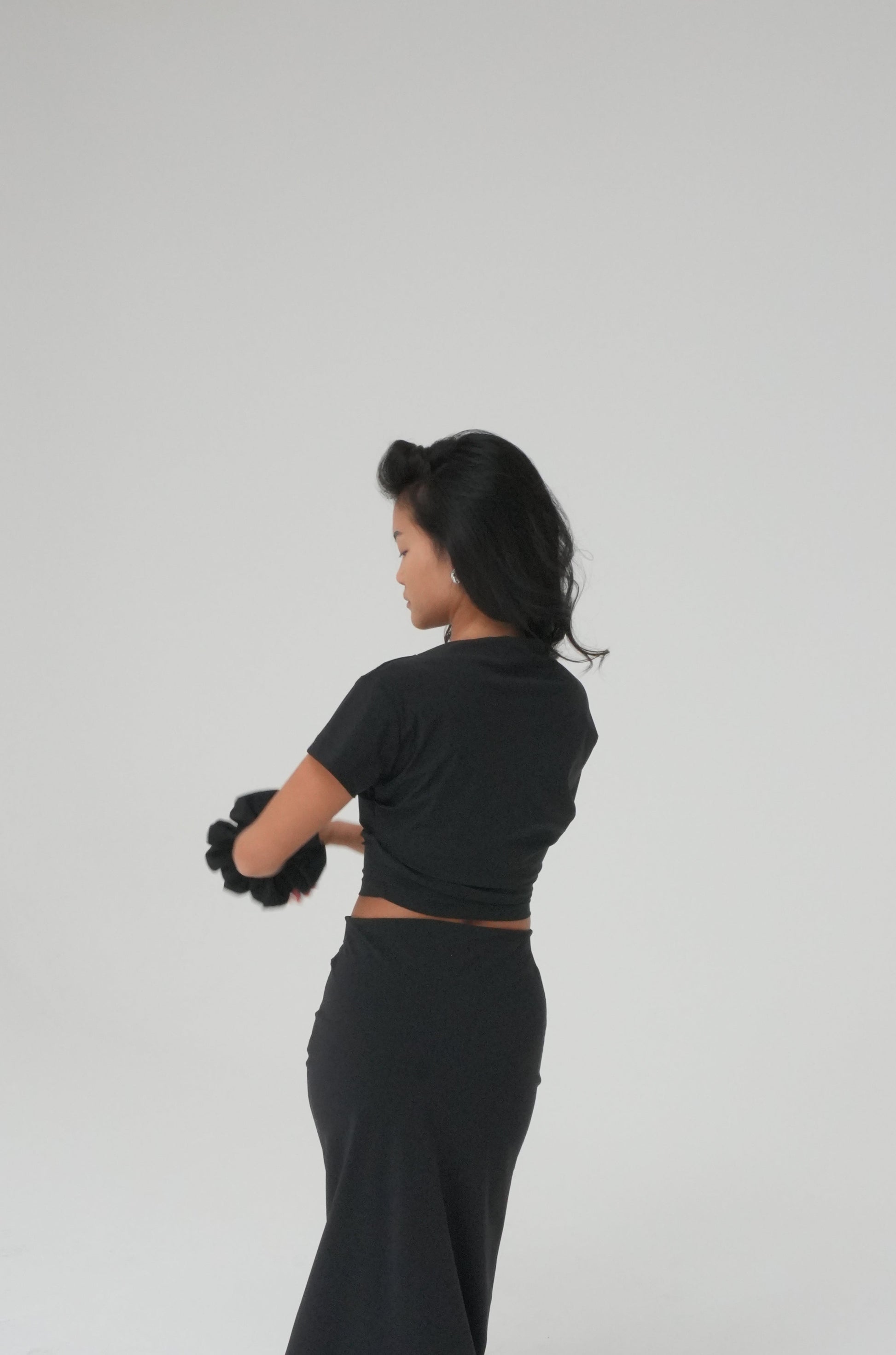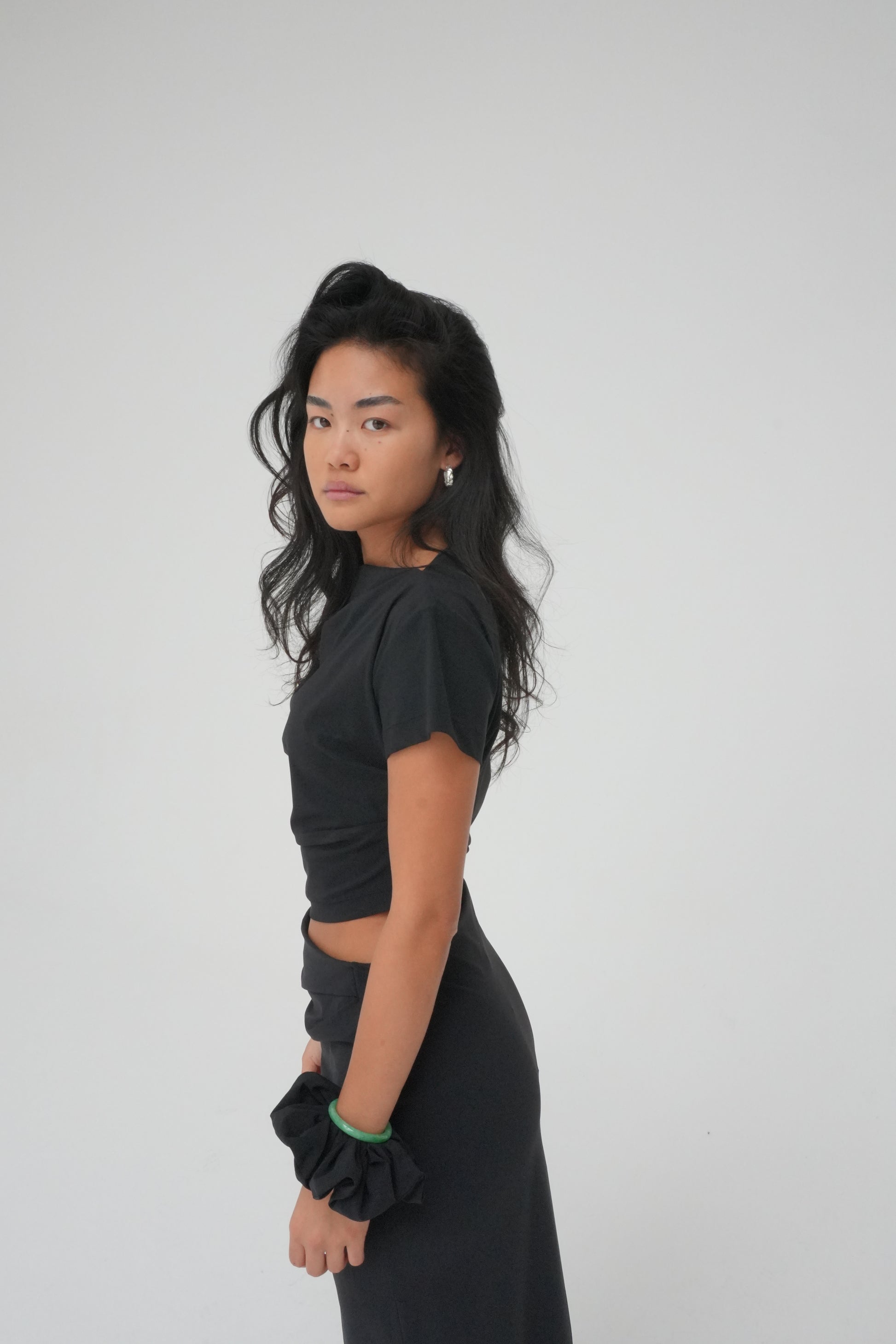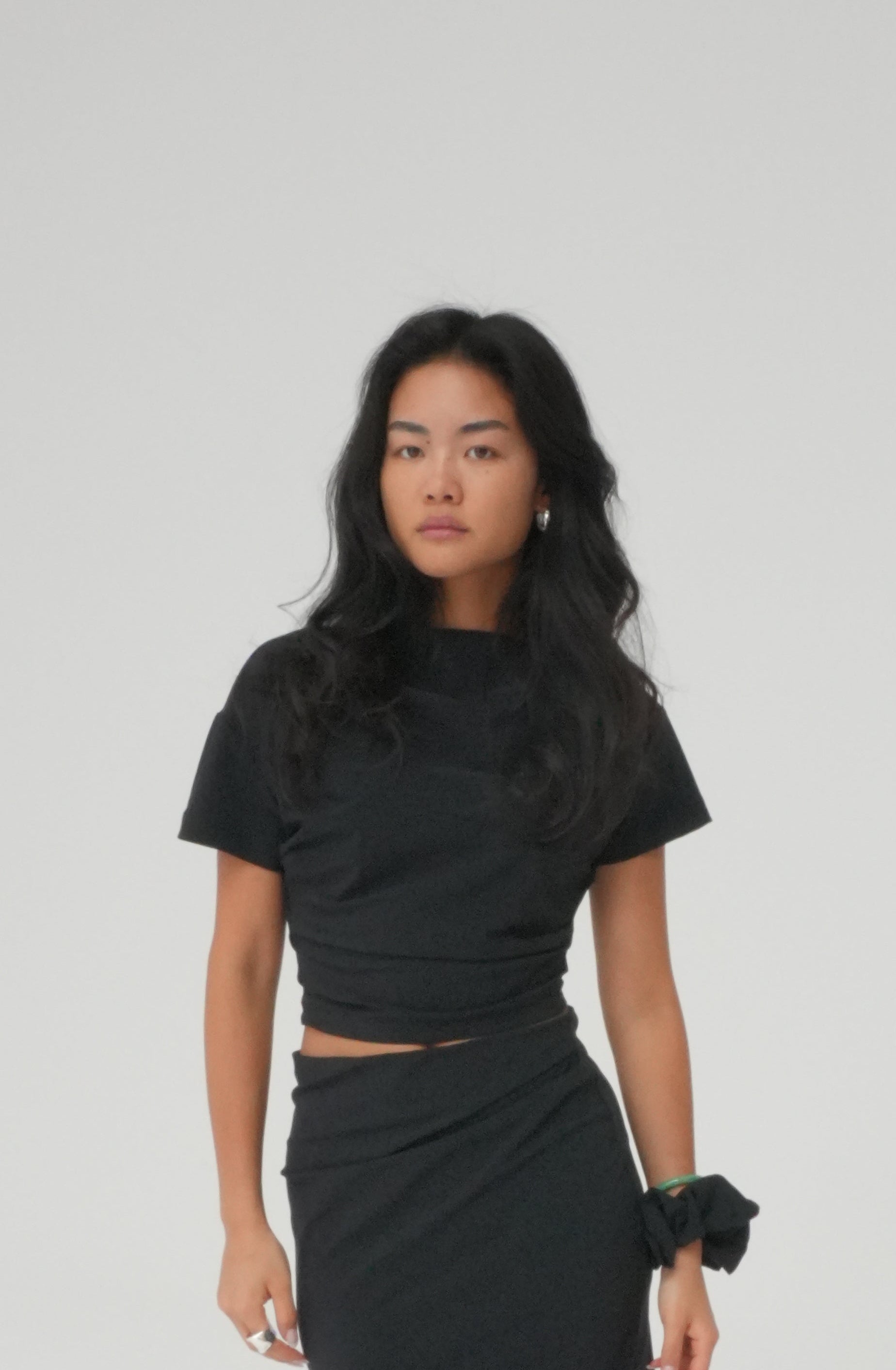 Cropped top featuring an asymmetrical neckline and side waist folds, creating a gentle gathered effect along the waistline. Made from recycled Italian stretch fabric for a comfortable fit. Pair it with our Side-split midi skirt for a versatile set perfect for any occasion.