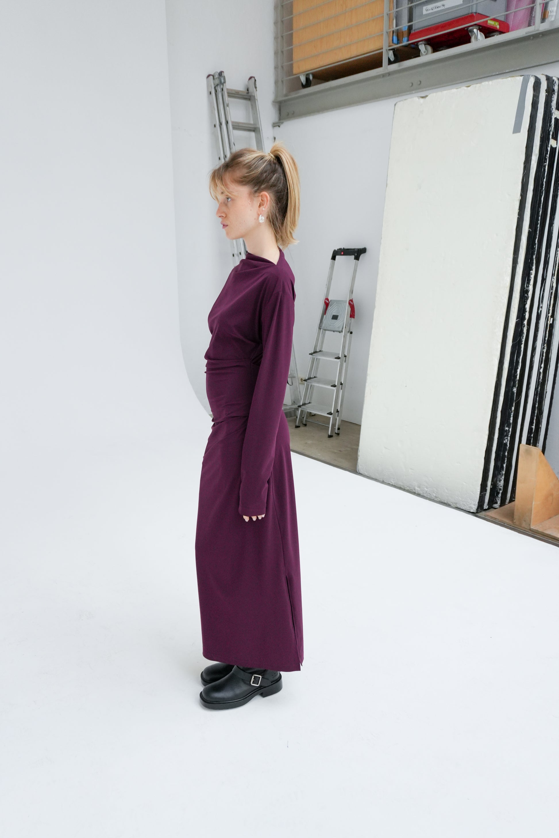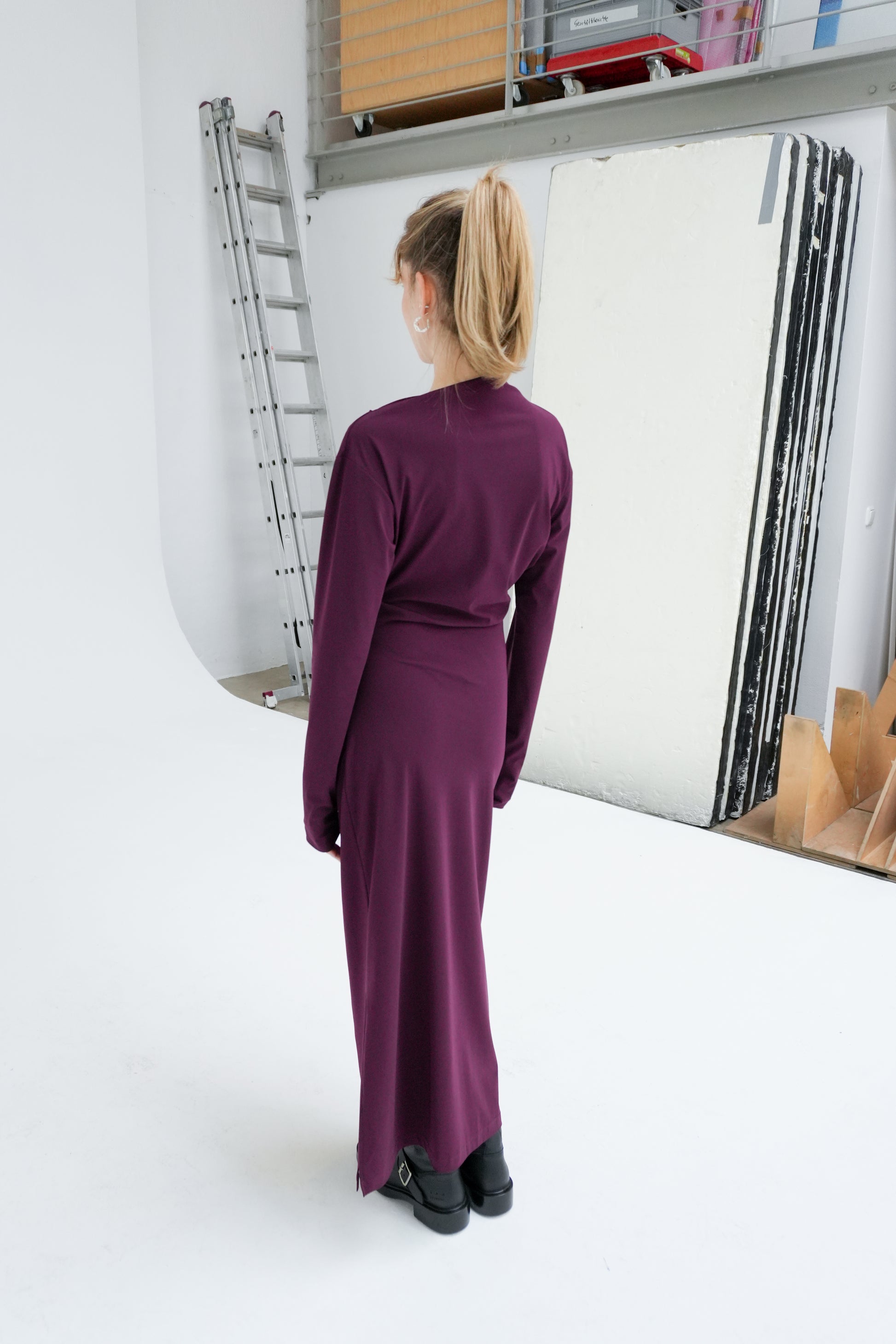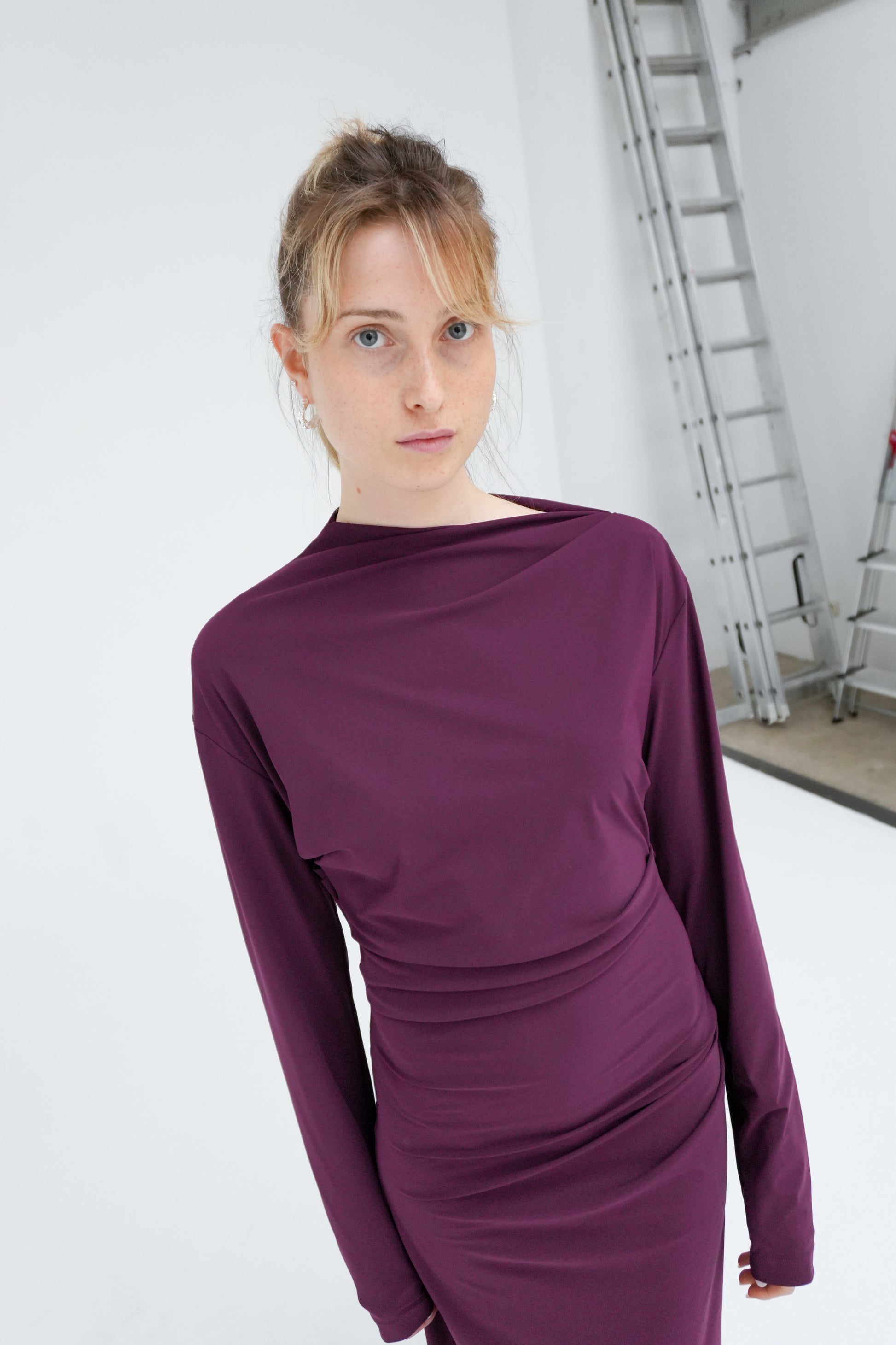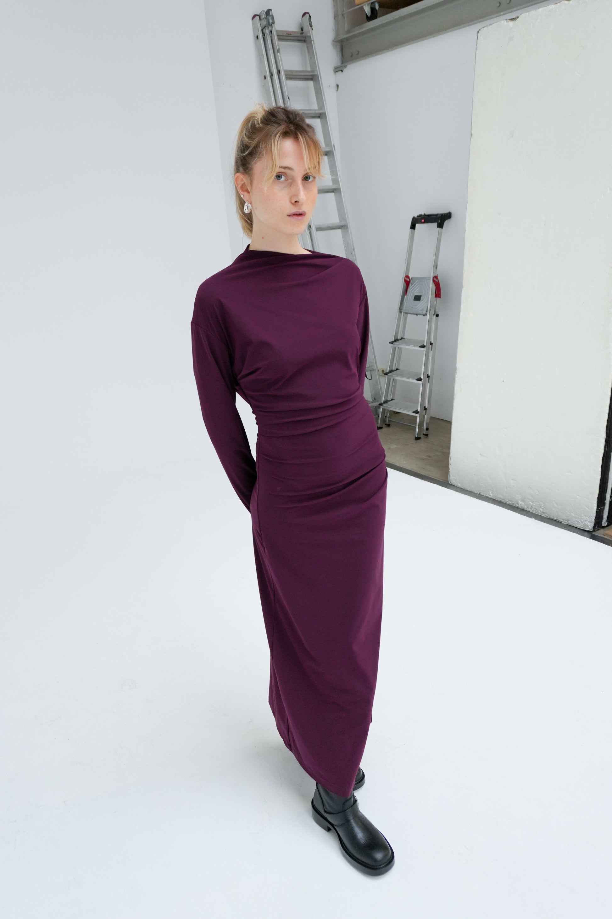 Longsleeve midi dress with an asymmetrical neckline and subtle side waist folds for a flattering, modern fit. Finished with a discreet side slit for ease of movement. Made in recycled Italian stretch fabric, selected for its durability, fluid drape, and responsible production. A timeless, versatile piece that pairs effortlessly with heels for an elevated look.
