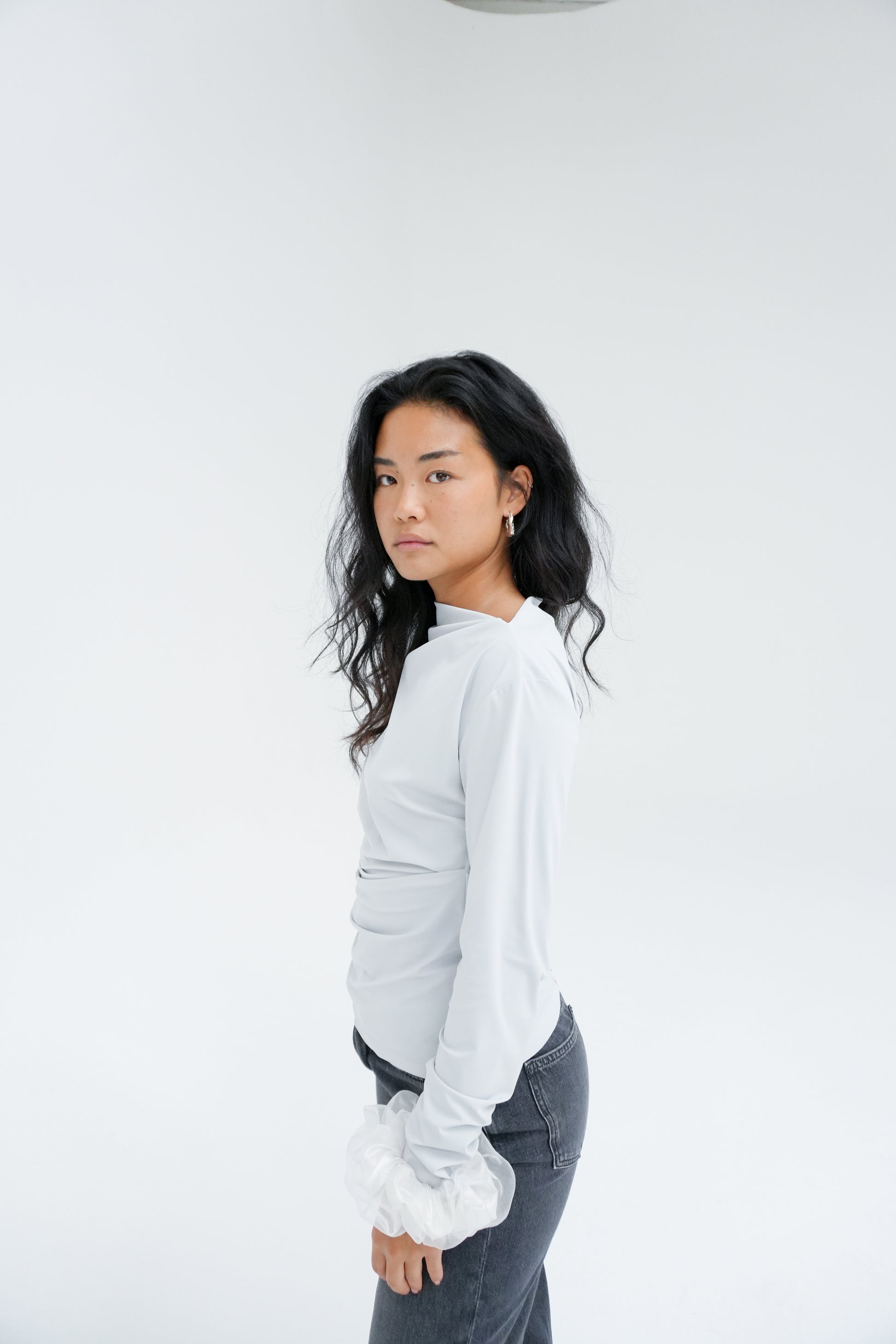 Longsleeve top with an asymmetrical neckline and side waist folds for a sleek, contemporary silhouette. Made from recycled Italian stretch fabric, this top is a classic and versatile wardrobe essential. Wear it with our Side-split midi skirt for an elevated look.