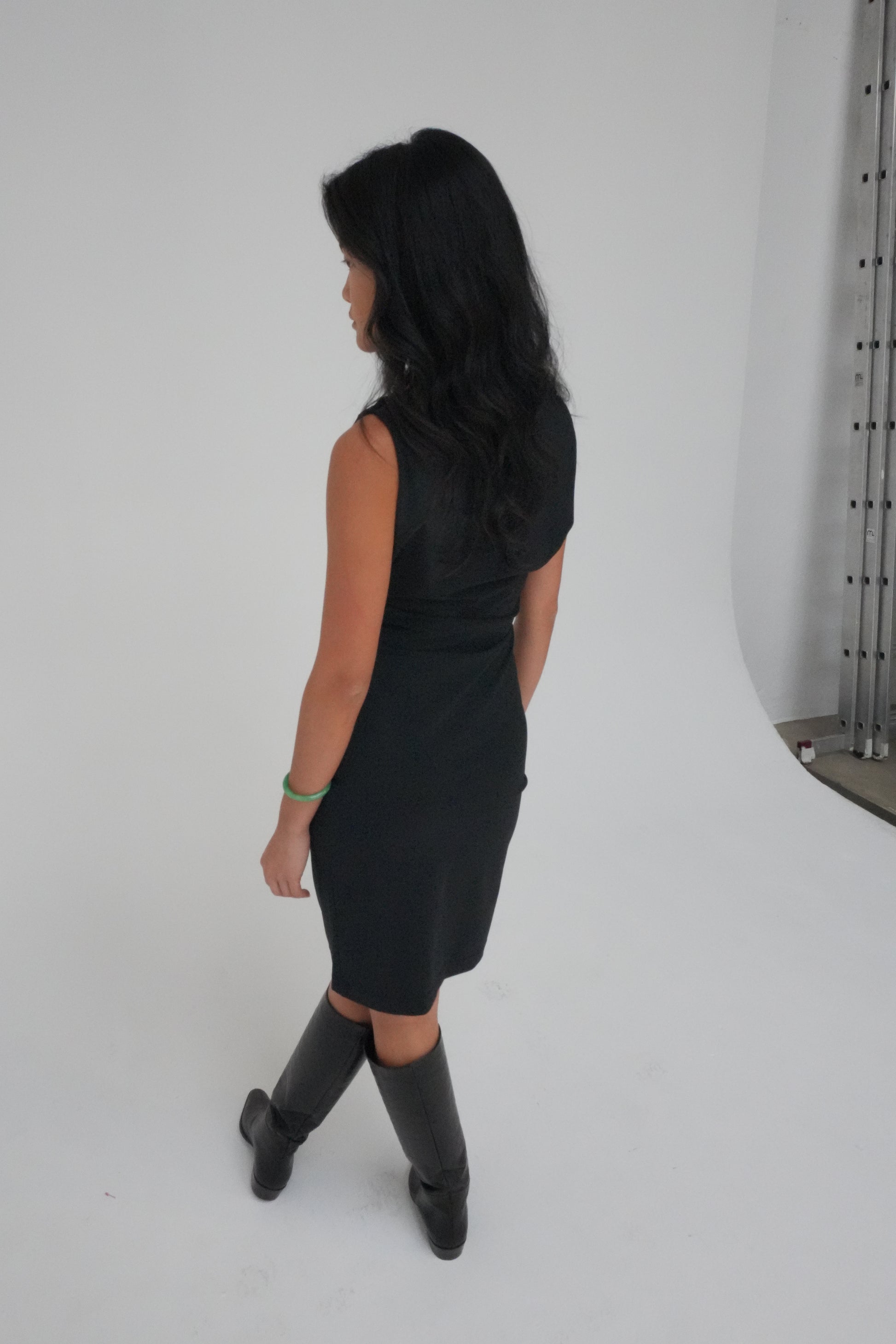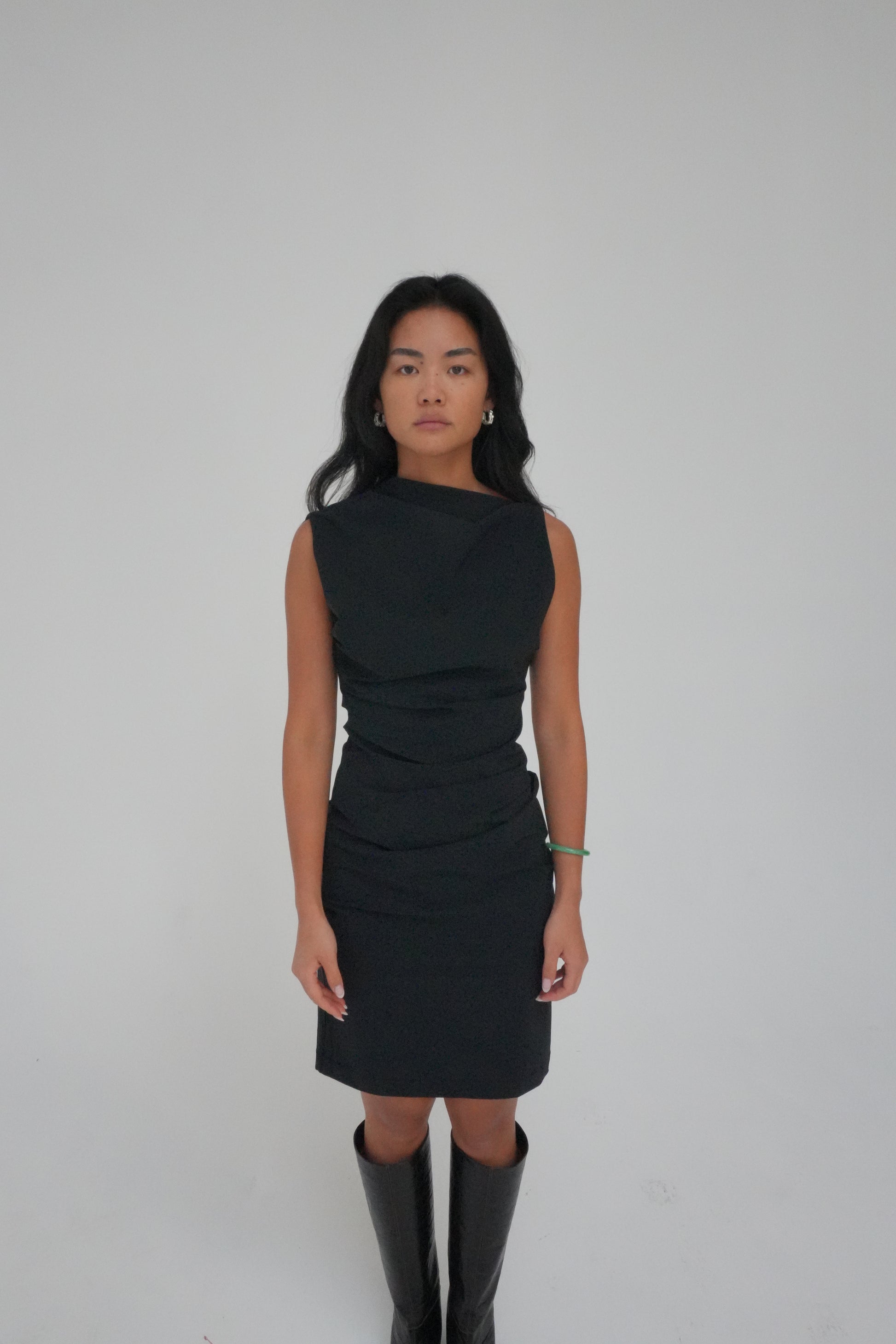 Sleeveless mini dress with an asymmetrical neckline and side waist folds for a flattering, modern fit. Made from recycled Italian stretch fabric, this dress is a timeless and versatile wardrobe essential. Wear it with heels for a chic dinner with friends.