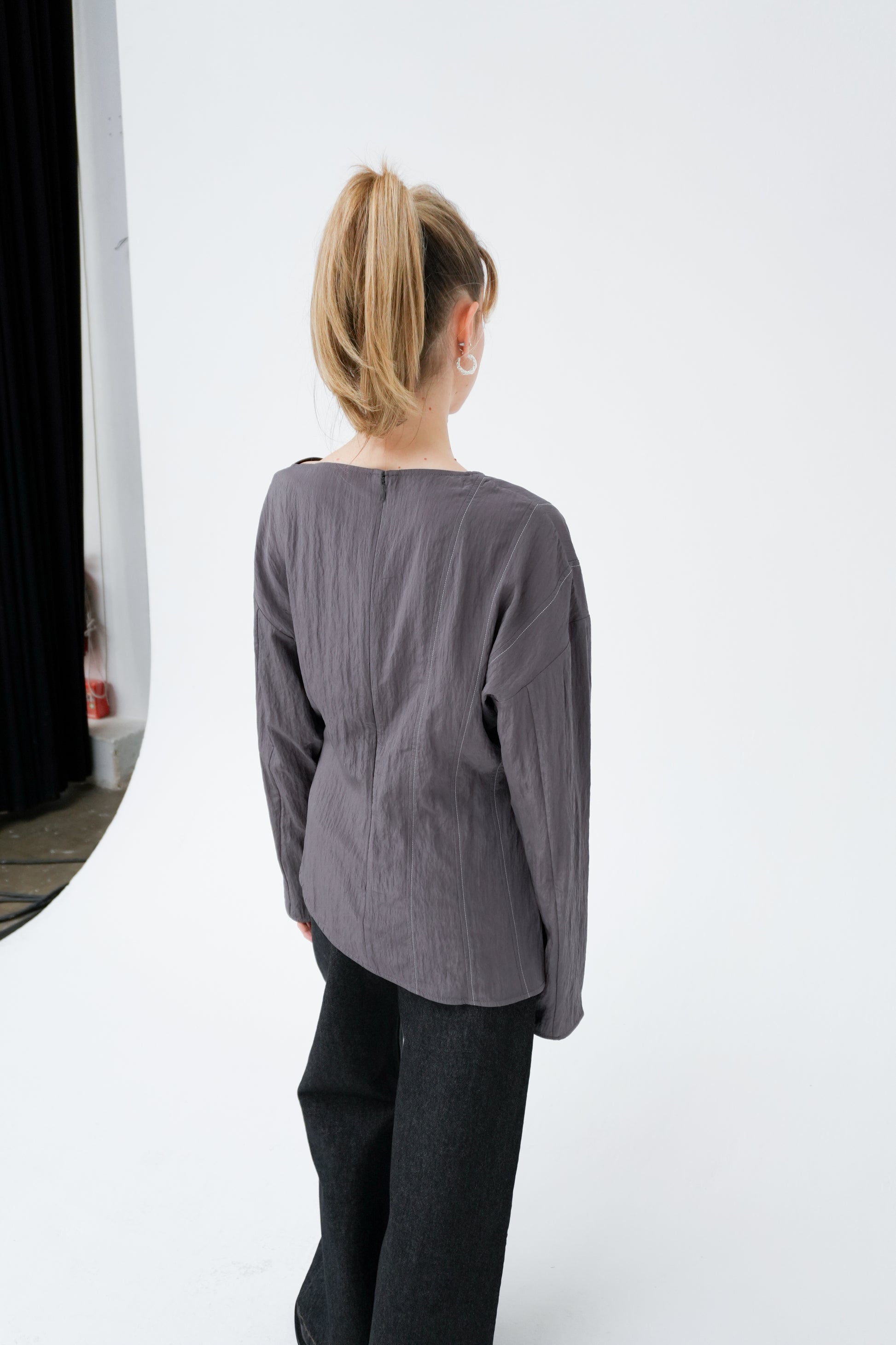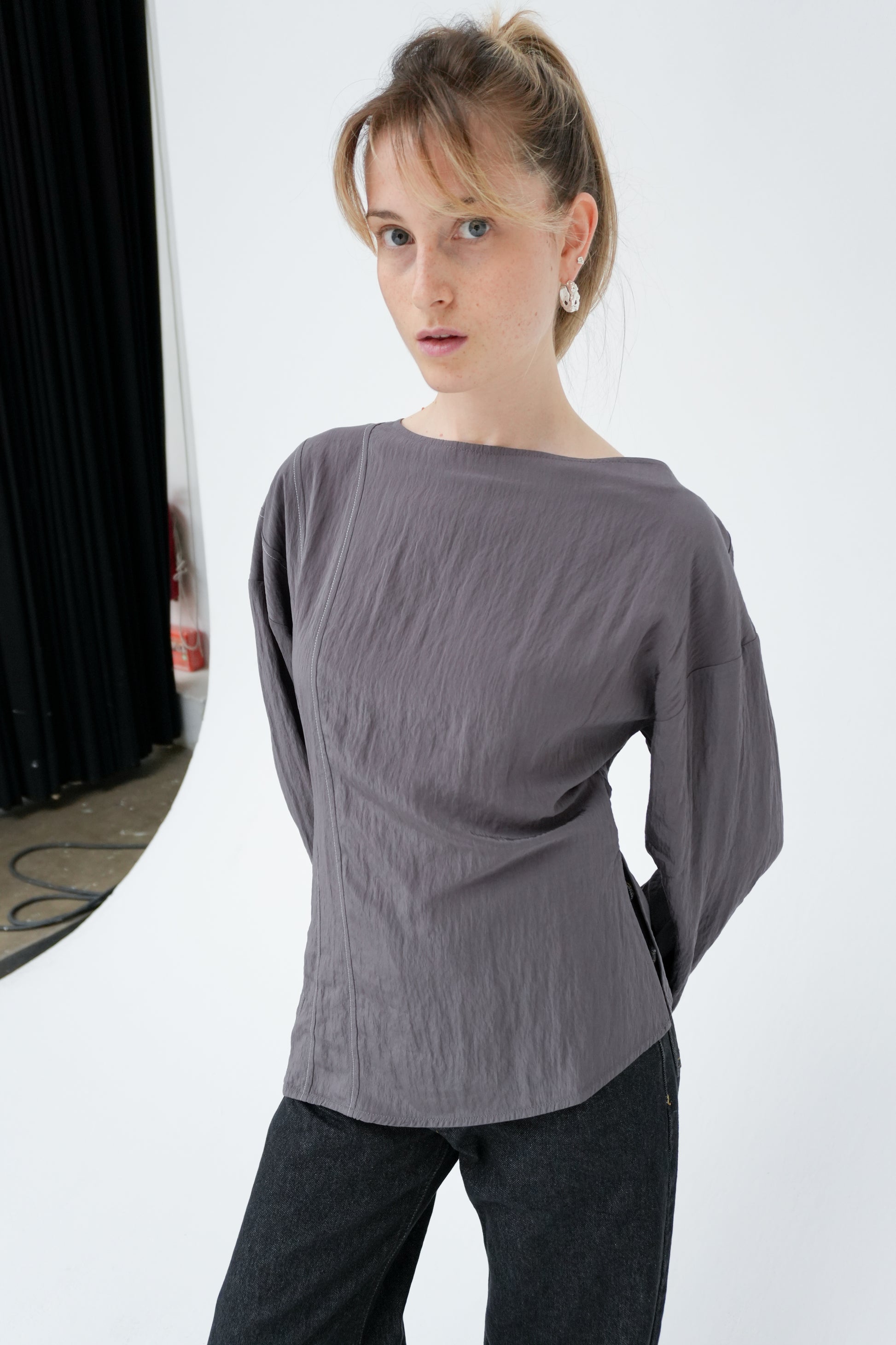 Light shirt with an asymmetrical look. On left side with cutlines that follows the shape of the body with contrast stitches and right side with a small slit at the waist. Open neck and slightly dropped shoulders.