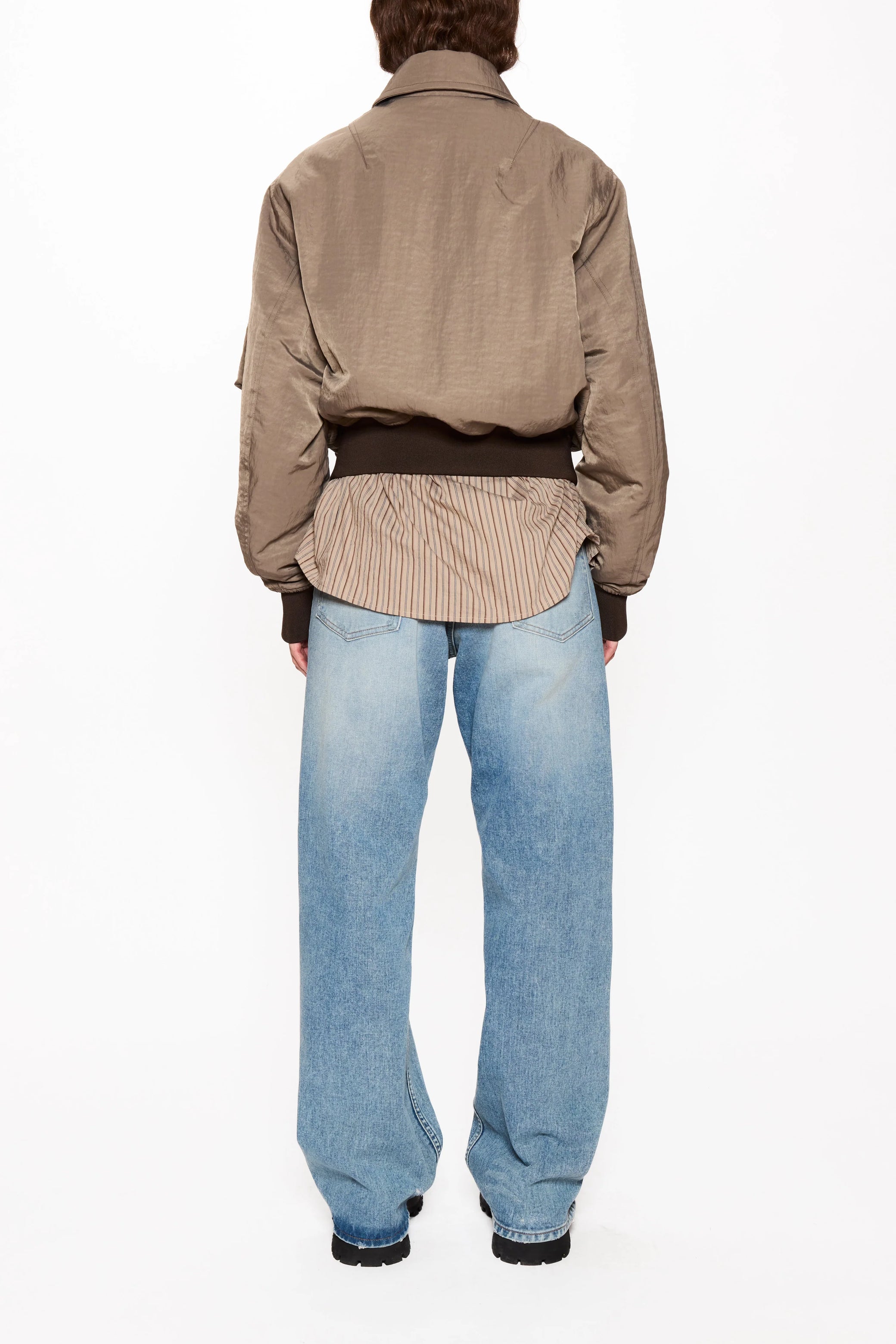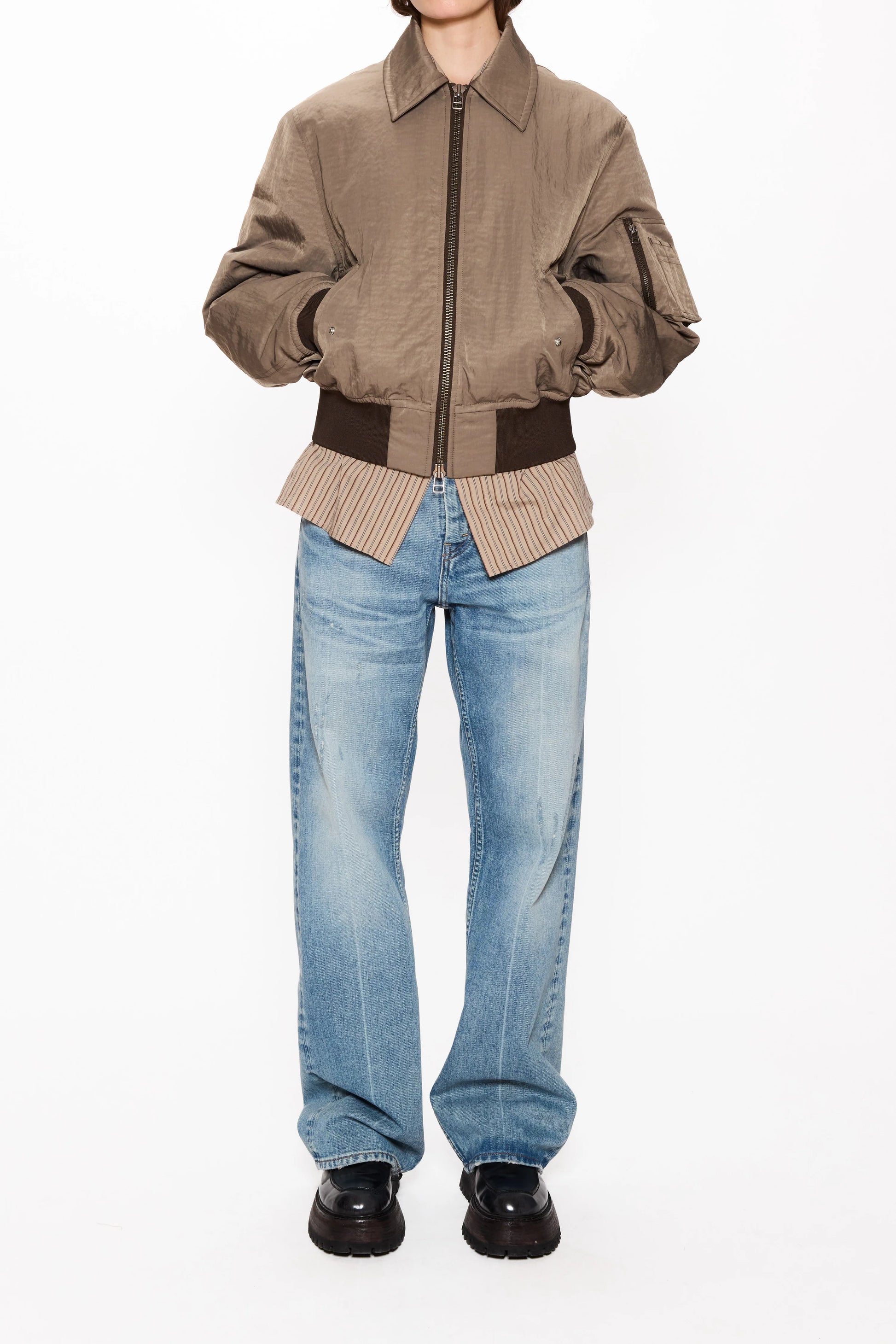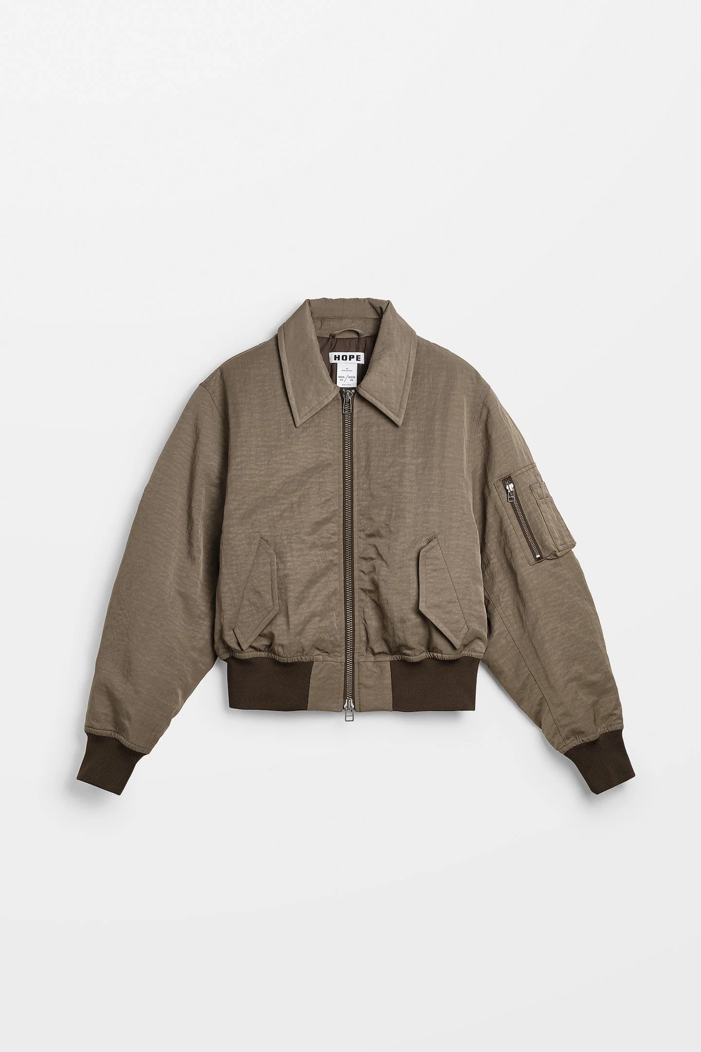 Camp Bomber is a flight jacket with a short body and voluminous sleeves. Crafted from a textured nylon twill with tonally darker details.