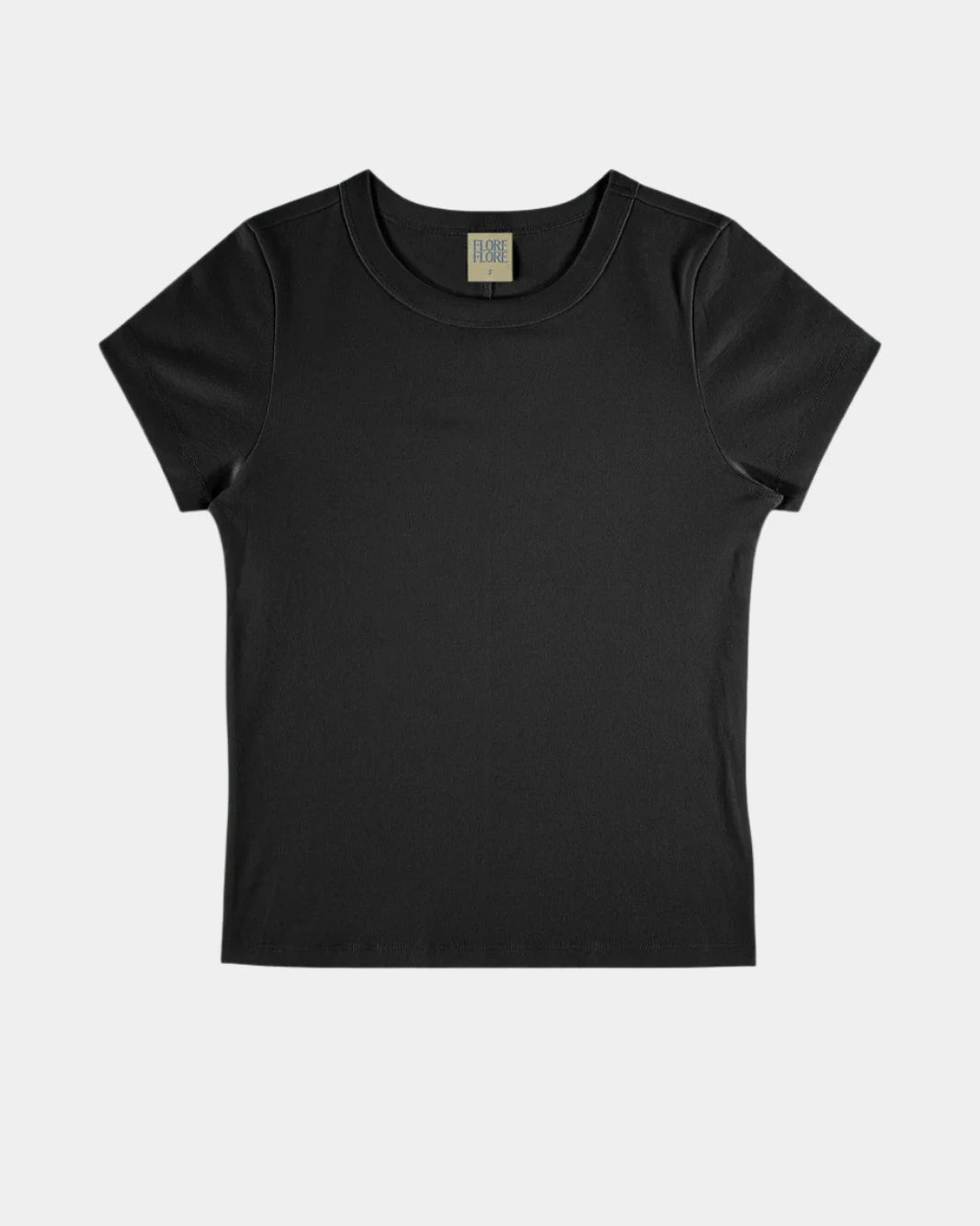 A classic short-sleeved baby tee with a round binding and a cut-off seam along the back, made from medium-weight organic cotton rib.