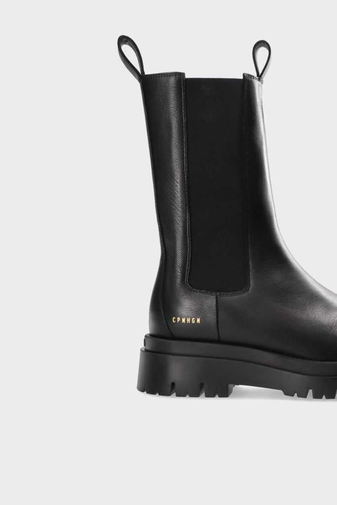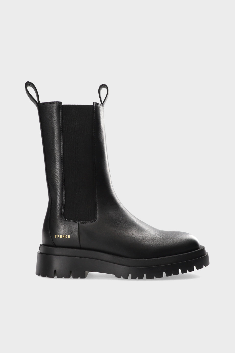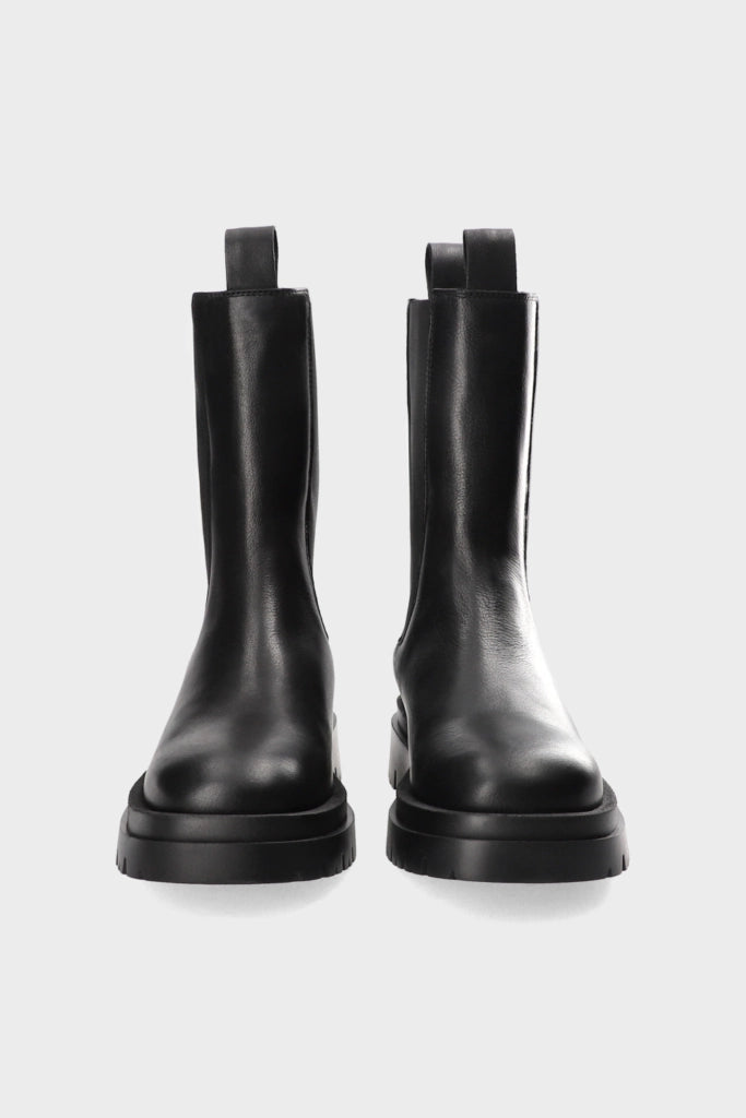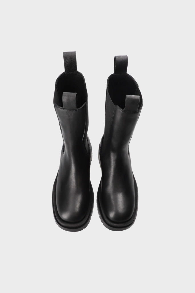 Mid-height Chelsea boots made from soft smooth leather. Slim silhouette. Elastic inserts with embroidered details. Pull loops on the shaft. Gold-colored logo on the outside. Round toe cap. Matt black sole with chunky tread.