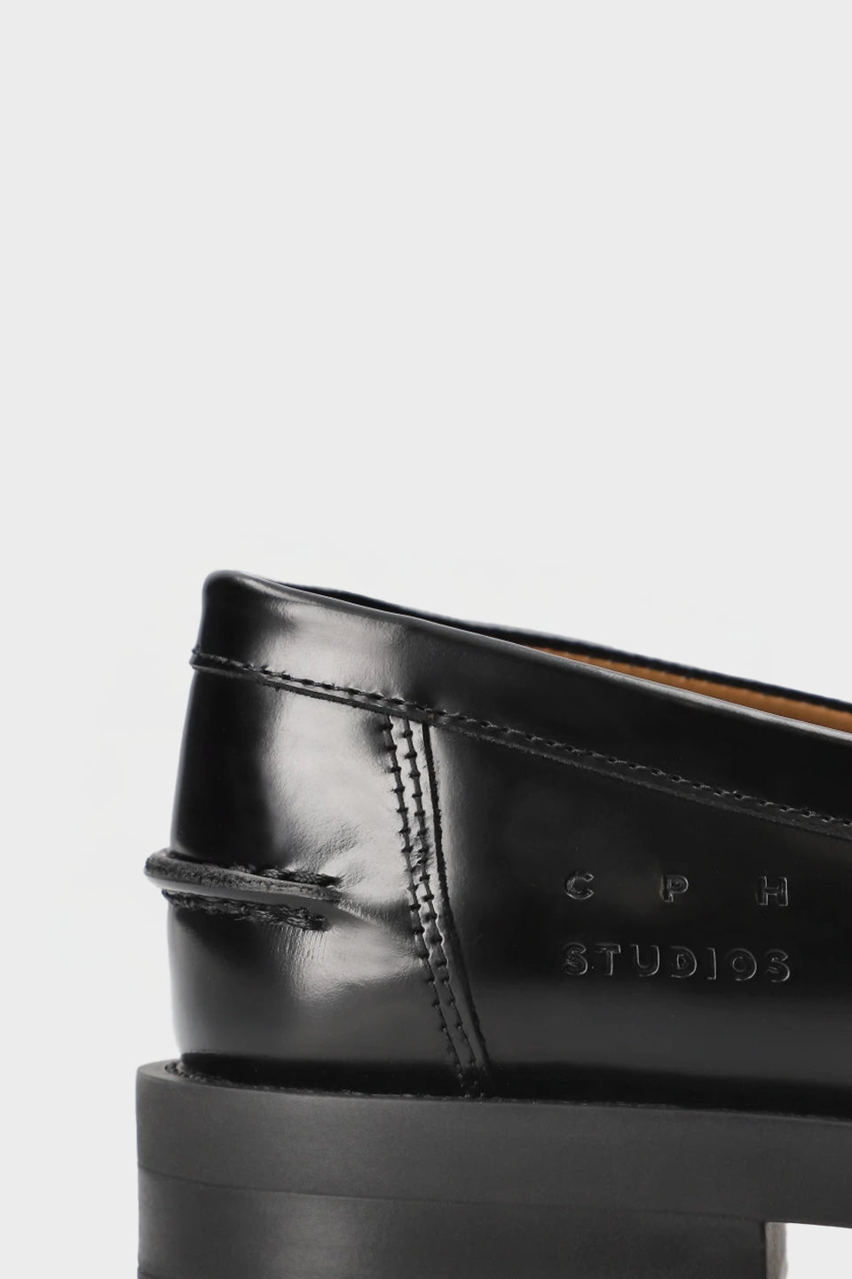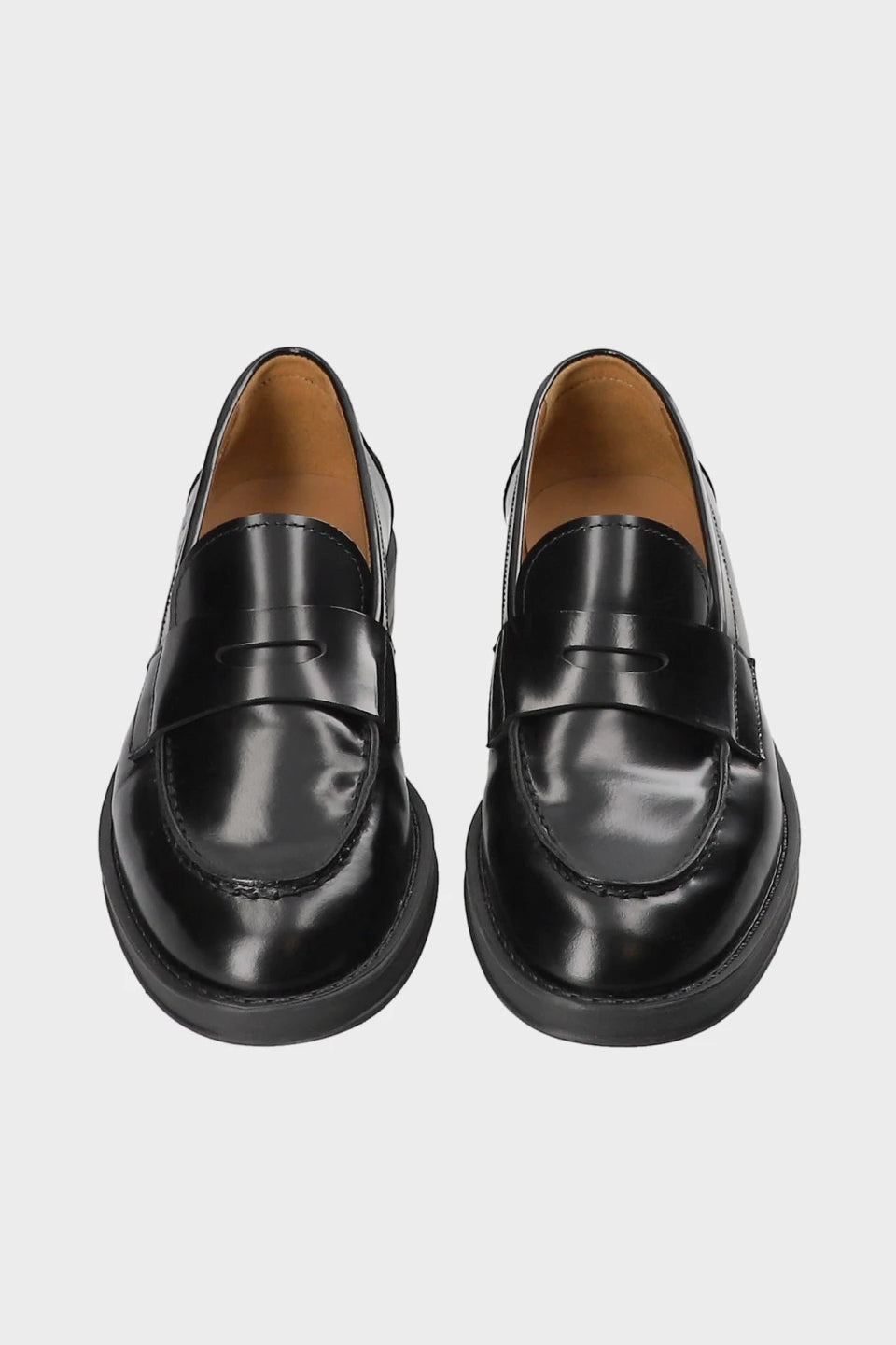In black. Loafers inspired by penny loafers, made of soft smooth leather with a logo on the outside.