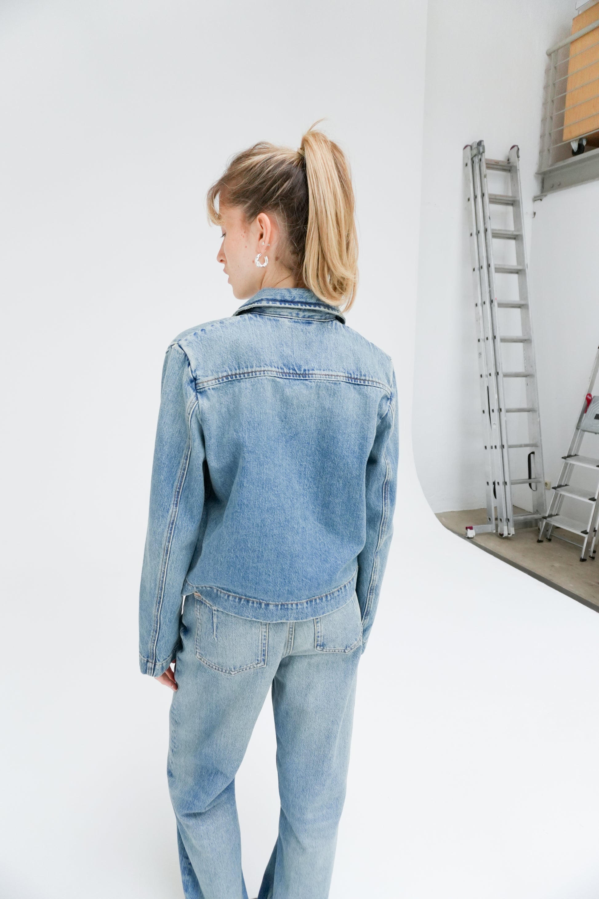 The Dalia 80s Light Blue Denim Jacket offers a small fit with a heavy front zipper closure. It features slanted zipper pockets at the sides, adding a modern touch to this classic piece.