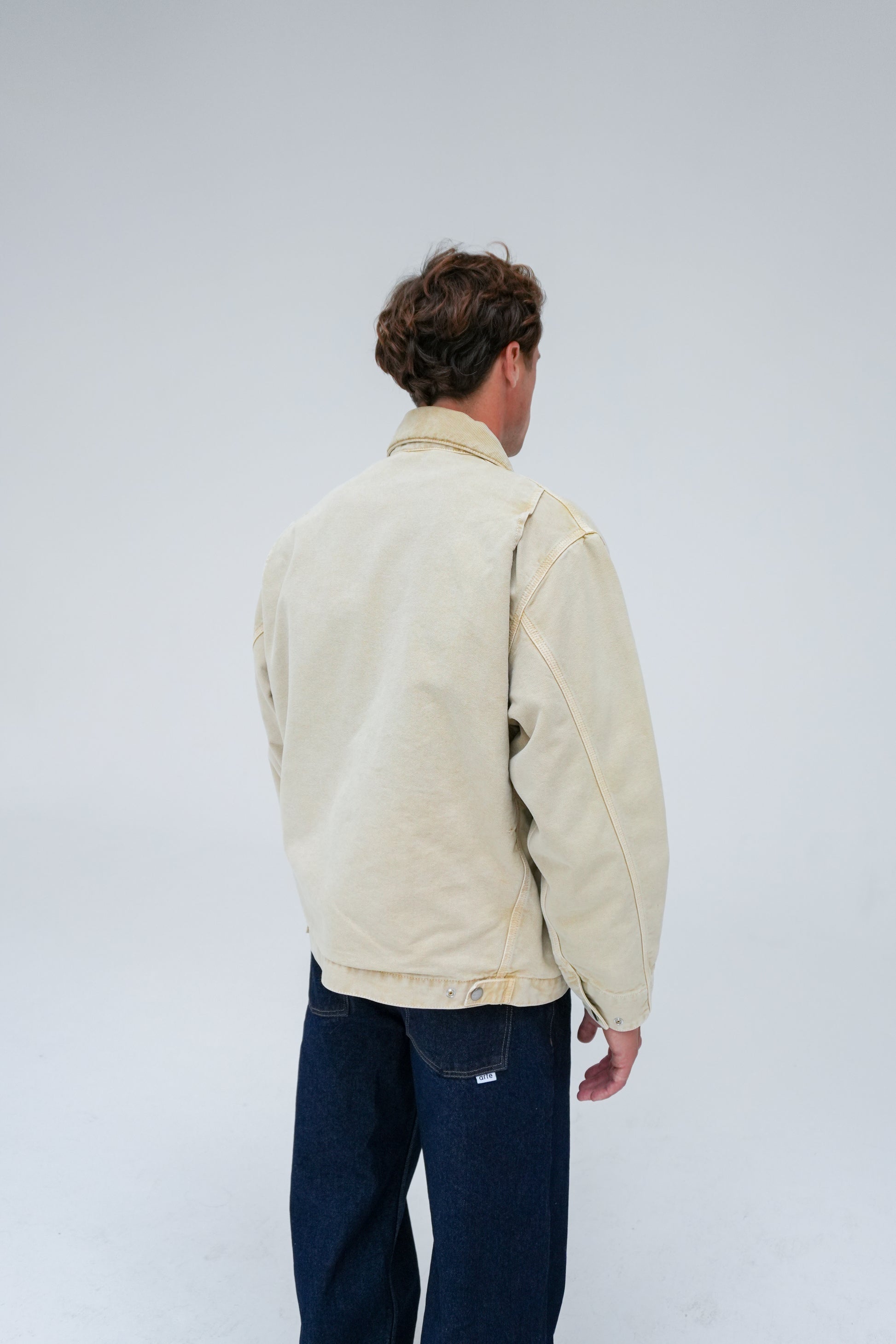 The OG Detroit Jacket is made from lined, heavyweight cotton Dearborn Canvas with a loose fit, which is slightly more boxy and oversized. The item has also undergone a 'chalk wash', offering a sun-faded effect with a strong variation in color on details. A contrasting corduroy collar, two-way front zip, and zipped chest pocket offer tactile detailing. A woven Square Label completes the design.