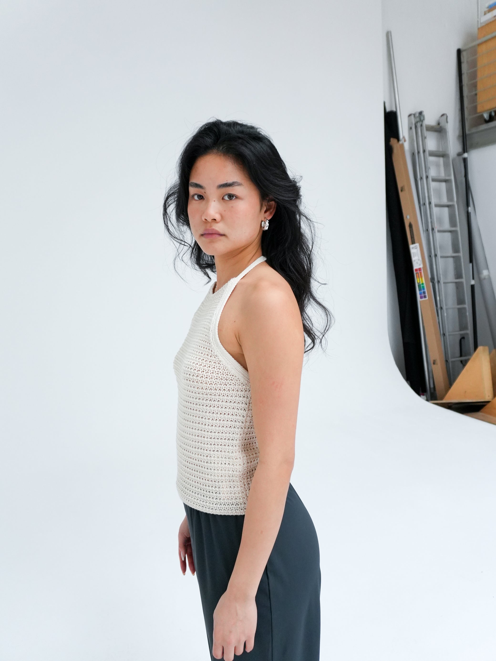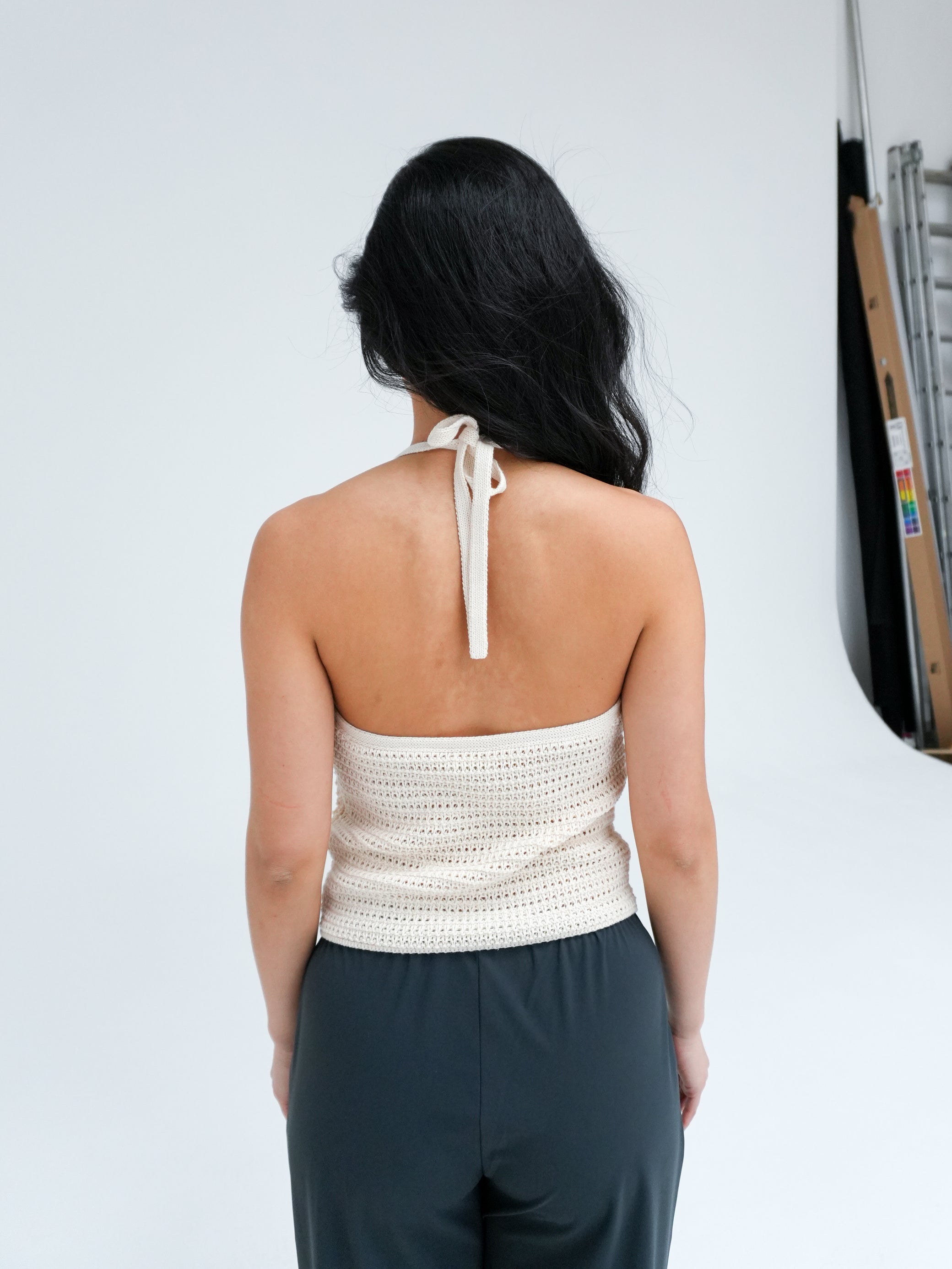 Akwy is a crochet halter neck knit top. The pure cotton gives the top a summery lightness that feels pleasant on the skin.