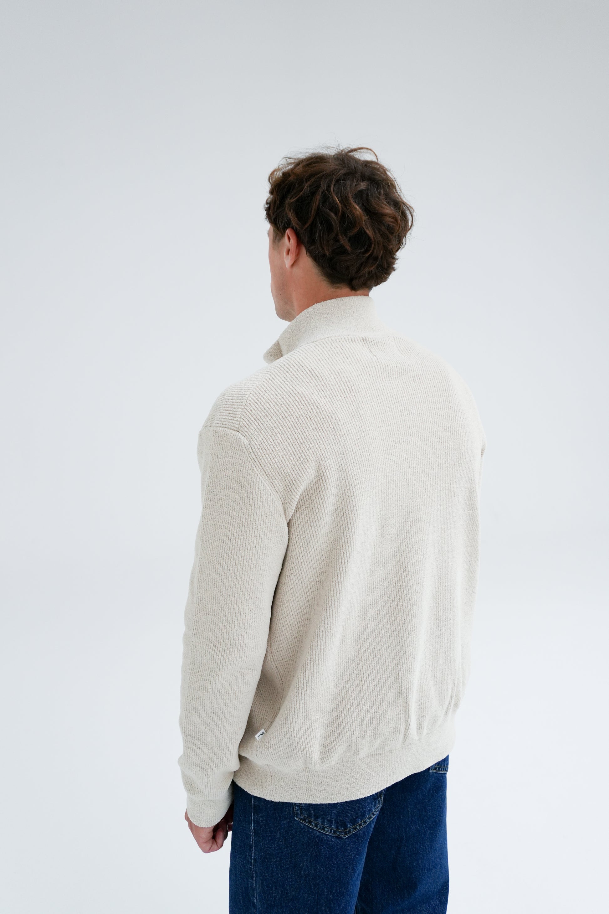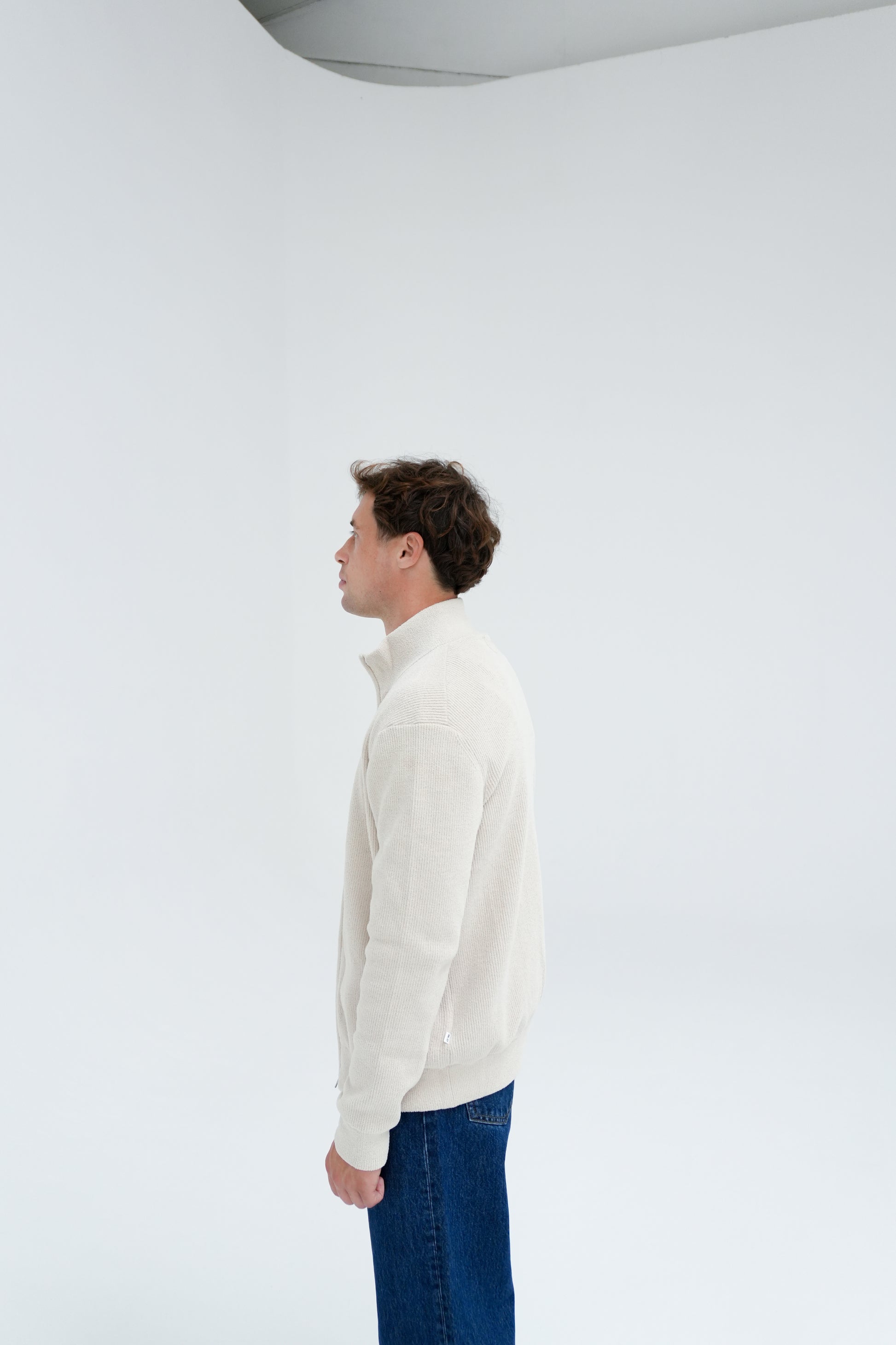Classic ultra-soft full-zip knit made from a polyester rib knit stitch.