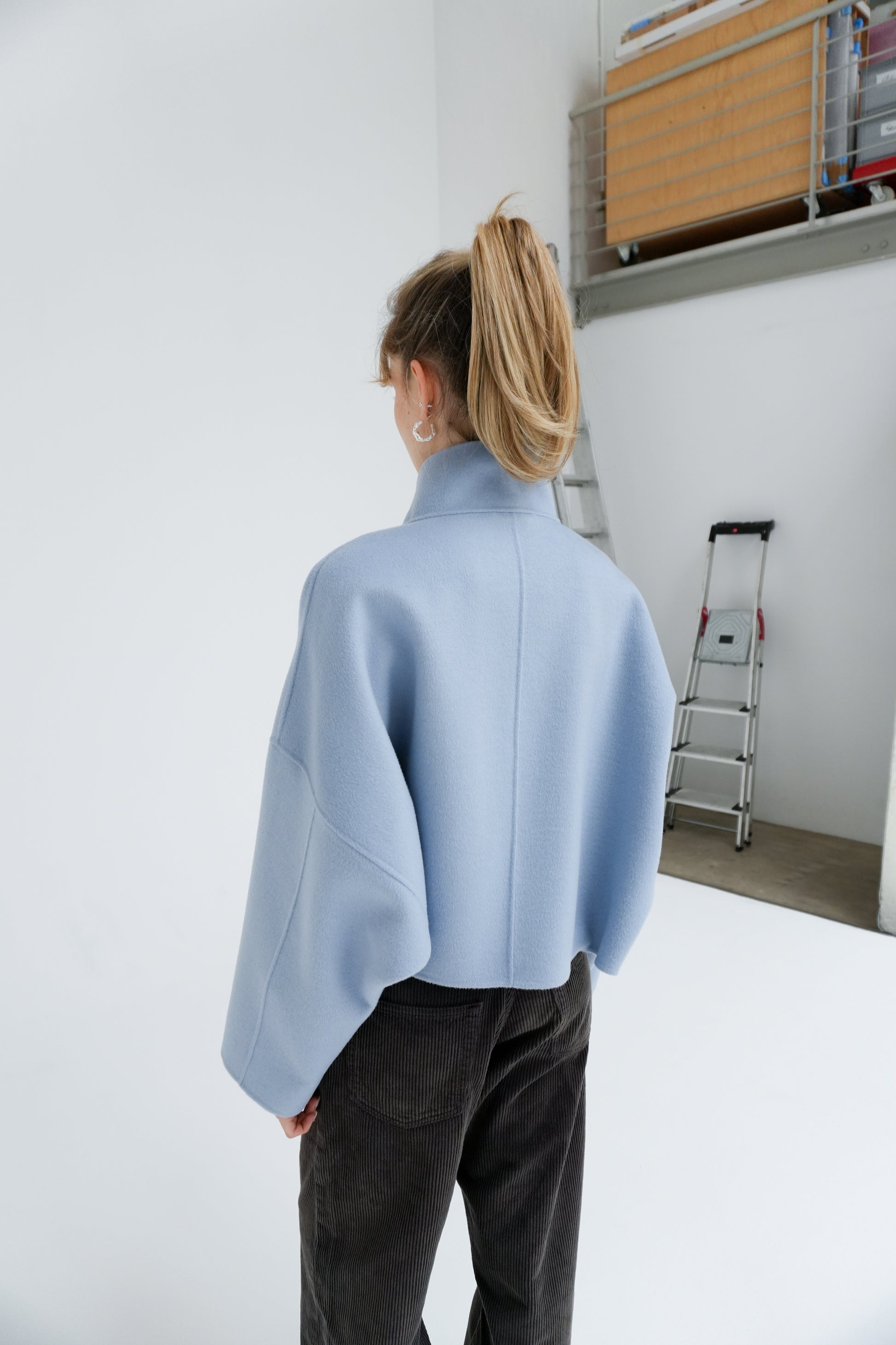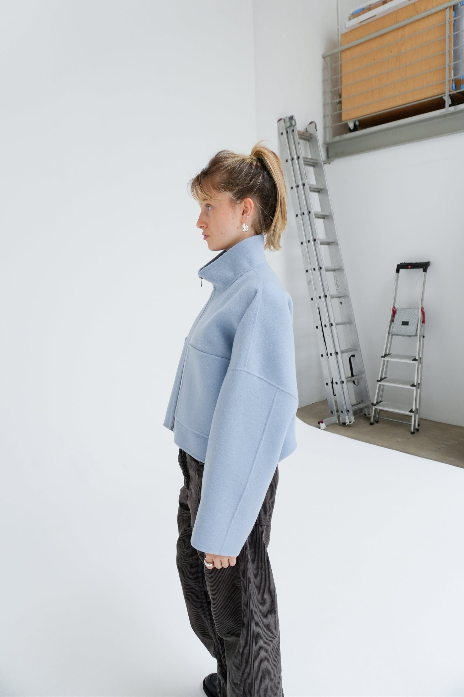 Elstow_1 is a modern jacket with a cropped silhouette and a full-length front zip. The high stand-up collar and large flap pockets emphasise the minimalist design. Dropped shoulders ensure a casual fit. The luxurious double-faced fabric is made from high-quality wool and is warm and comfortable to wear.