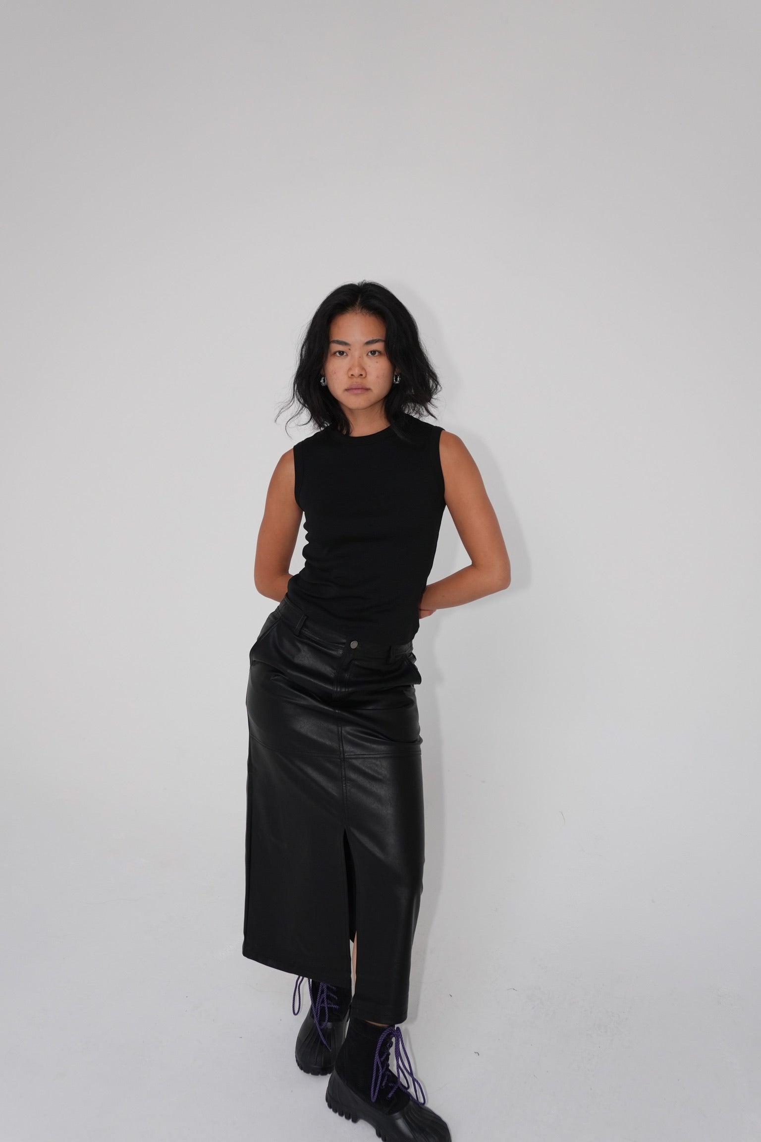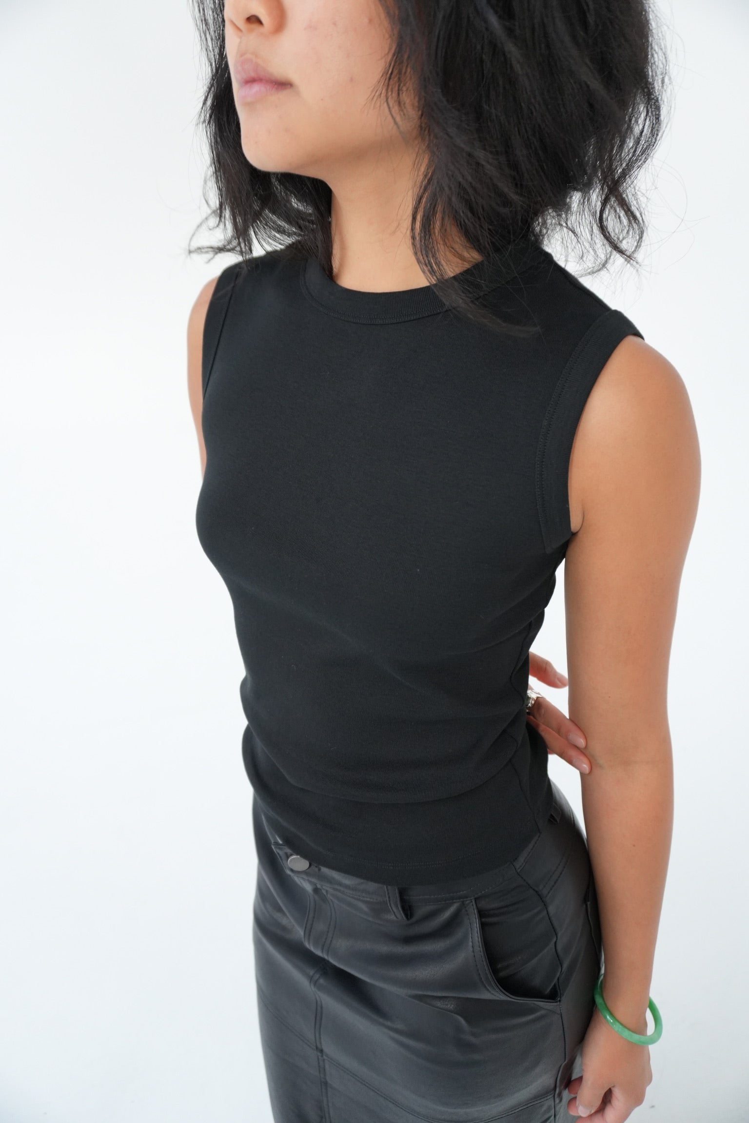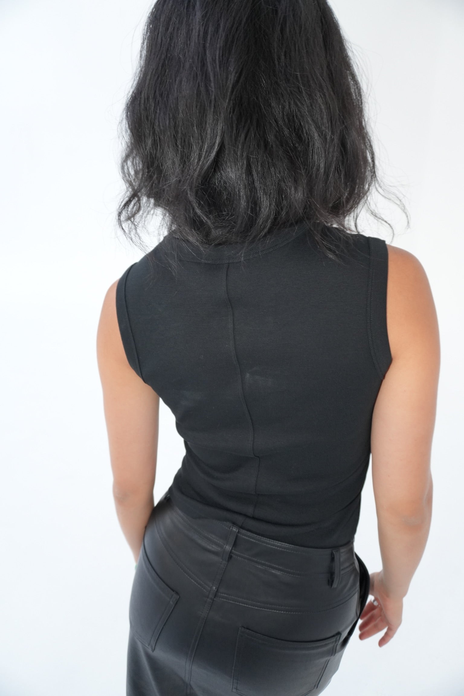 A fitted crew neck tank with a double stitched cut-off seam on the back. It has a banded neck and scooped out armholes for a more modern look.