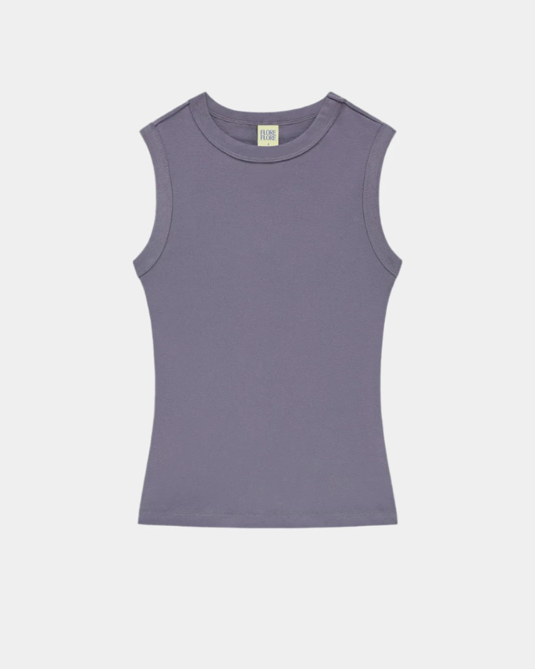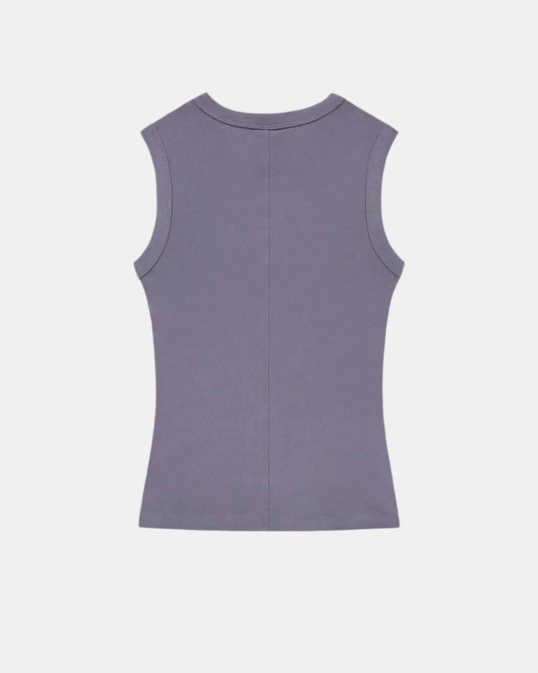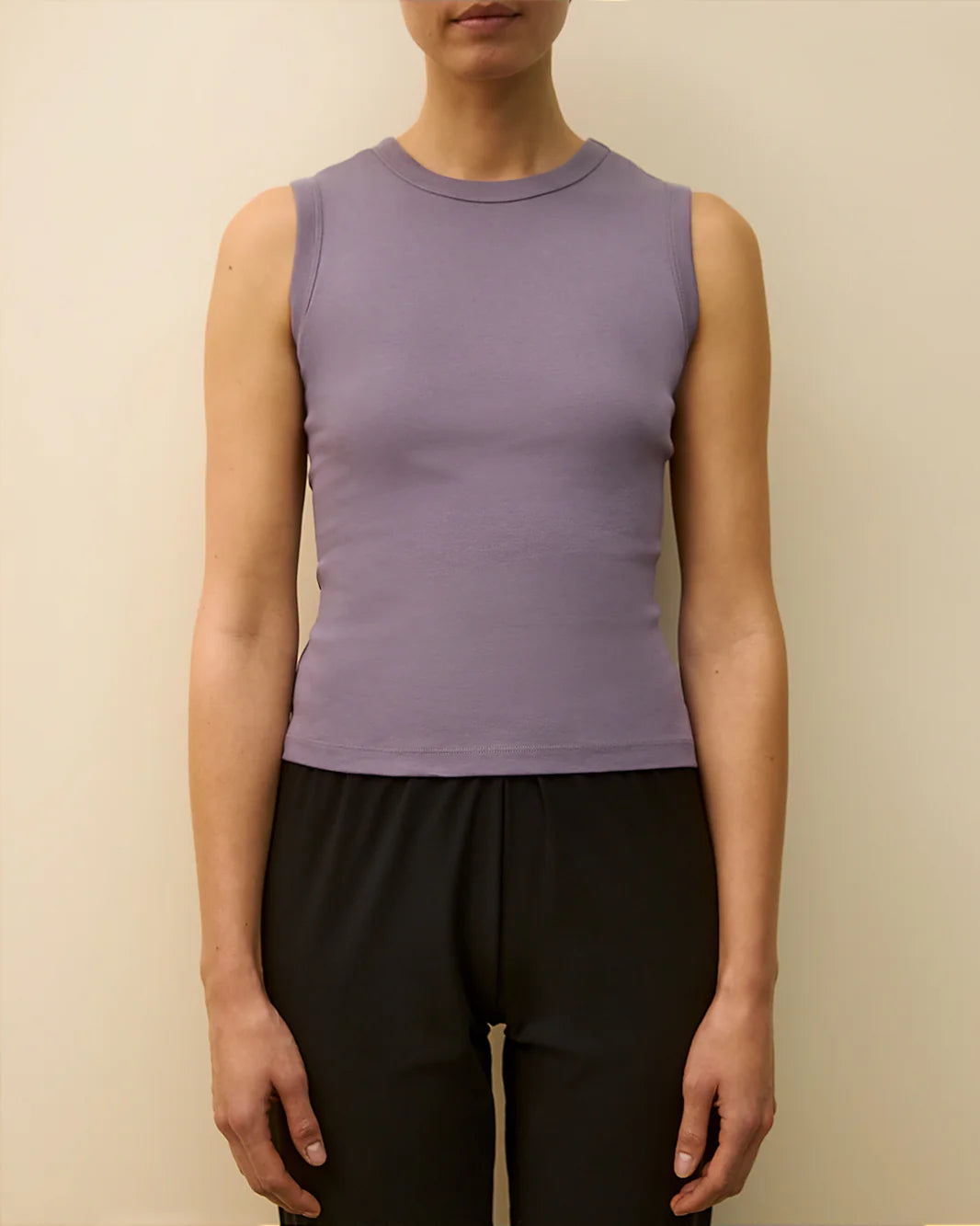 A fitted crew neck tank with scooped-out armholes and a cut-off seam on the back, crafted from medium-weight organic cotton rib. Layer or wear on its own.