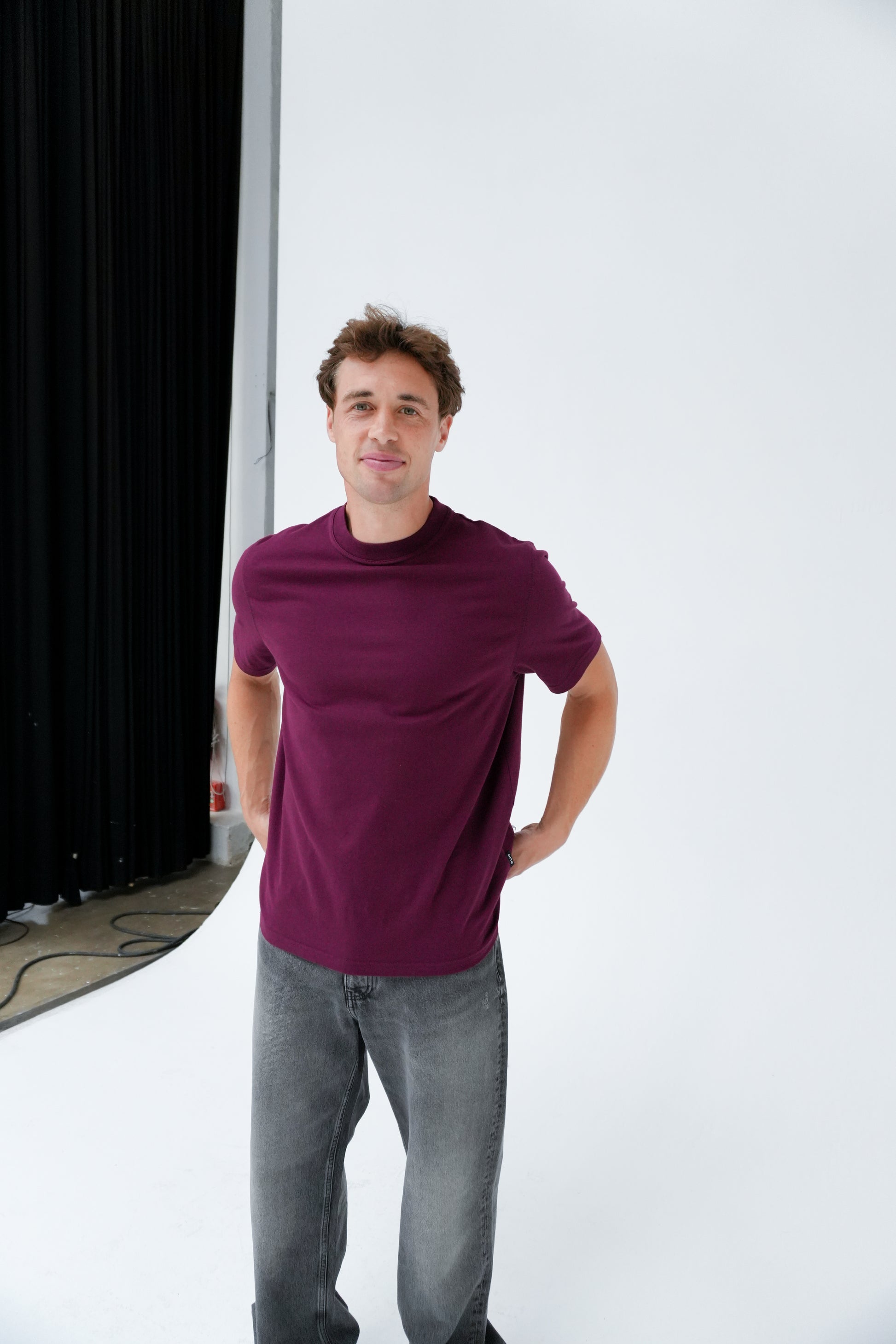 The T-shirt features an artwork screen-printed in pink across the back. Made from premium heavyweight cotton, the burgundy T-shirt is soft to the touch with a slightly higher neckline and a relaxed fit.