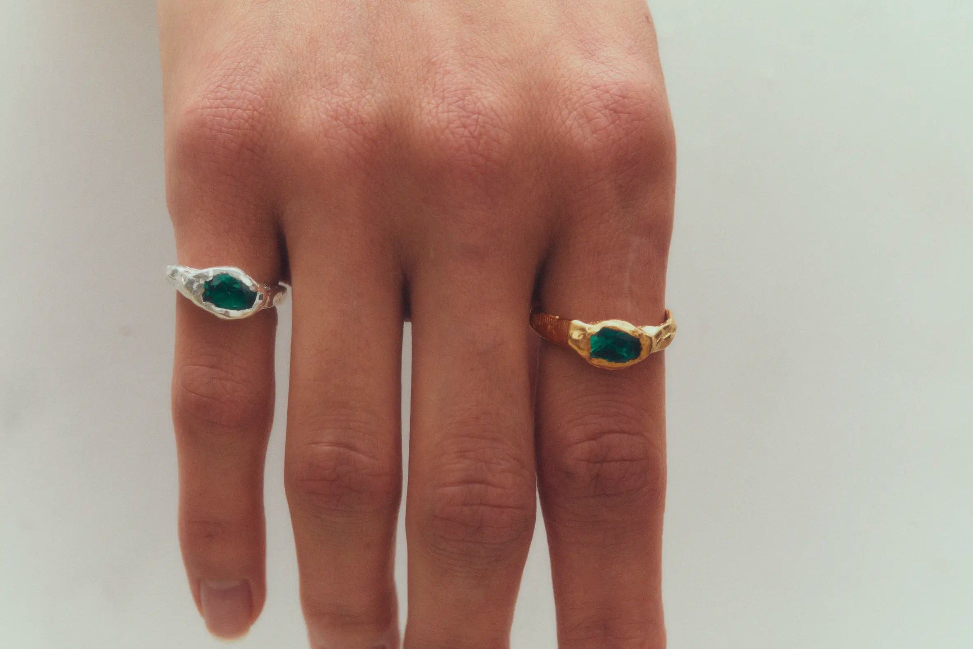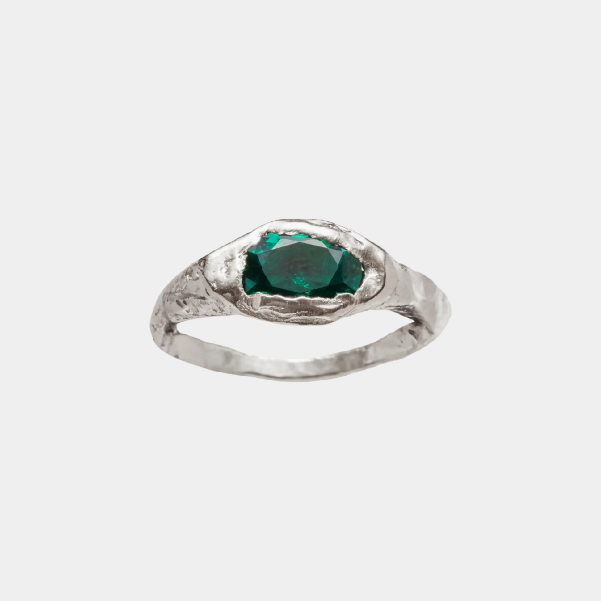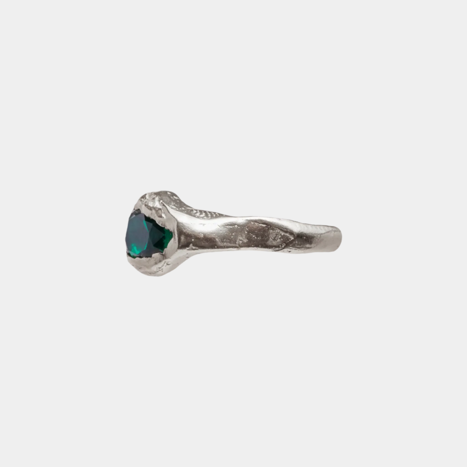 Faro Green, handmade recycled silver ring with green emerald Cz stone.