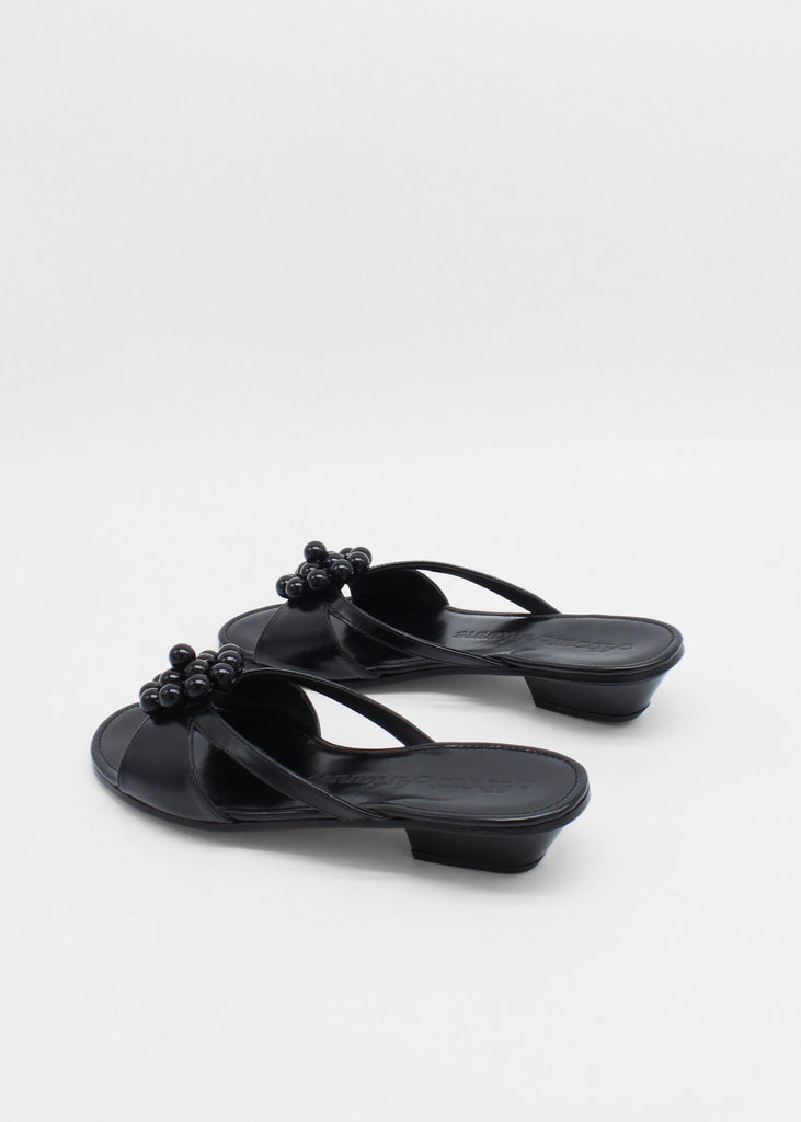 Slip on sandal made of black leather. This sandal features a black resin applique at vamp, low cuban heel and square open toe.