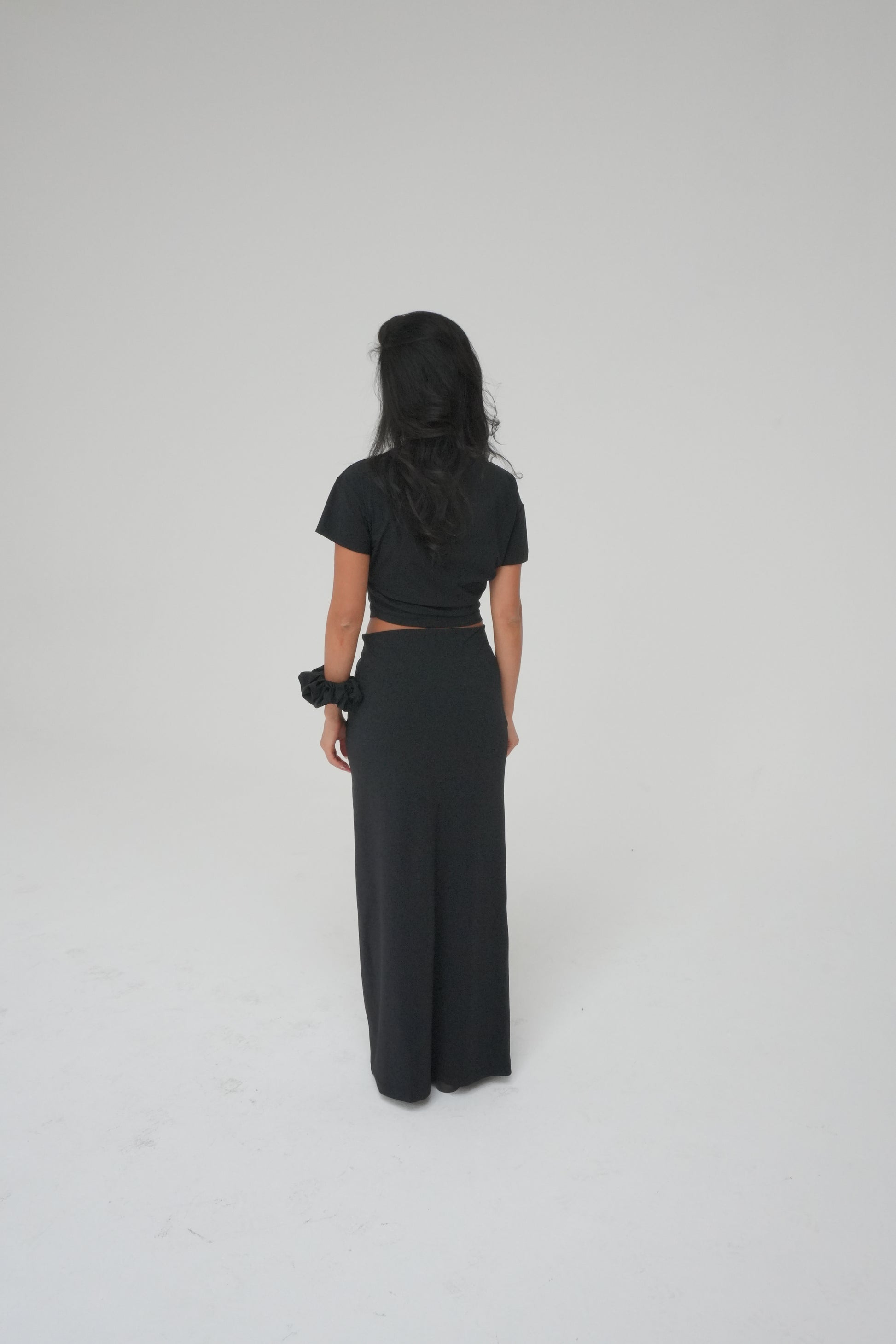 Full length skirt with asymmetrical side waist folds and a firm, wide waistband designed for a flattering mid-rise fit. Made from recycled Italian stretch fabric, this skirt offers ease for everyday wear.