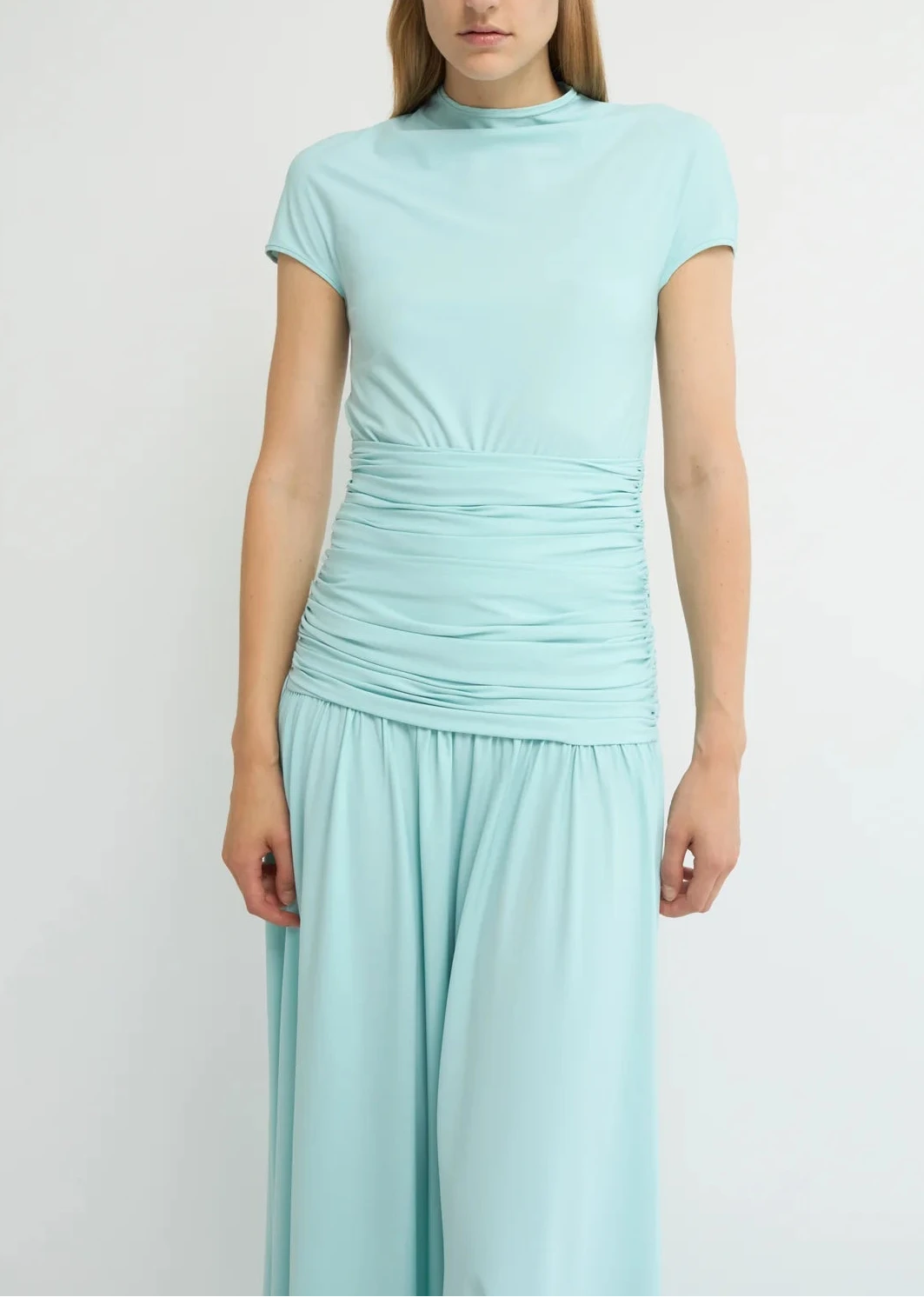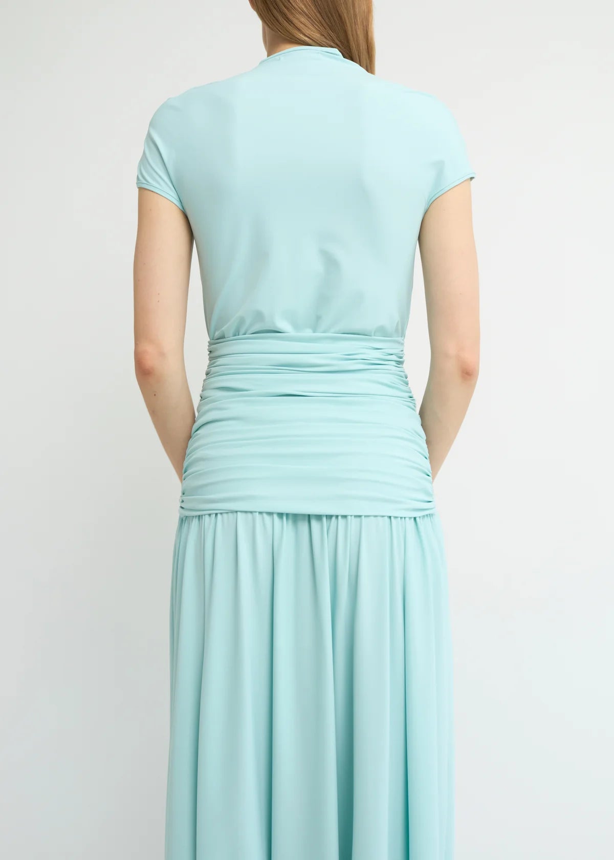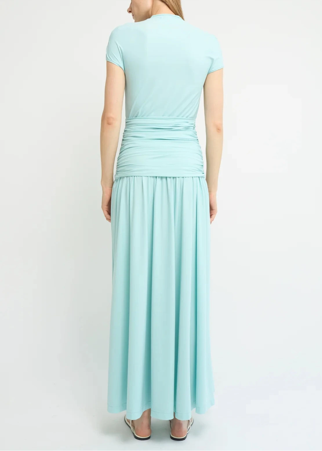 Ankle-length dress with a clean high neckline and short cap sleeves, shaped by a softly gathered waist that creates gentle definition through the midsection. The skirt falls long and fluid from the hips, balancing the more fitted upper body. Made in Italian stretch fabric from recycled materials, chosen for its smooth feel and responsible production. A refined, feminine silhouette that moves easily between day and evening.