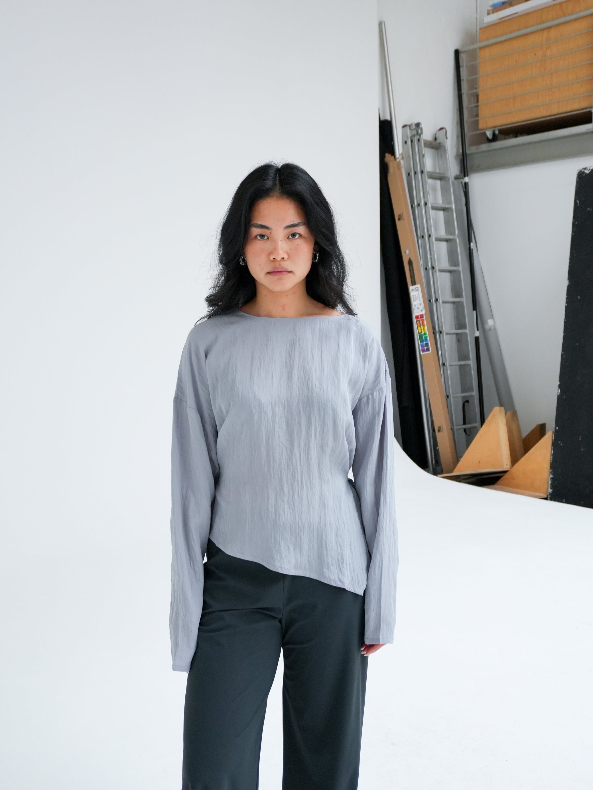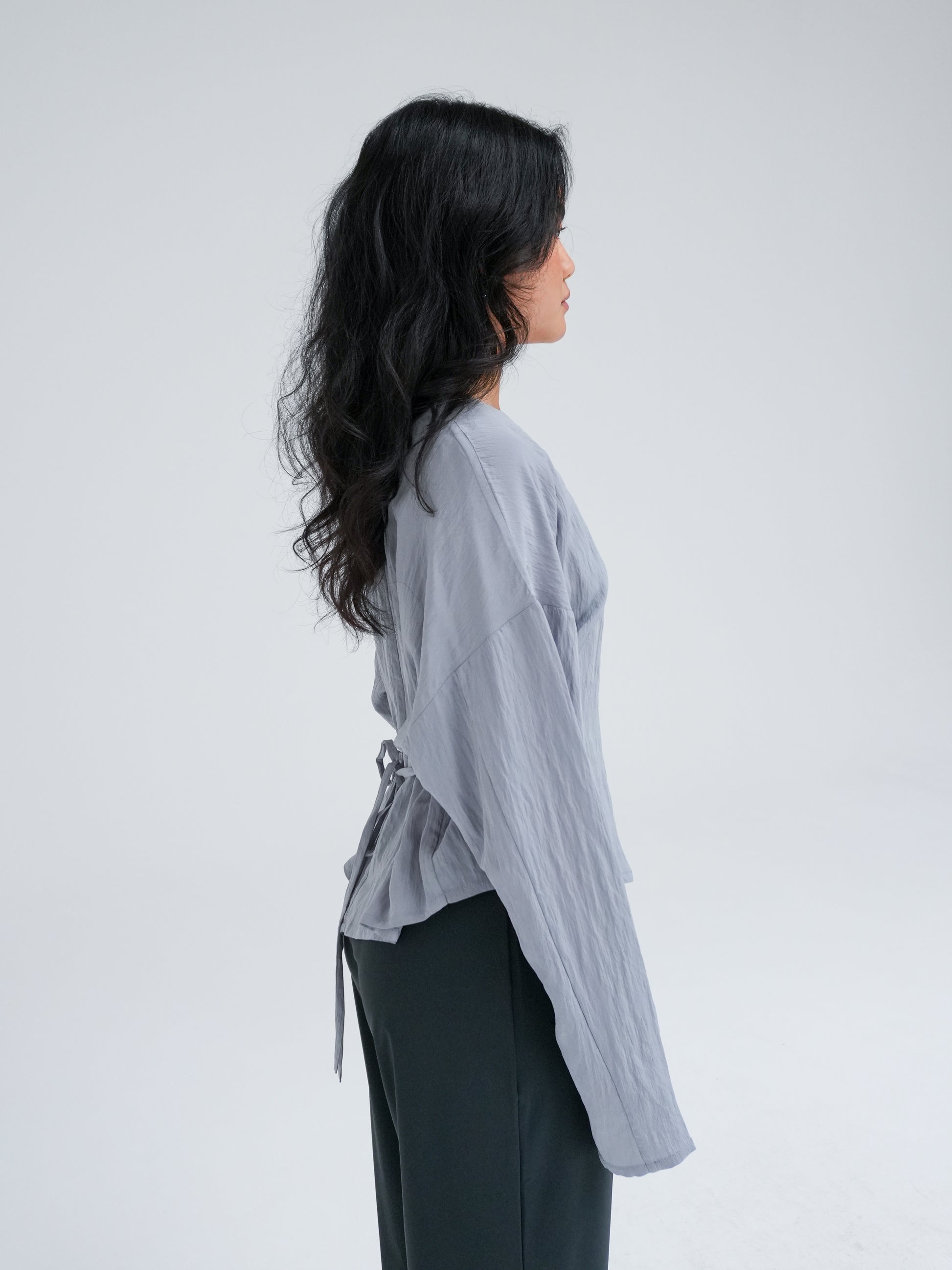 The Hailee Shirt is designed with an open, asymmetrical neckline and a straight silhouette when worn untied. The style features an asymmetrical hem that adds a modern and fluid expression to the overall design.