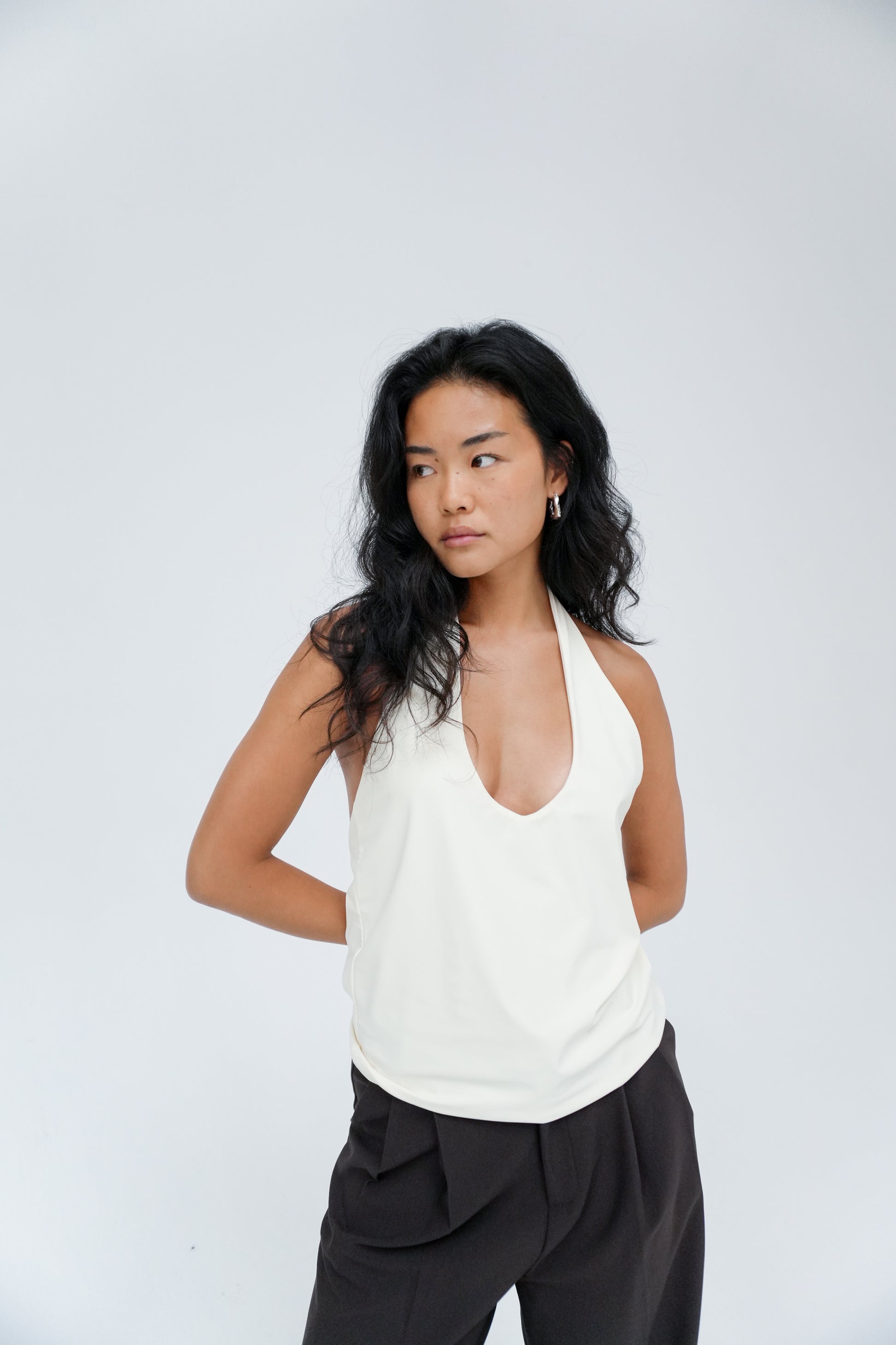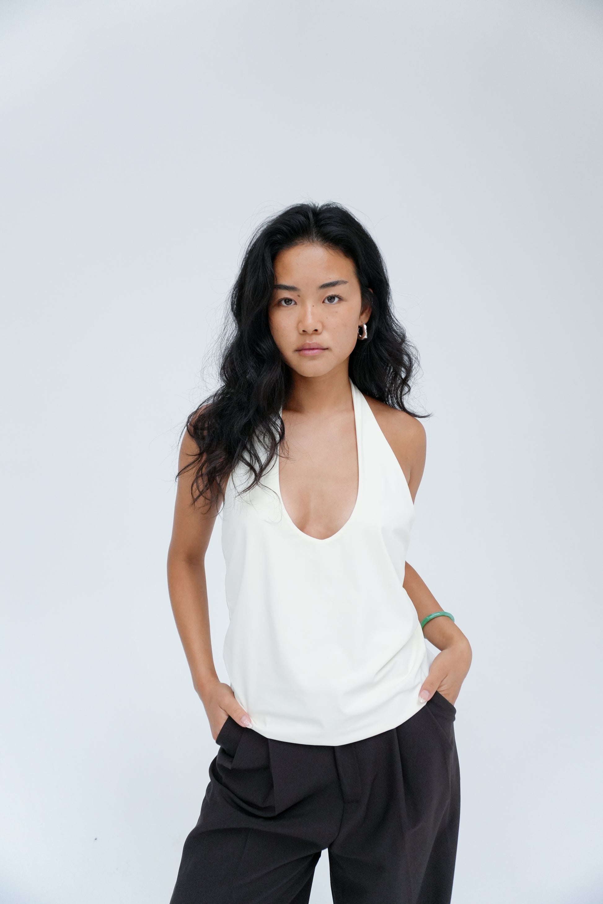 Halter neck top with a deep scoop neckline and an open back for an elegant, minimal silhouette. Designed for a loose fit that sits just above the hips. Made in double-layered recycled Italian stretch fabric chosen for its softness and responsible production.