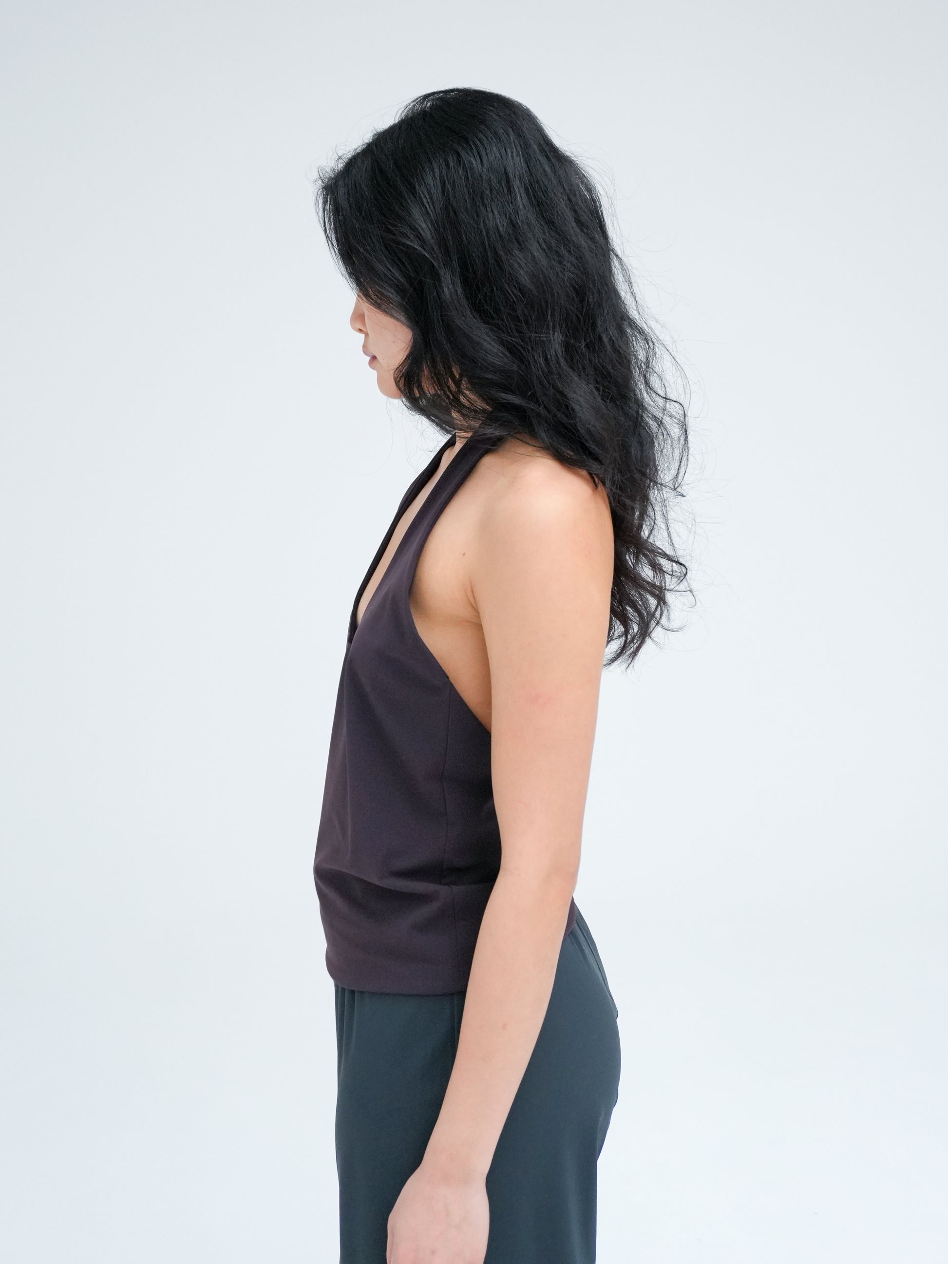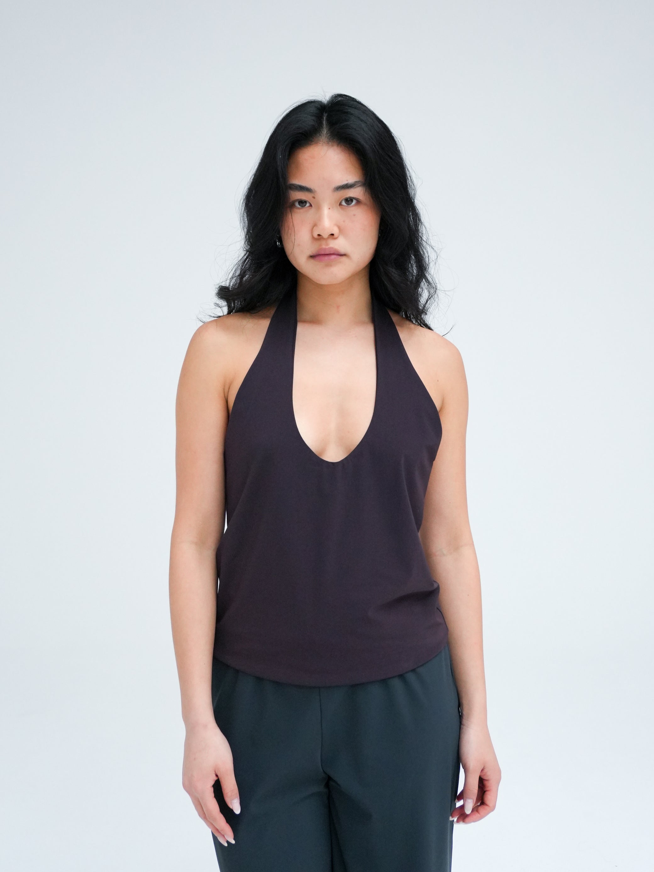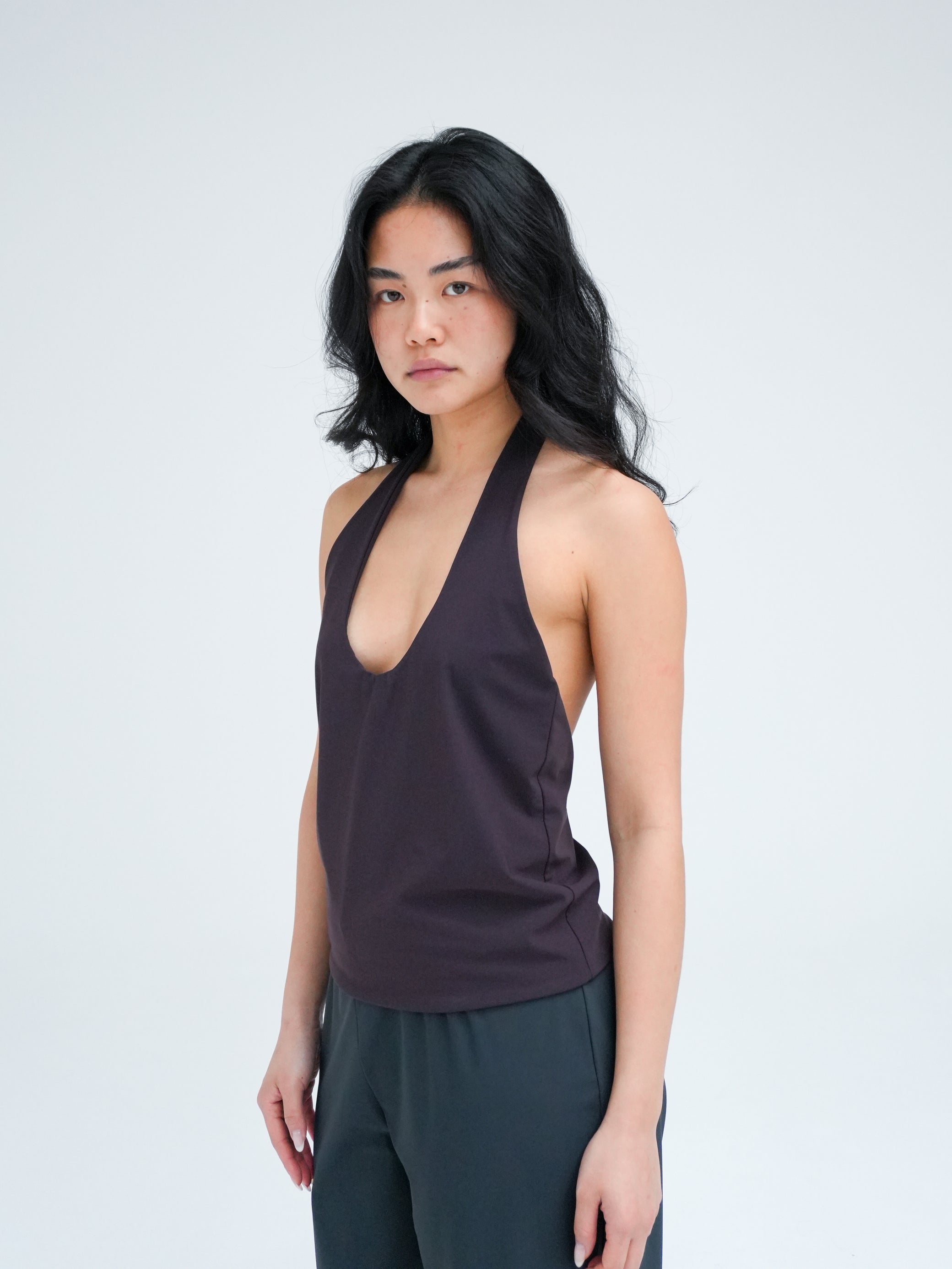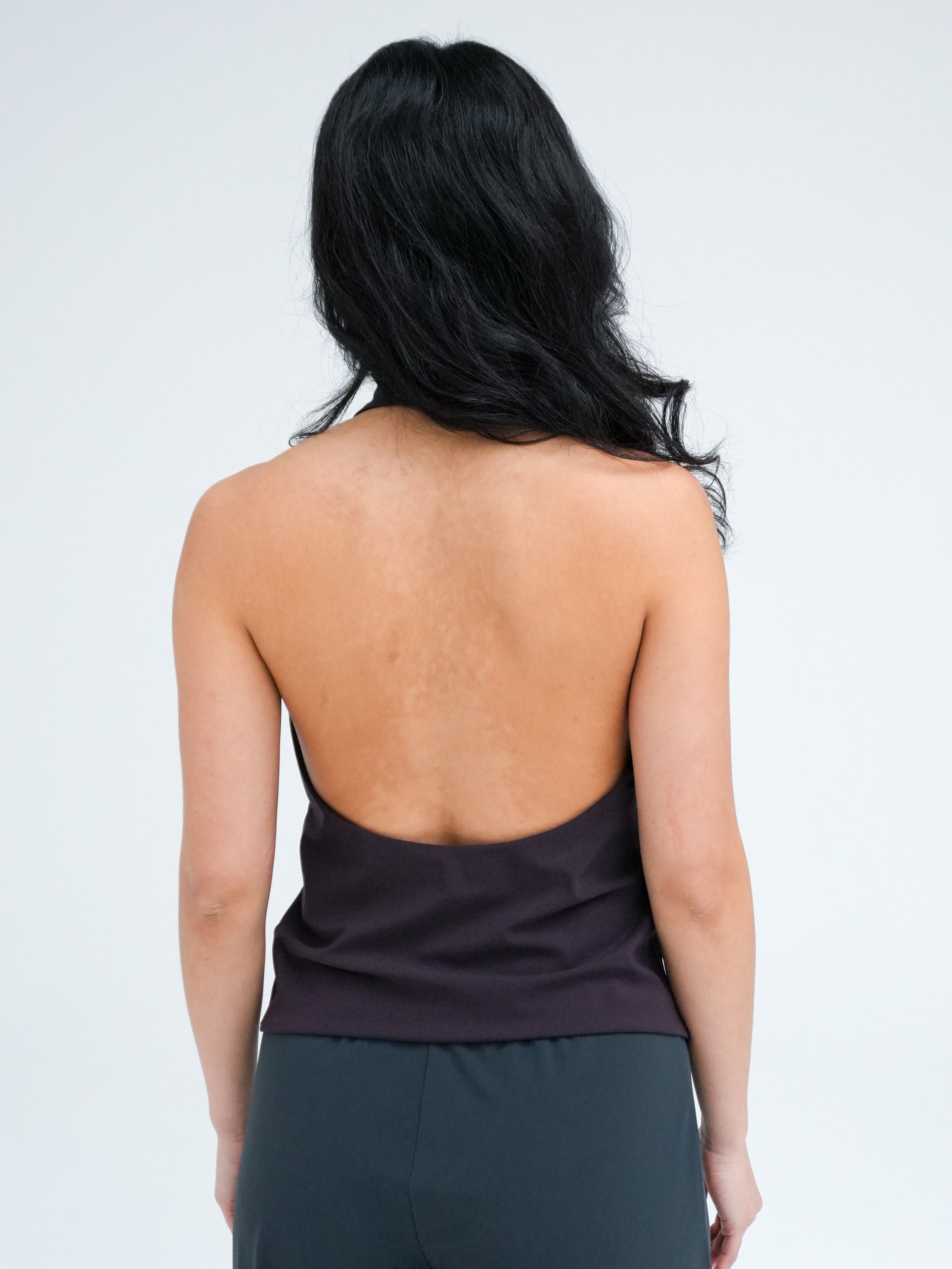Halter neck top with a deep scoop neckline and an open back for an elegant, minimal silhouette. Designed for a loose fit that sits just above the hips. Made in double-layered recycled Italian stretch fabric chosen for its softness and responsible production.