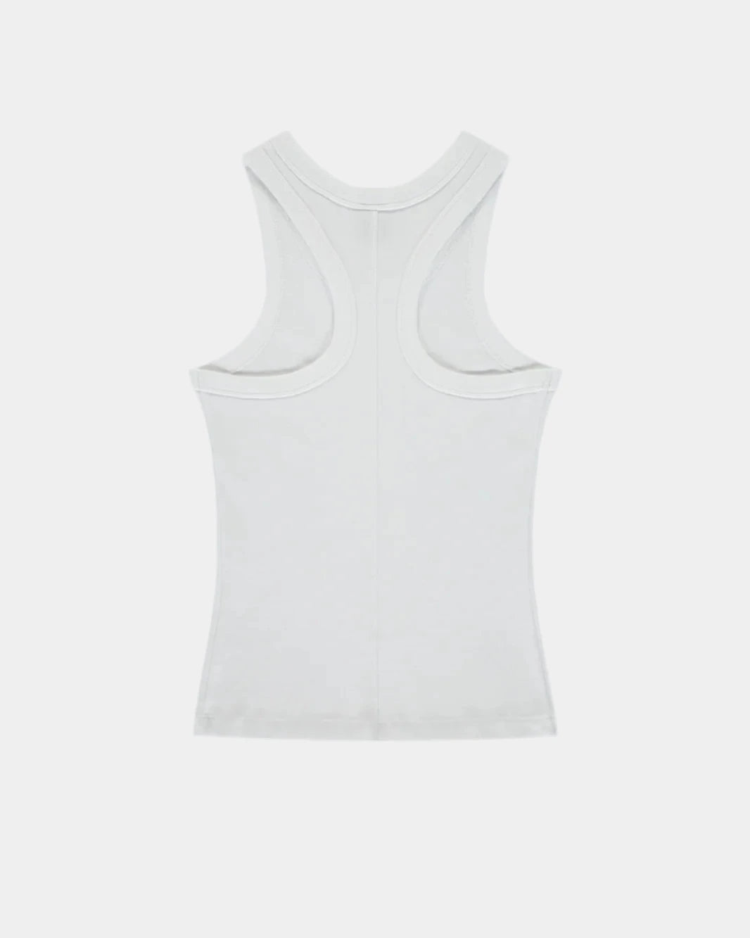 A racerback tank with a cut-off seam detail on the back, made from a medium-weight organic cotton rib. Designed to be able to wear with a strapless bra.