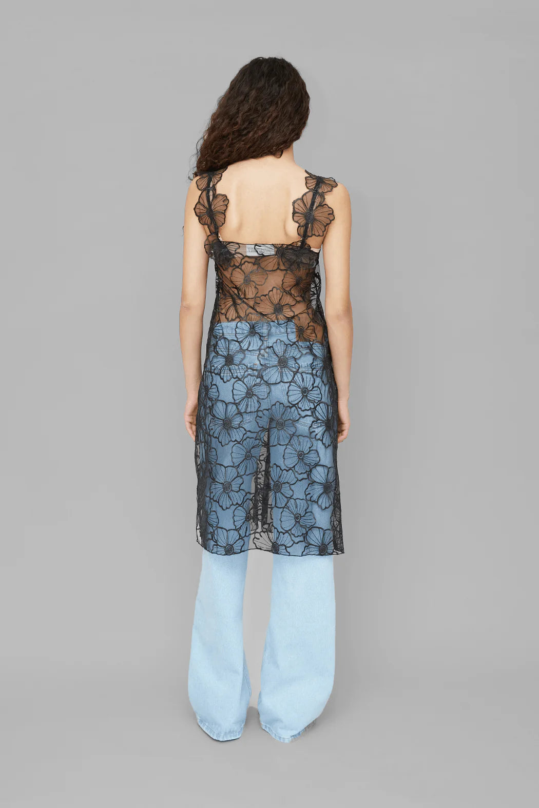 The Iris Dress is crafted from 90% recycled polyamide and 10% recycled polyester. Designed in sheer black floral lace, it features delicate straps, a loose fit, and a below-the-knee length. Lightweight and versatile, it can be styled alone or layered over trousers and skirts for a bold, modern look.