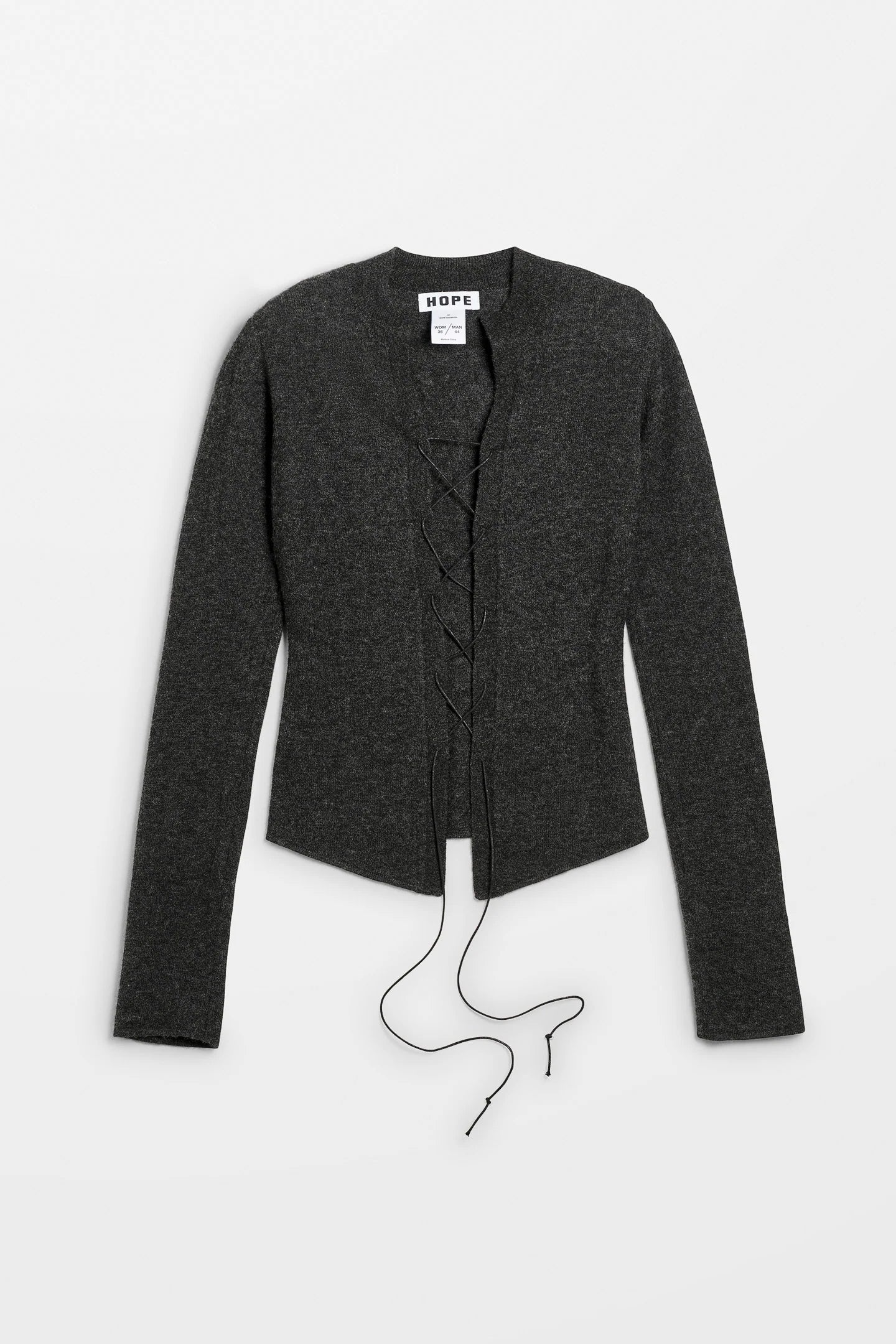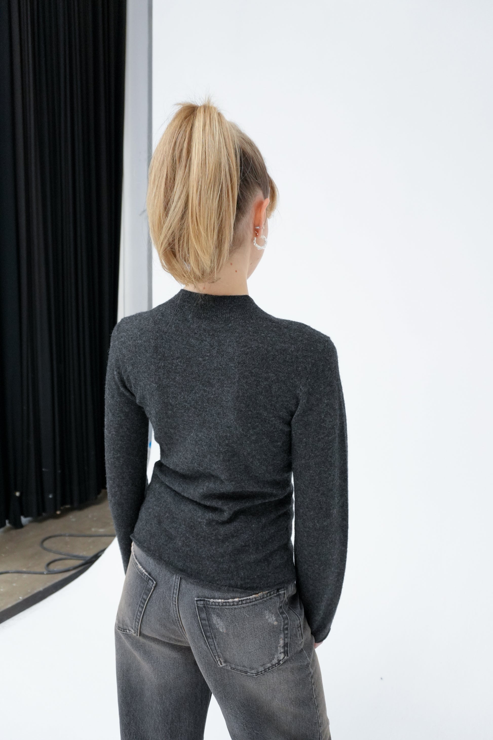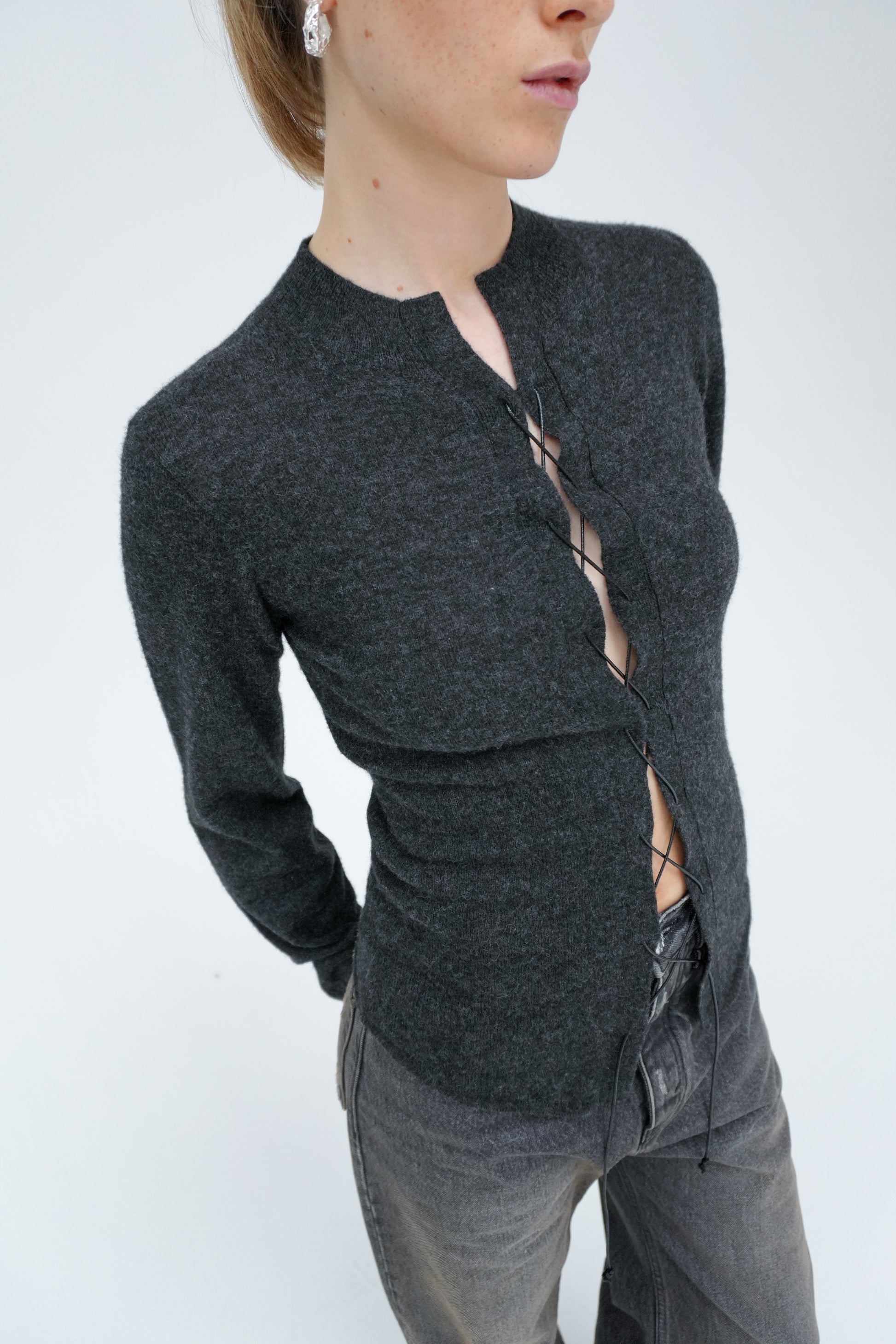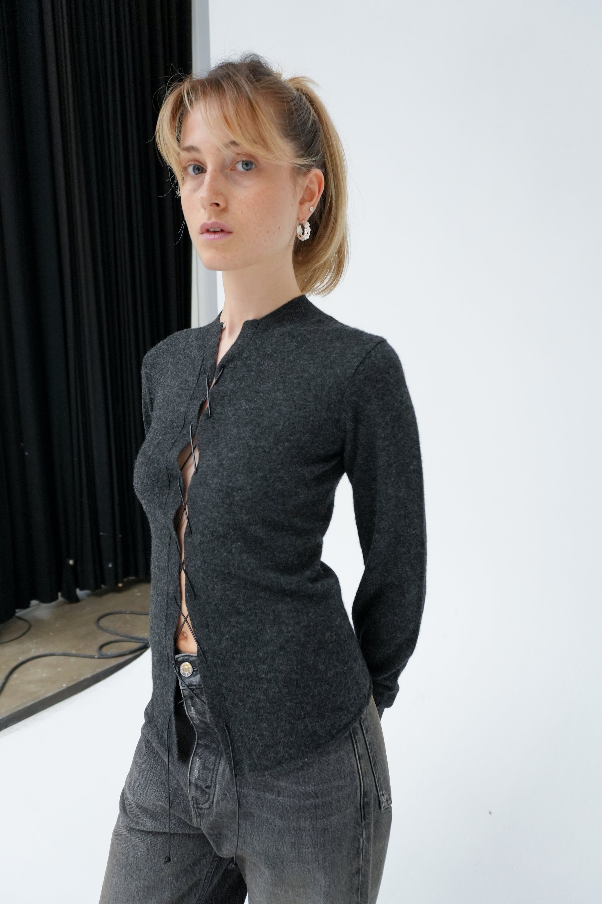 Laced Sweater is a slim fitting mock neck sweater with a laced opening in the front. Crafted from a soft Yak yarn.