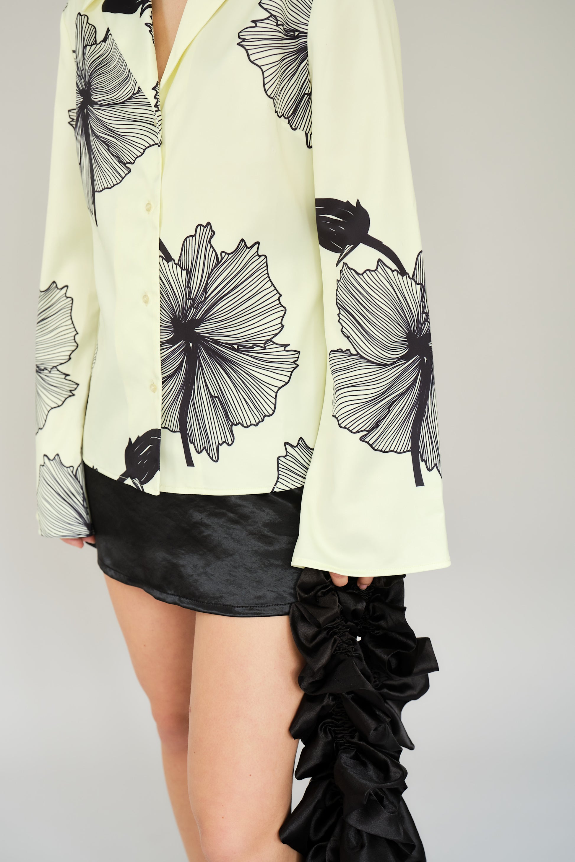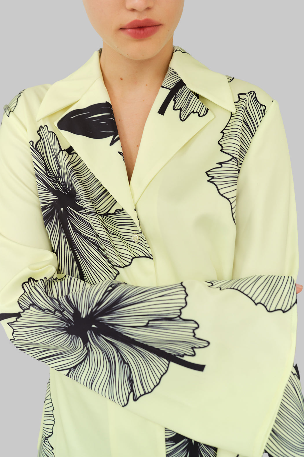 The Lone Shirt is crafted from 100% recycled polyester in tender yellow with bold black floral prints. Designed with a relaxed, slightly oversized silhouette, it features long bell sleeves, a pointed collar, and a button-down front.