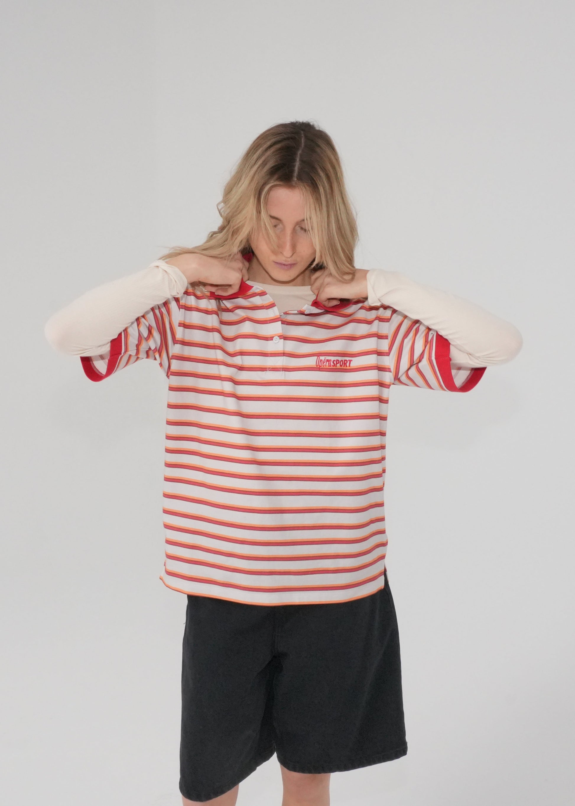 The Luna Unisex Polo T-shirt is made from 100% organic cotton in red-orange stripes. It features a half button-up placket, a classic collar, a straight hem, and OpéraSPORT branding on the chest. With its unisex, oversized fit, it’s designed to flatter all body types, making it a versatile addition to your wardrobe. Comfy and stylish, it’s perfect for any occasion.