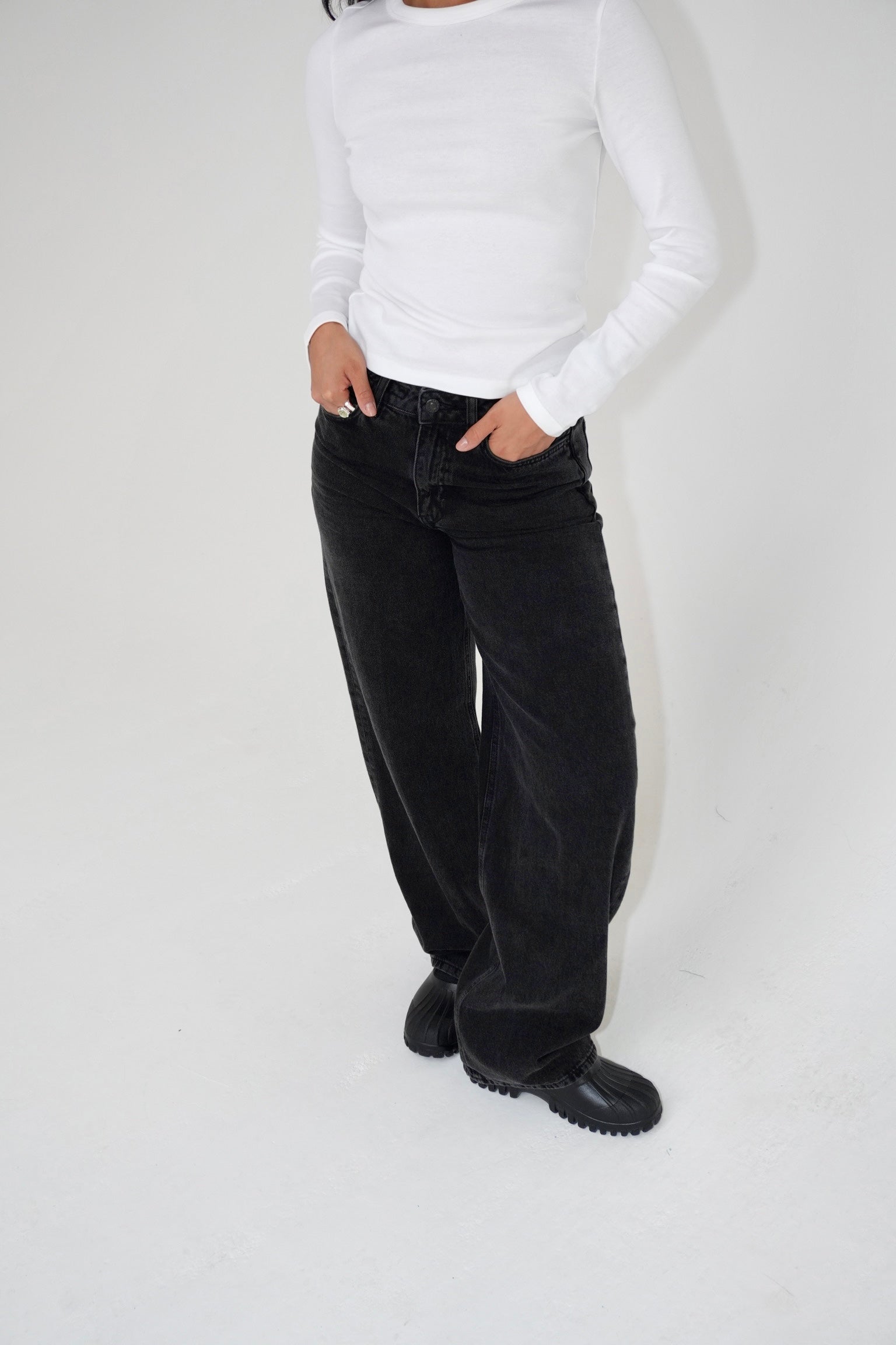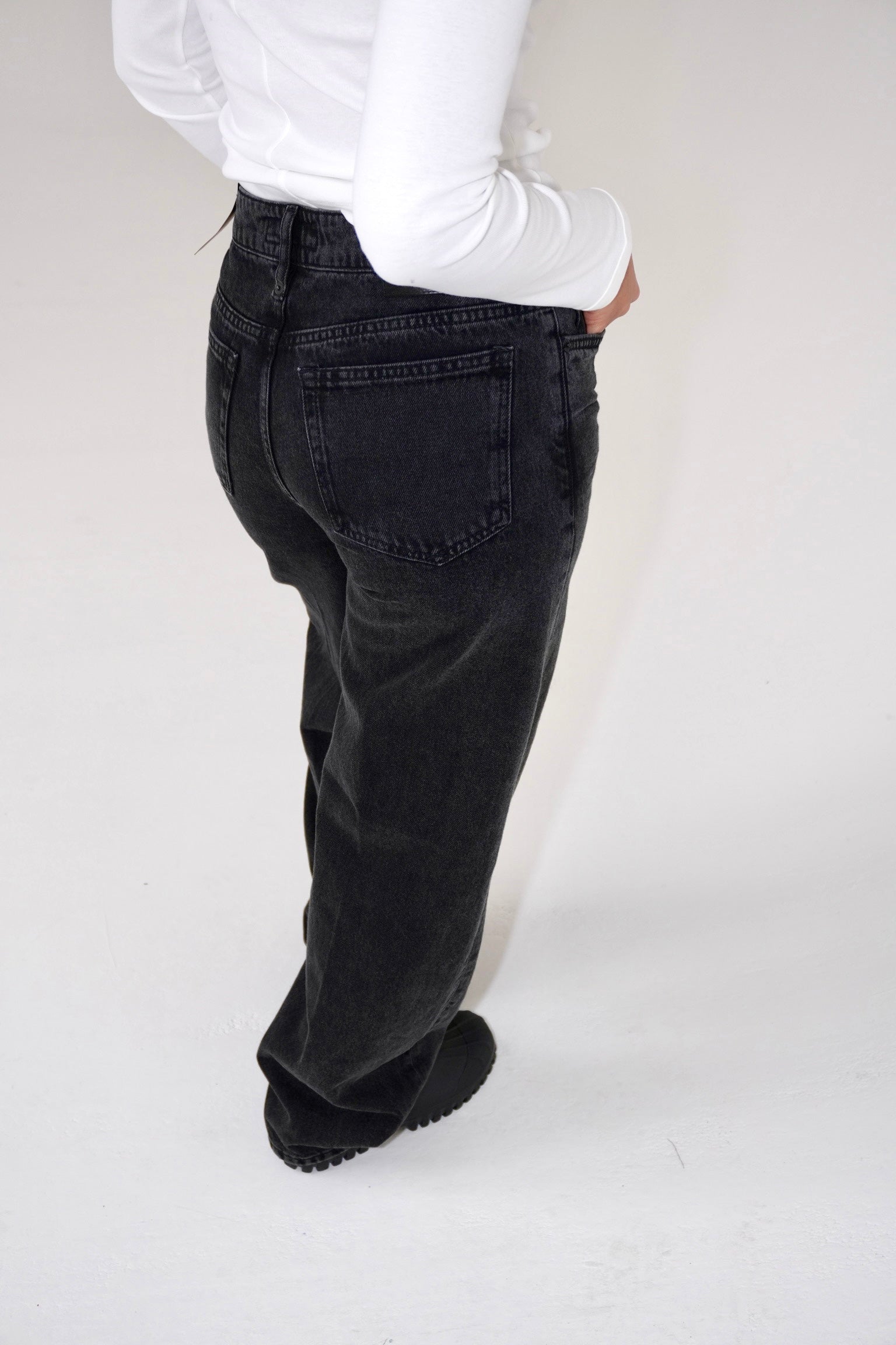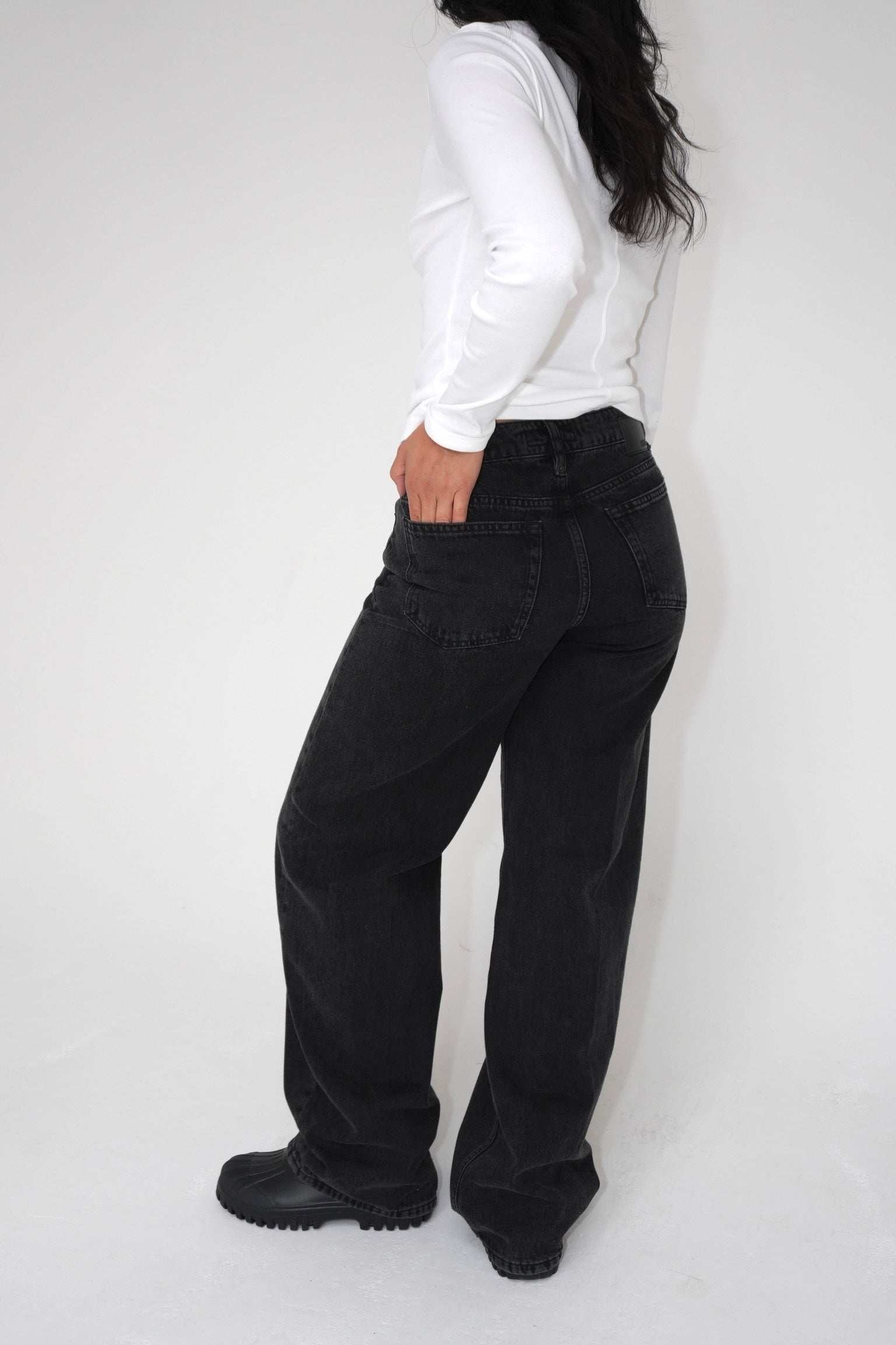 5 Pocket Denim with a wide leg, mid - waist fit and light authentic wash.