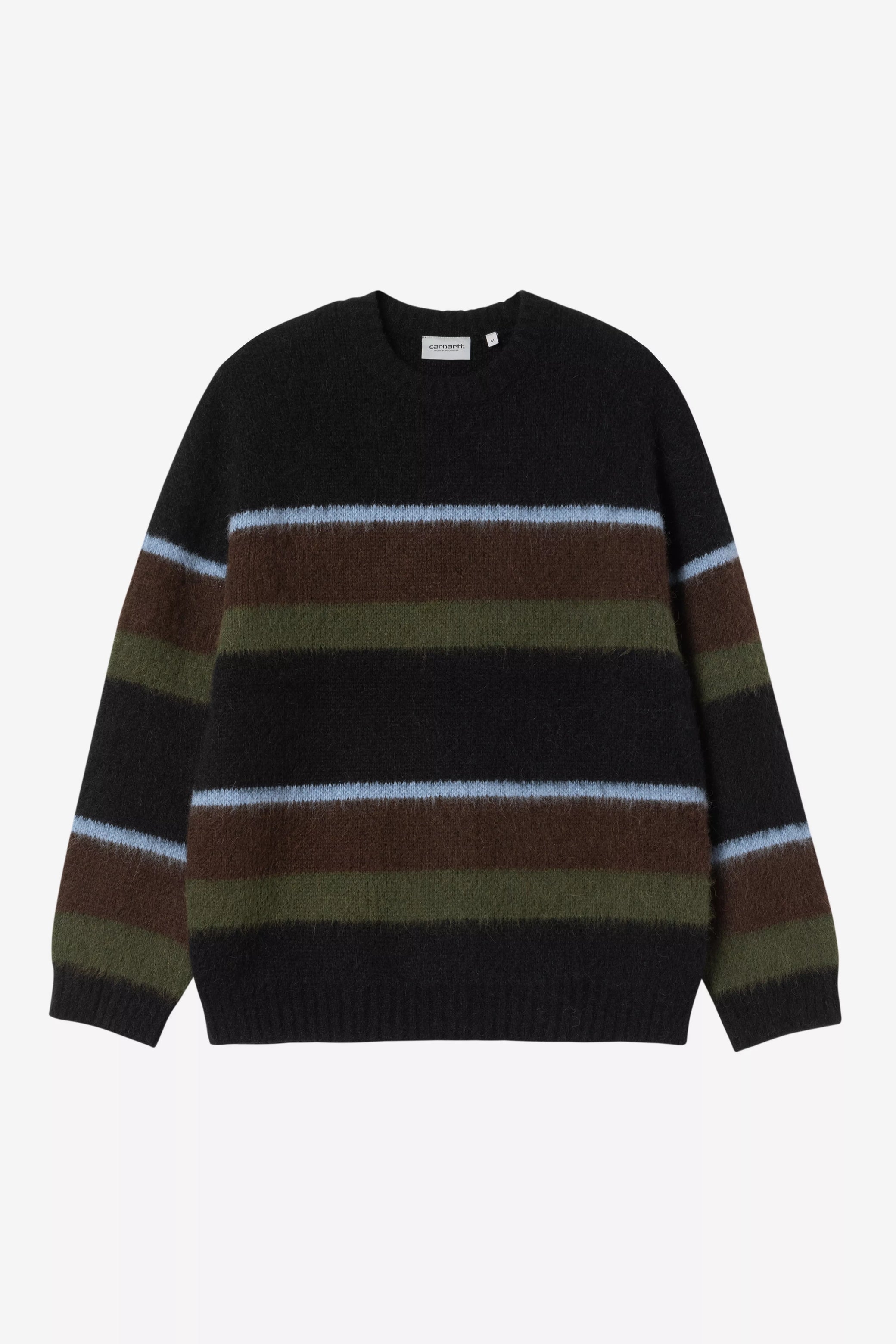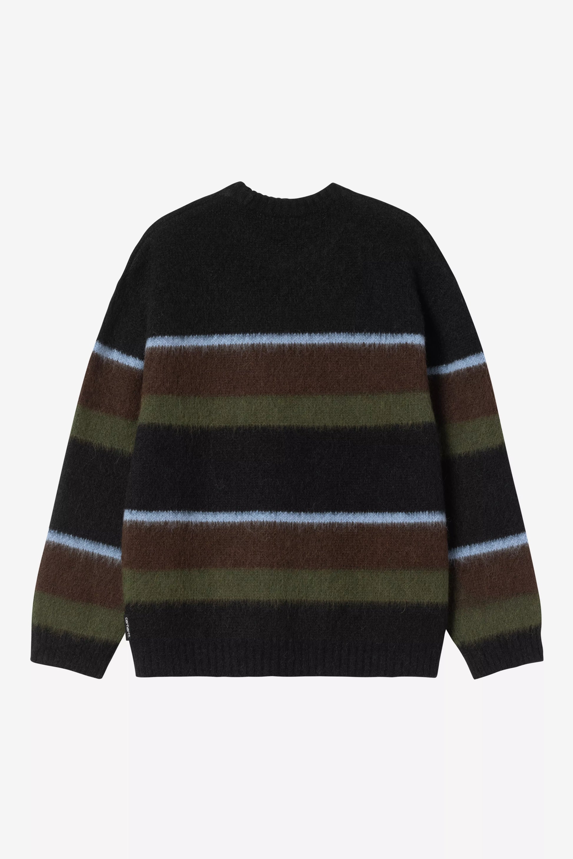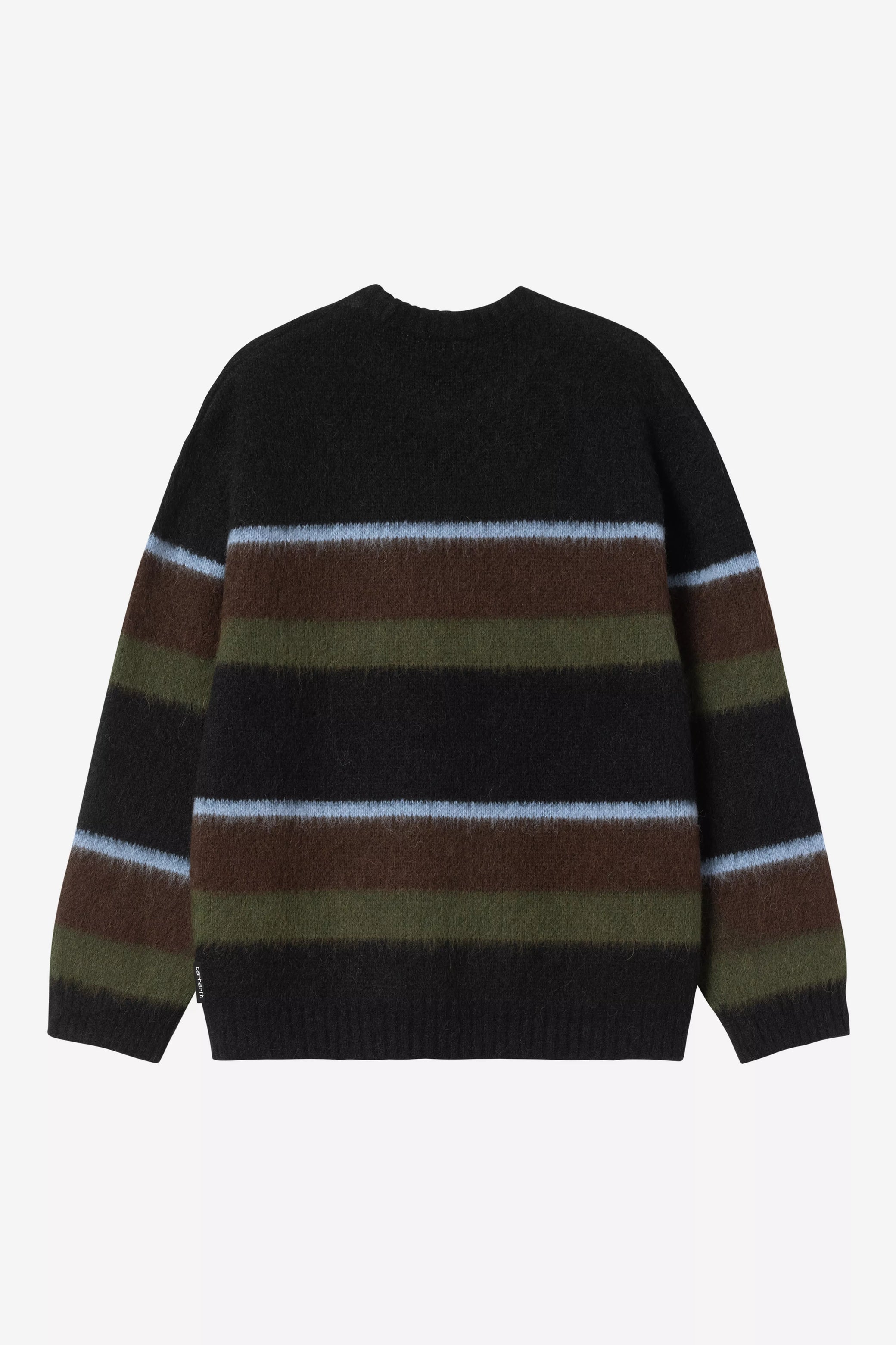 The Merton Sweater is a medium-weight knit design and consists of a soft, brushed blend of natural and synthetic fibers. Jacquard stripes and a flag label complete the design.