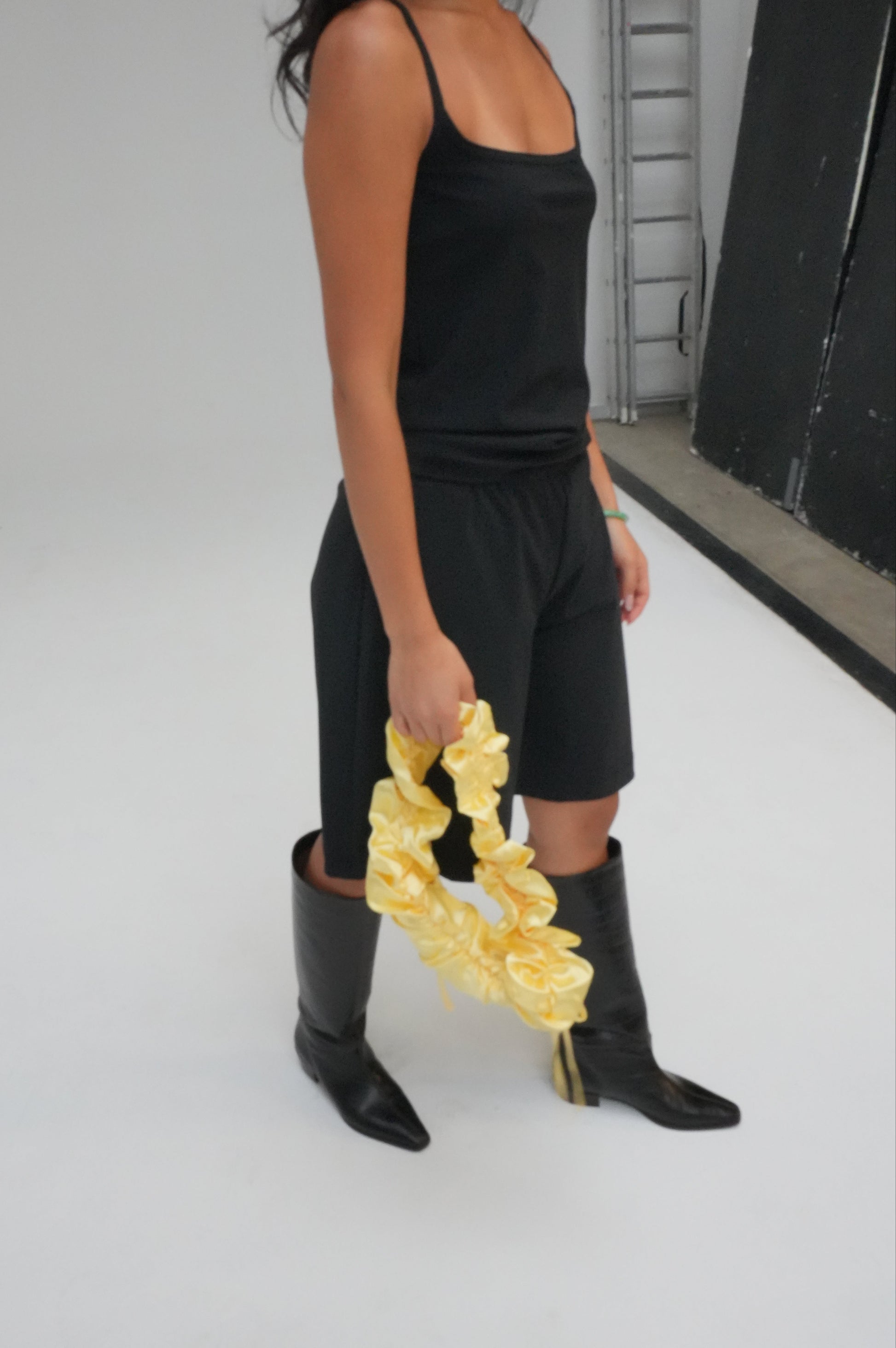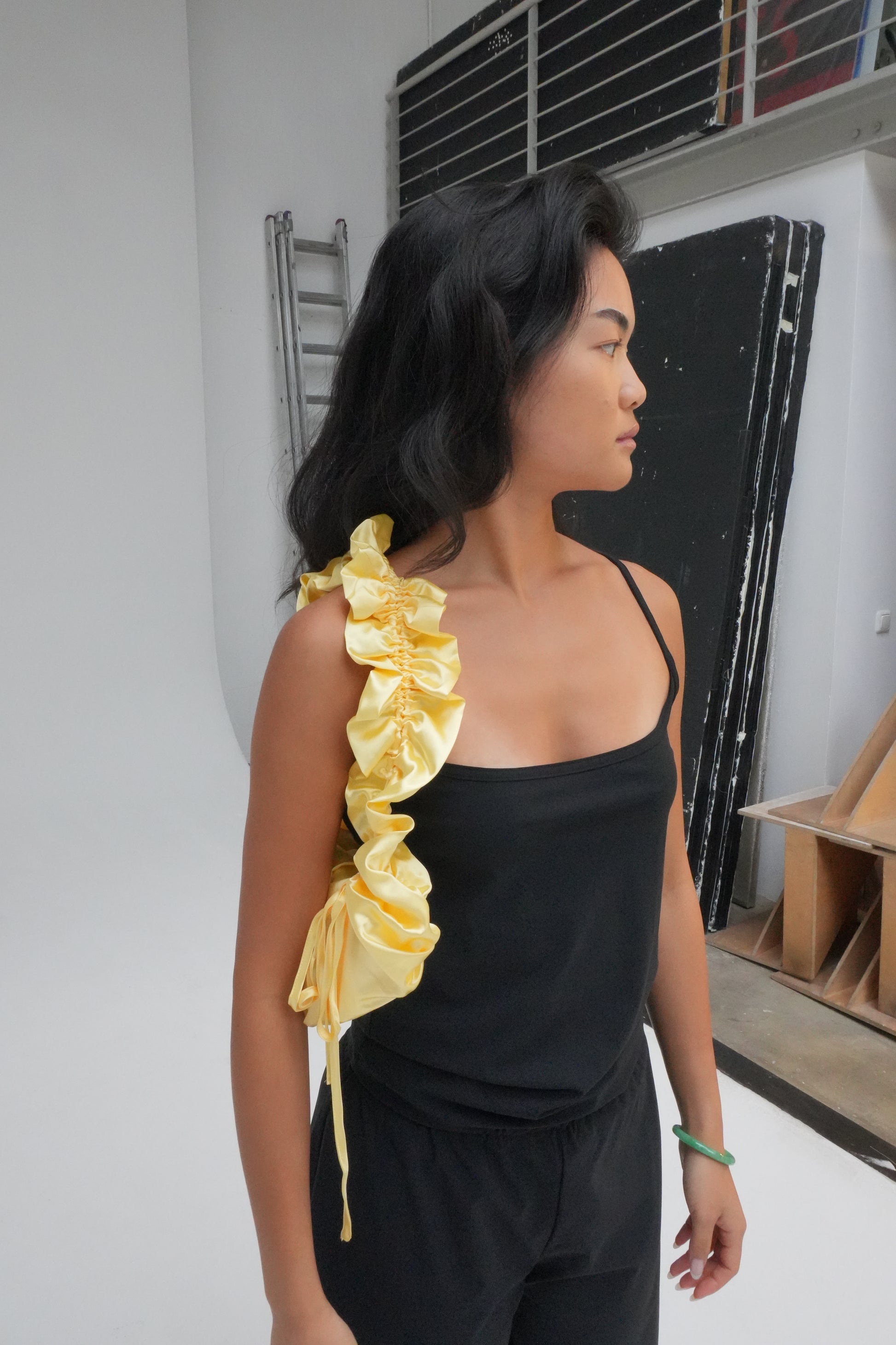 This season's mini Shirley bag is crafted from luxurious yellow recycled polyester. It features adjustable straps, zip closure, ruffled-trimmed top handles and can be worn around the shoulder or as a handbag.