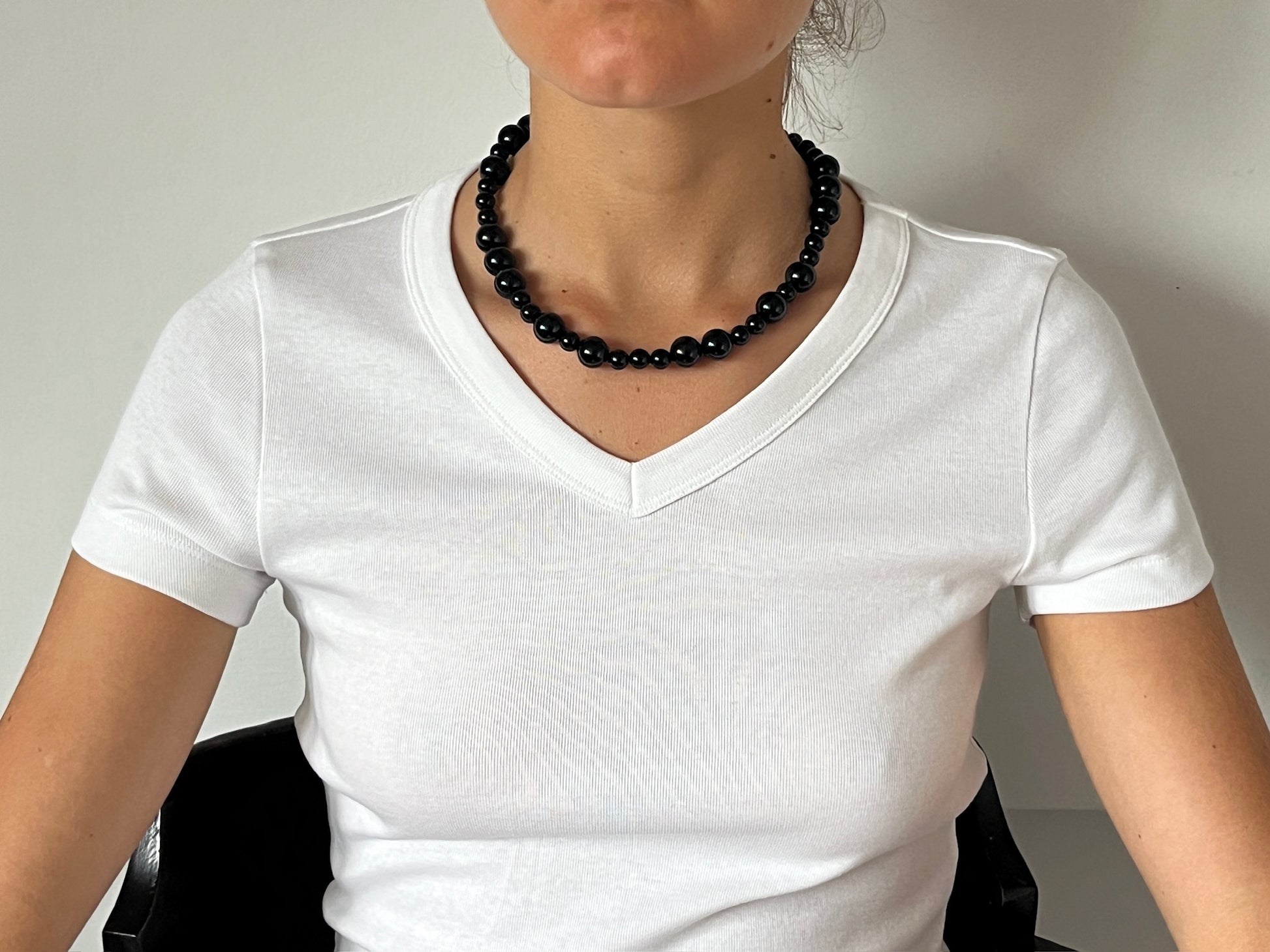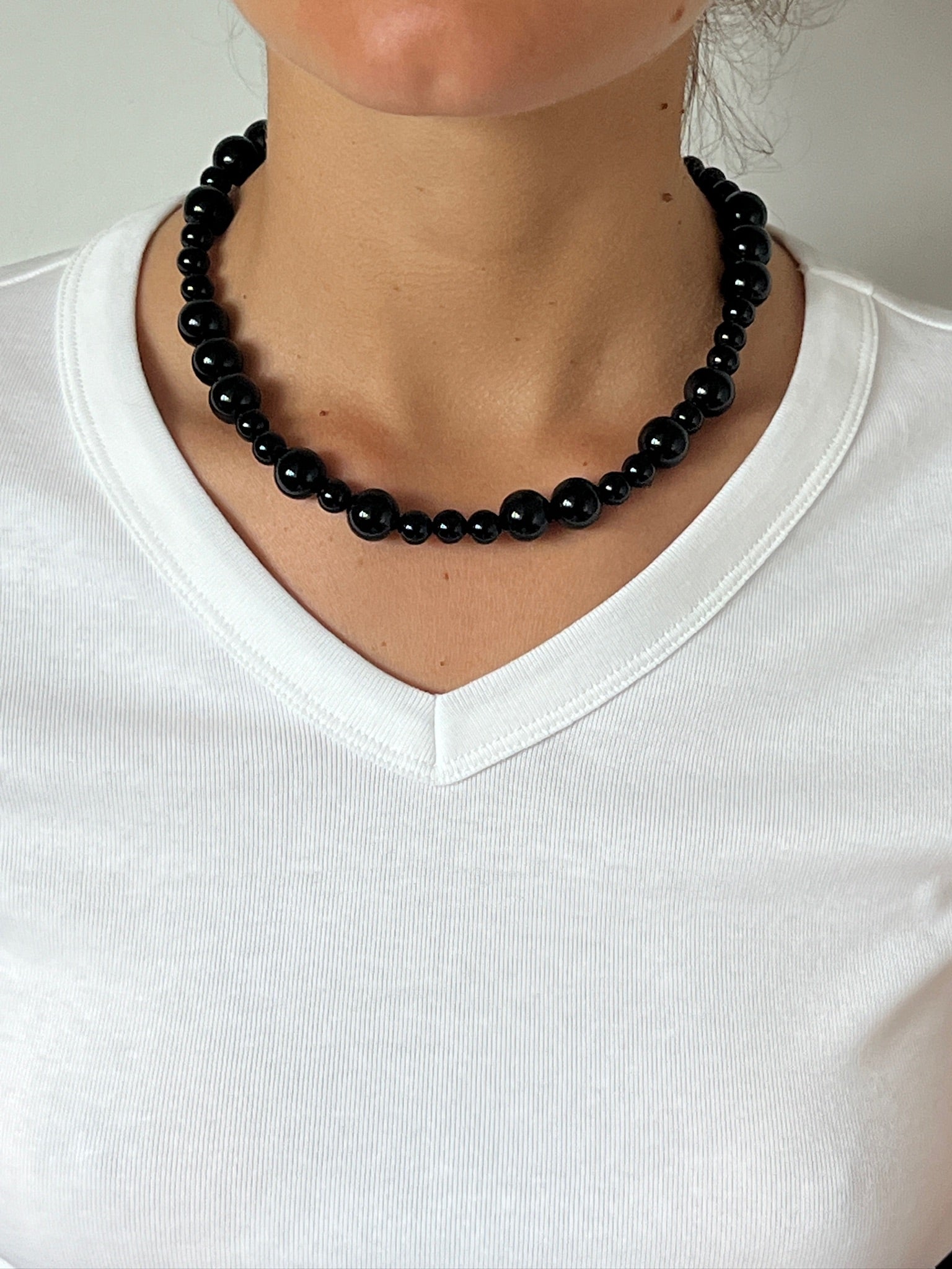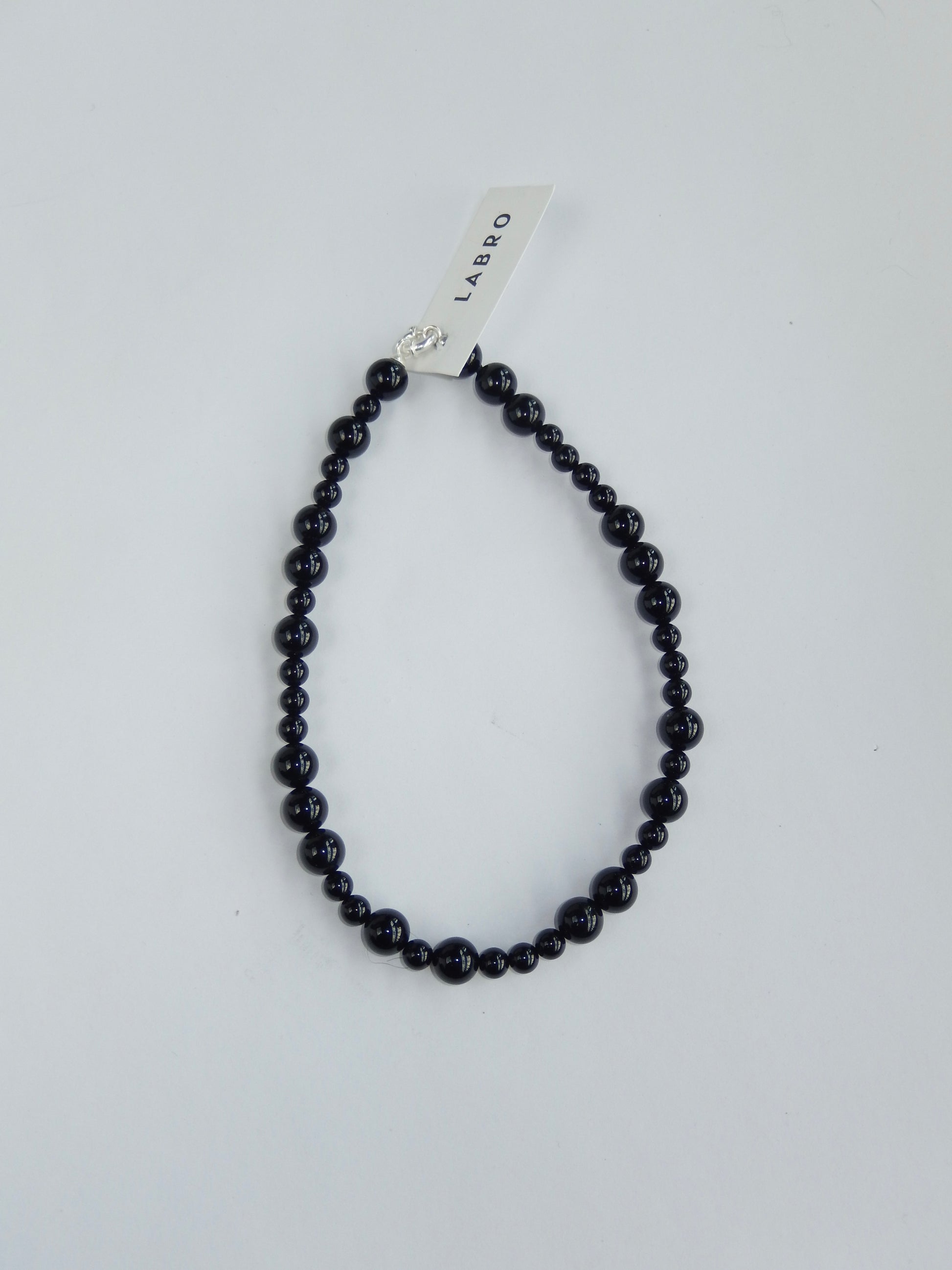 Medium gemstone necklace, handmade in the Labro atelier. Onyx possesses a strong character and mystical aura, fascinating mankind ever since. It makes a good durable stone for using in jewelry because it has a great hardness and can resist scratching from everyday wear. Because onyx is very rich in contrast, it creates a cool, sophisticated and modern style.