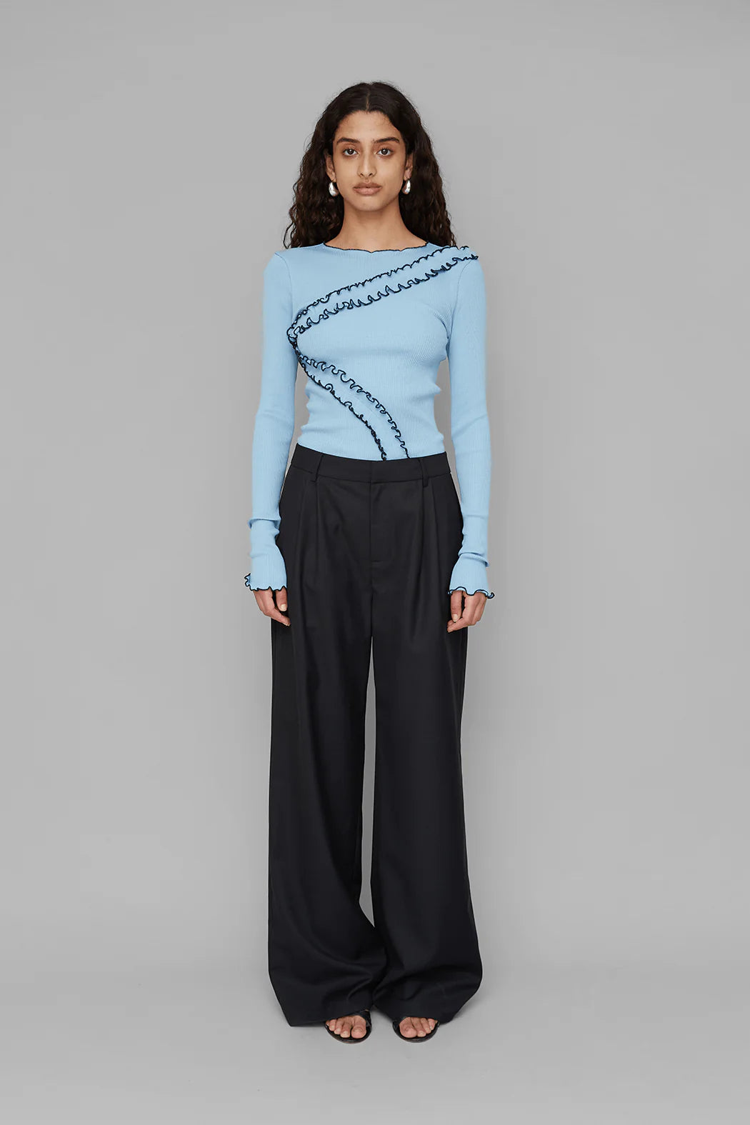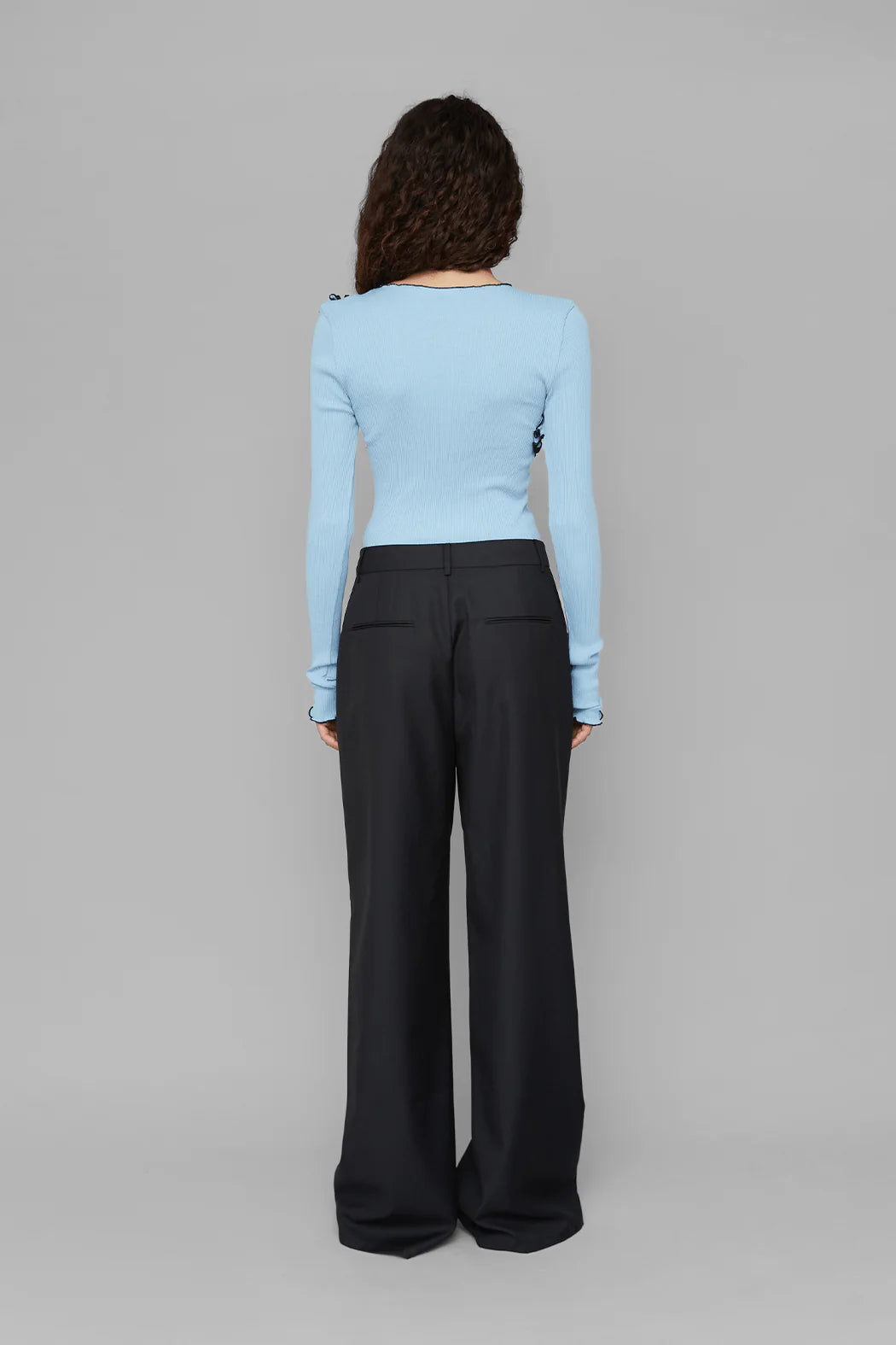 The Nora Trousers are crafted from 100% organic wool. Designed in black, they feature a wide-leg cut with a tailored finish, creating a flowing yet structured silhouette. Finished with a front closure and belt loops, they can be styled with the matching Nora Blazer or worn on their own.