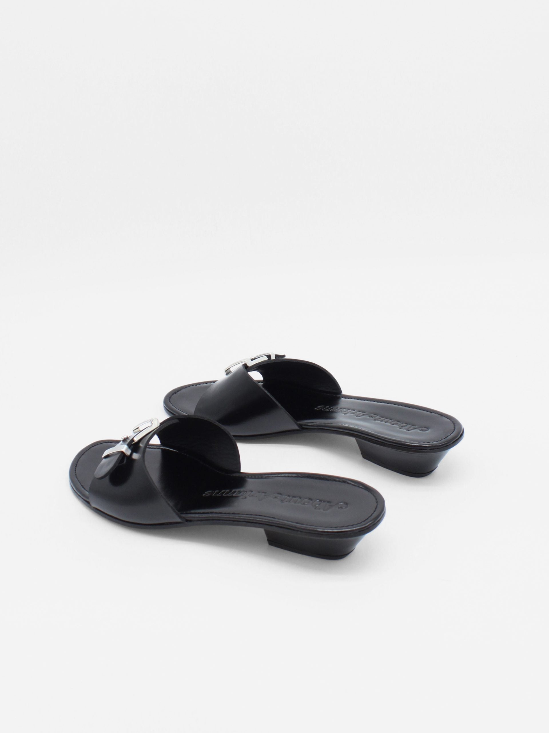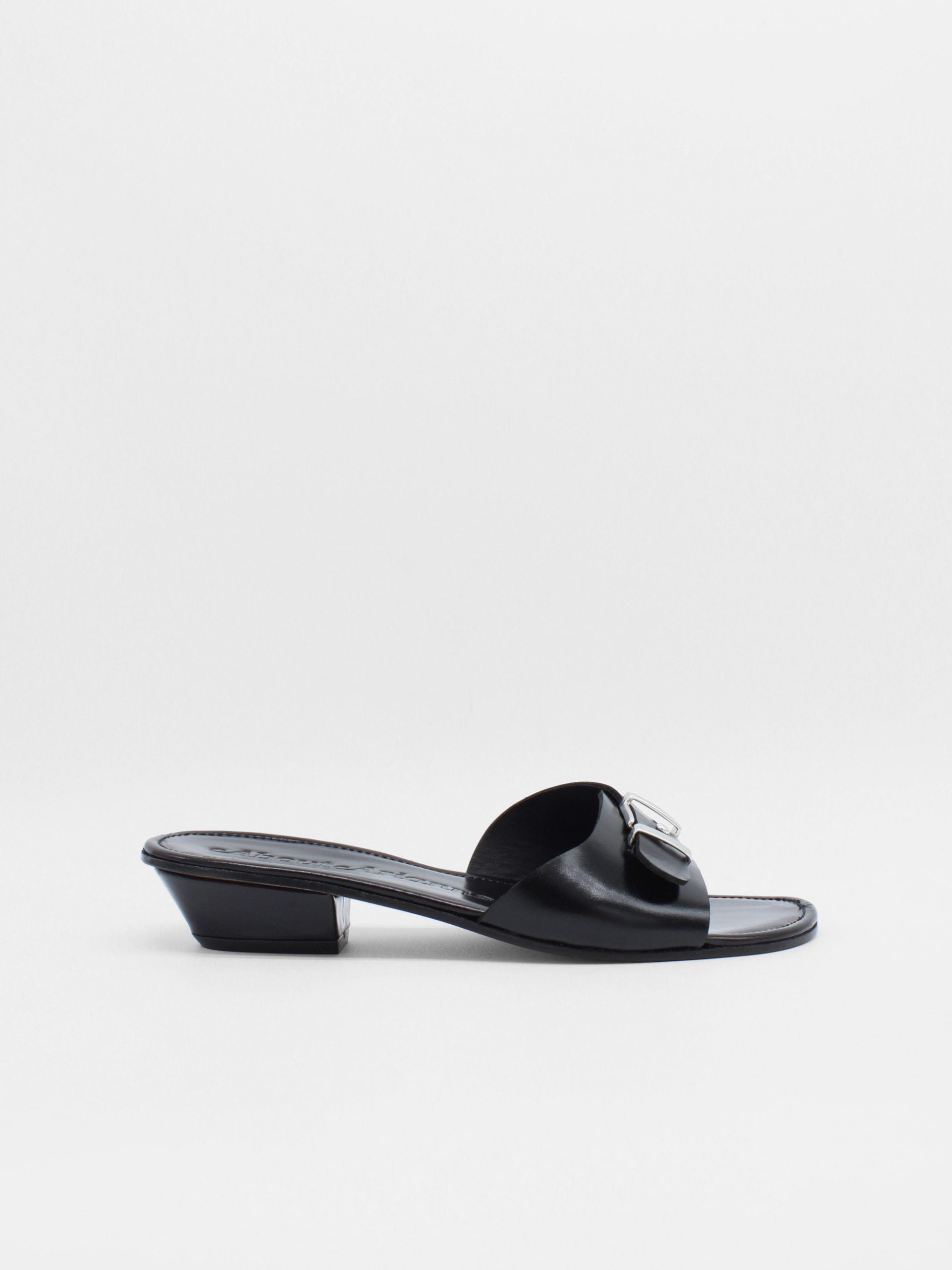 Slip on sandal made of shiny black leather. This sandal features an adjustable metallic buckle, low cuban heel and square open toe.