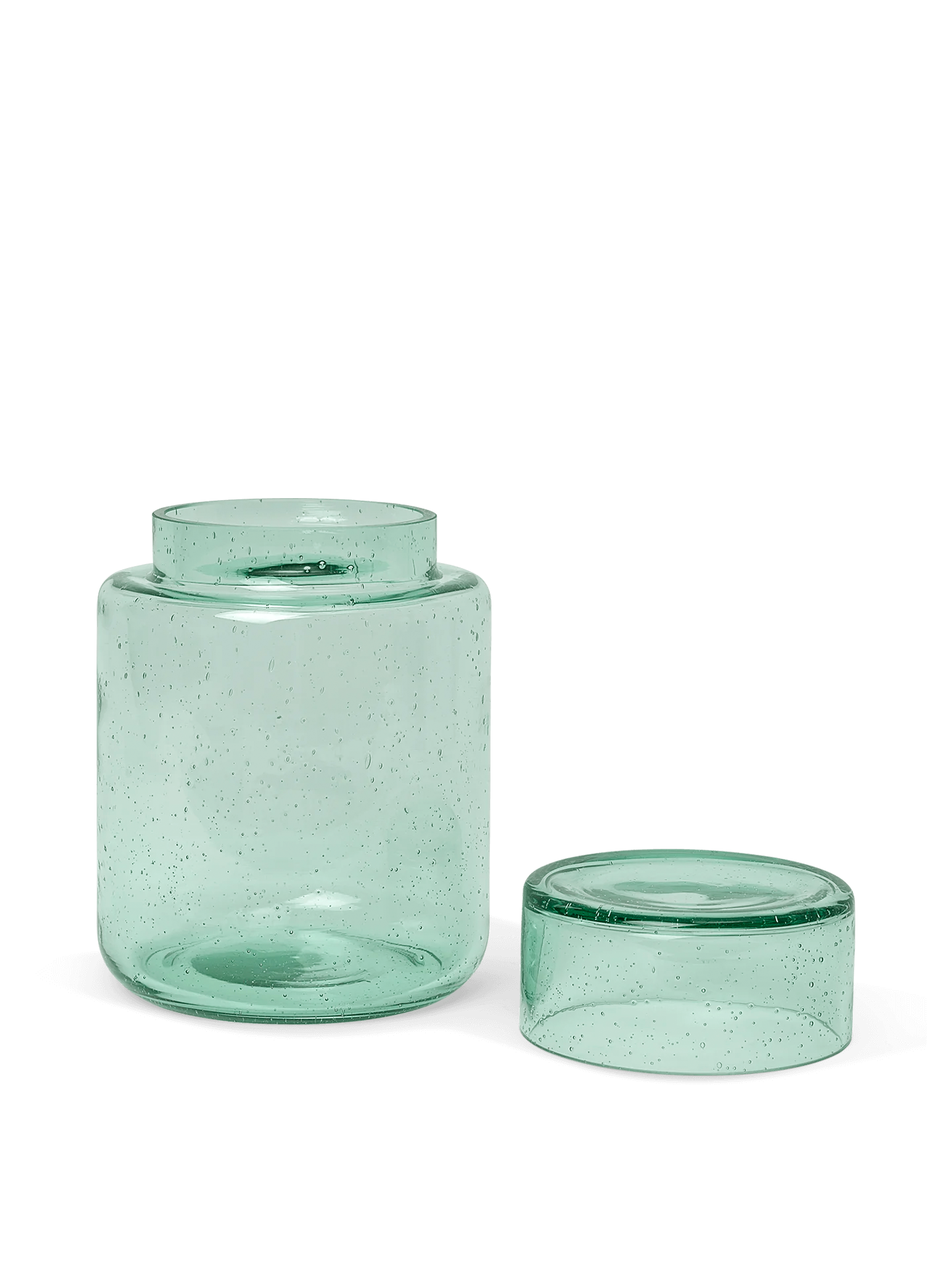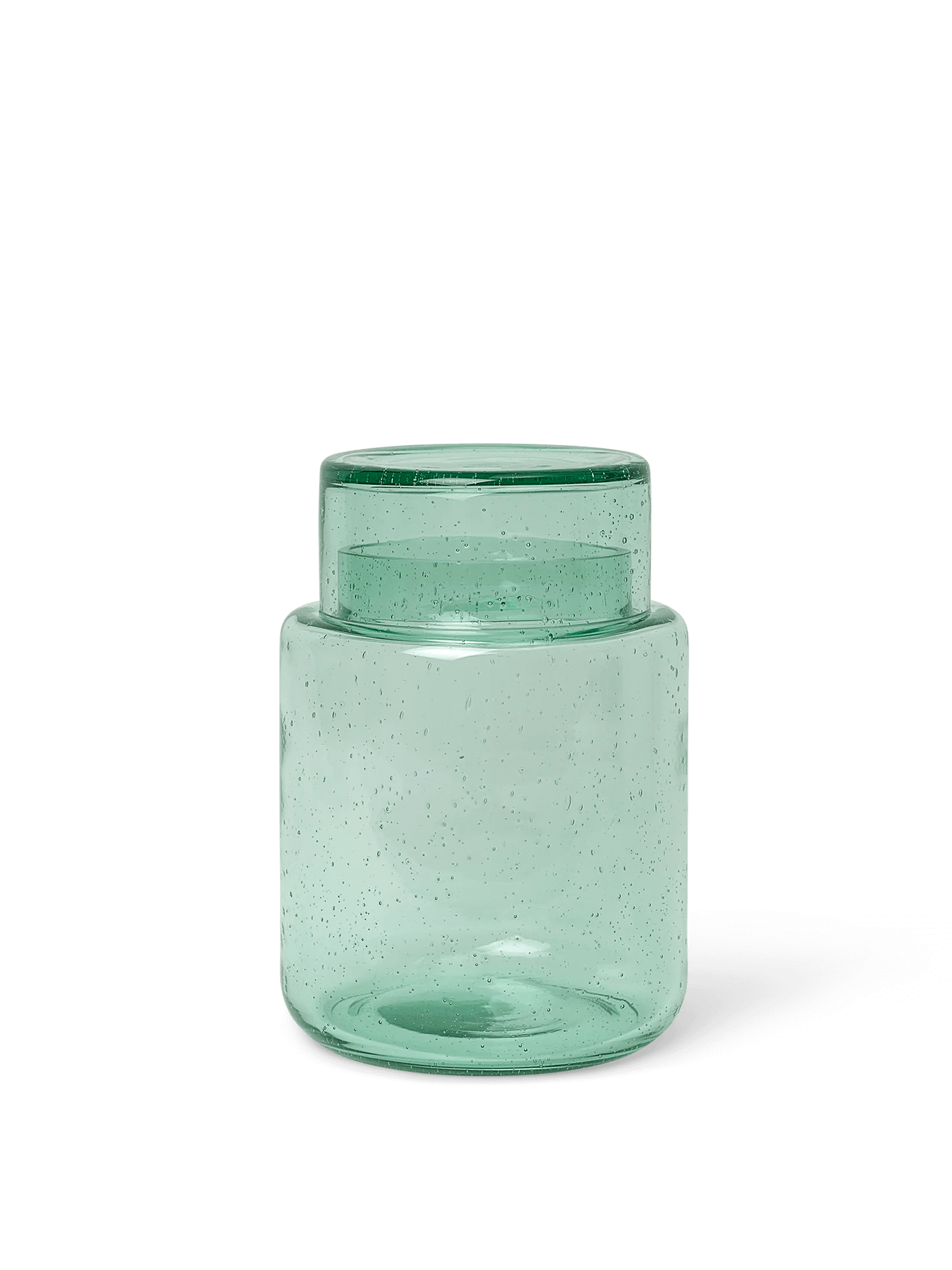 Inspired by vintage olive jars, the Oli Container is a multifunctional glass container that can be used both as a storage container and as a vase. Made from 100% recycled glass, the versatile container features distinctive little bubbles that are created by deliberate pockets of air left between the layers of mouth-blown glass. When not in use with the container, the generously sized lid can double as a serving tray. Both decorative and practical, the Oli Container is ideal for open-storage kitchens.