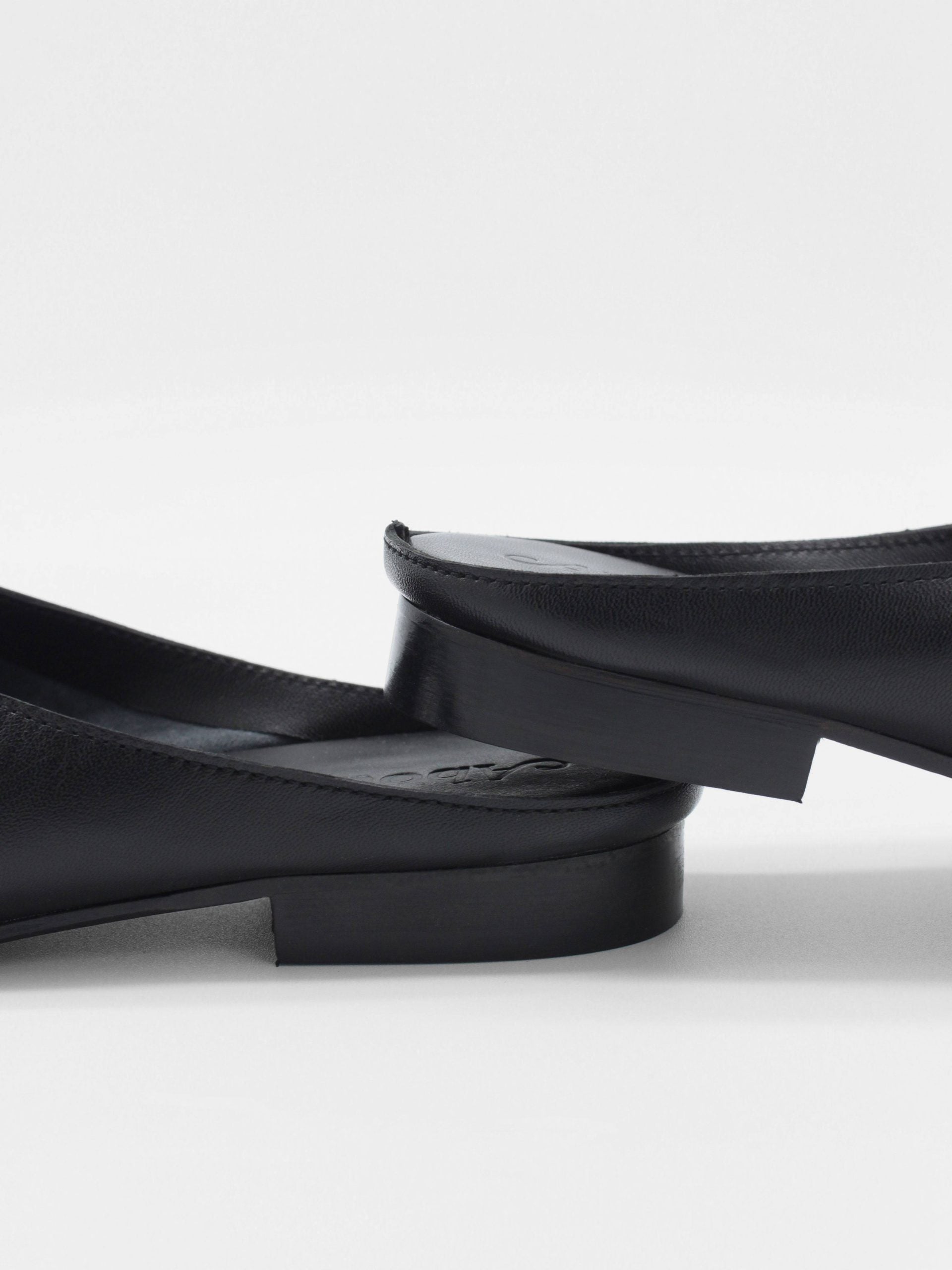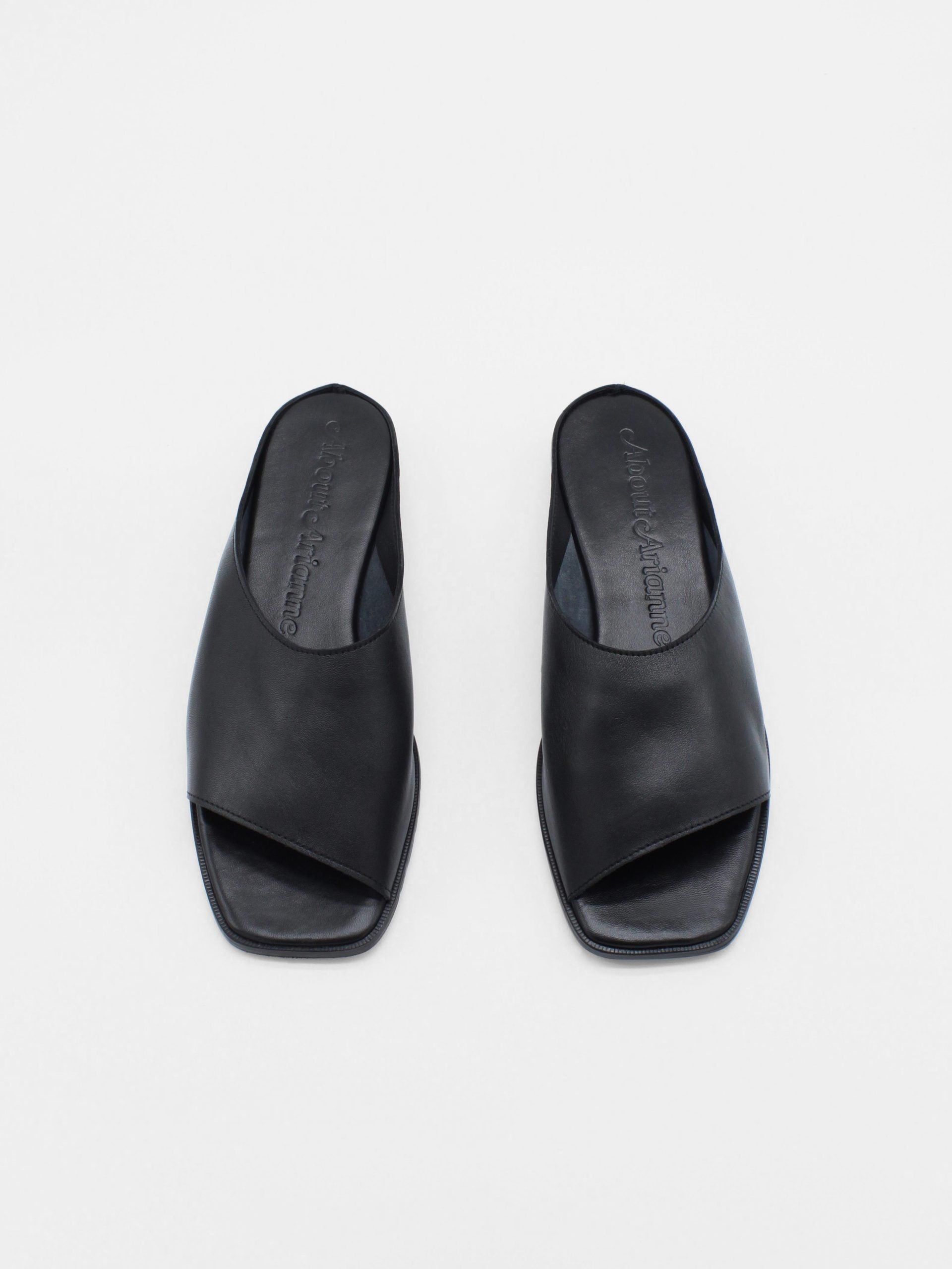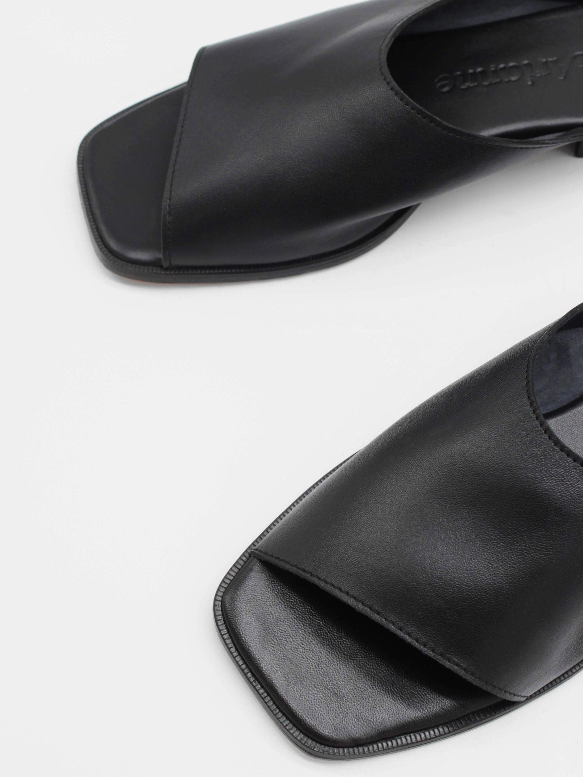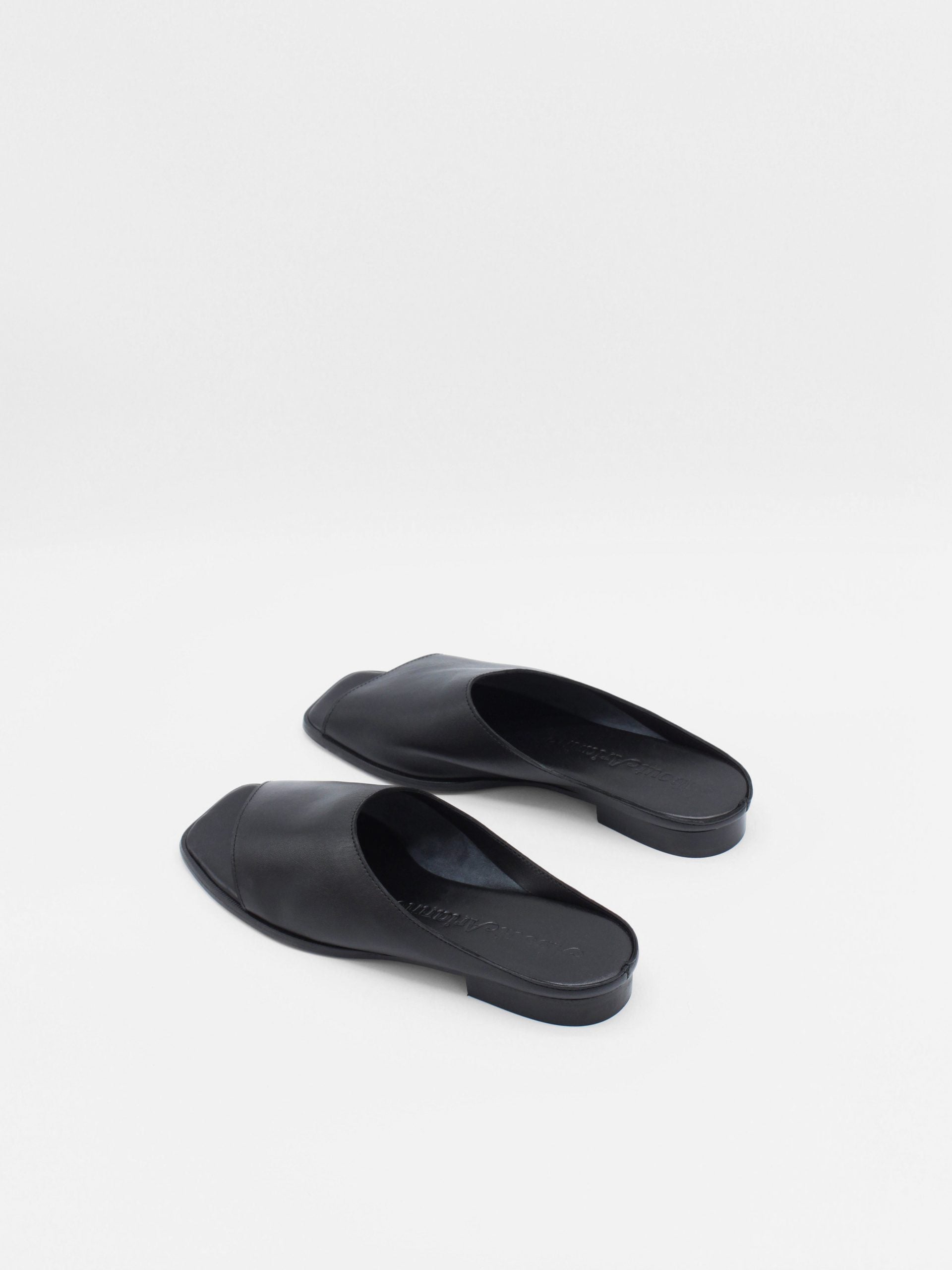 Unlined asymmetric mules made of soft black lamb nappa leather. This sandals feature a square toe and a leather stack heel. The sole is made of leather with a lacquered finish.