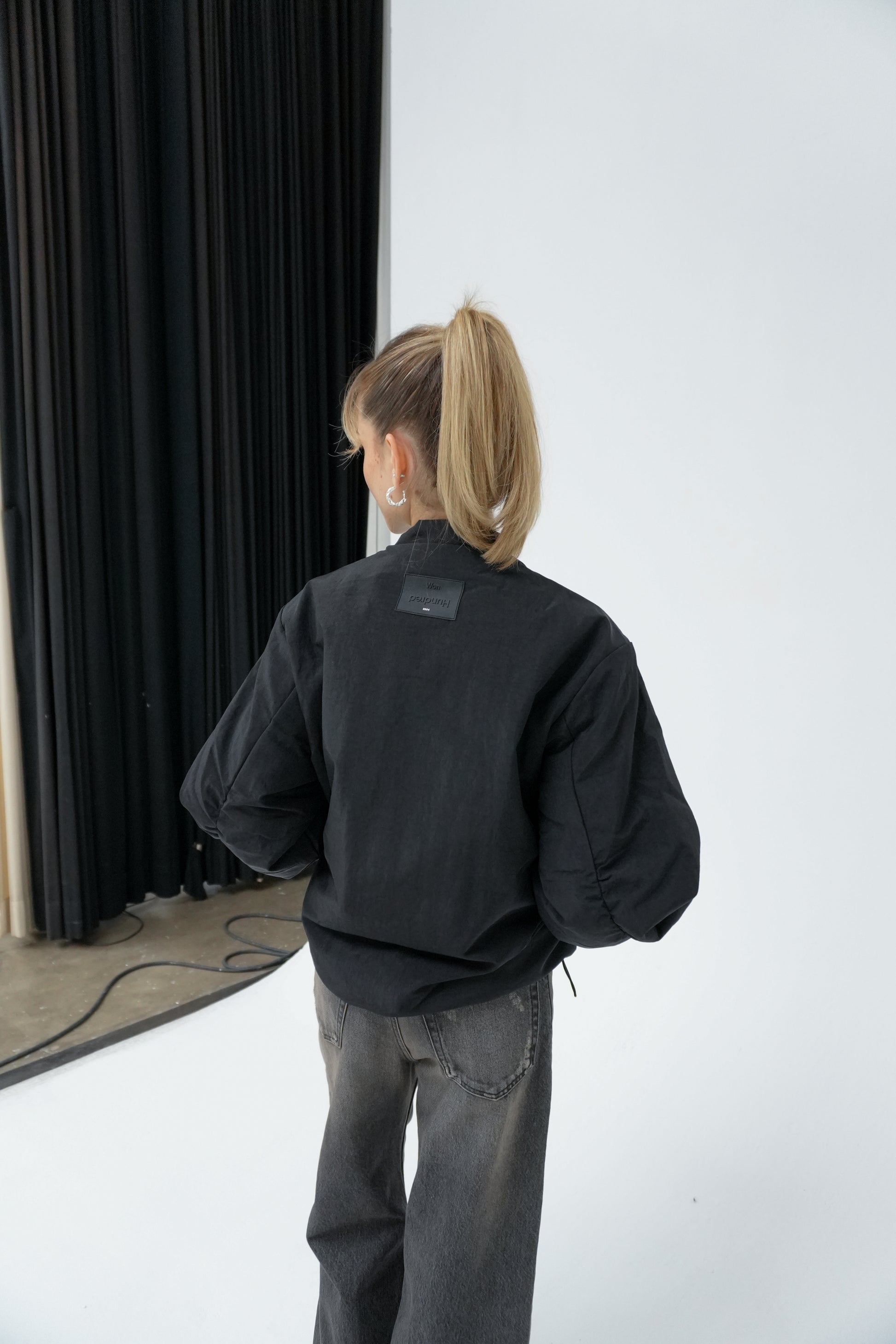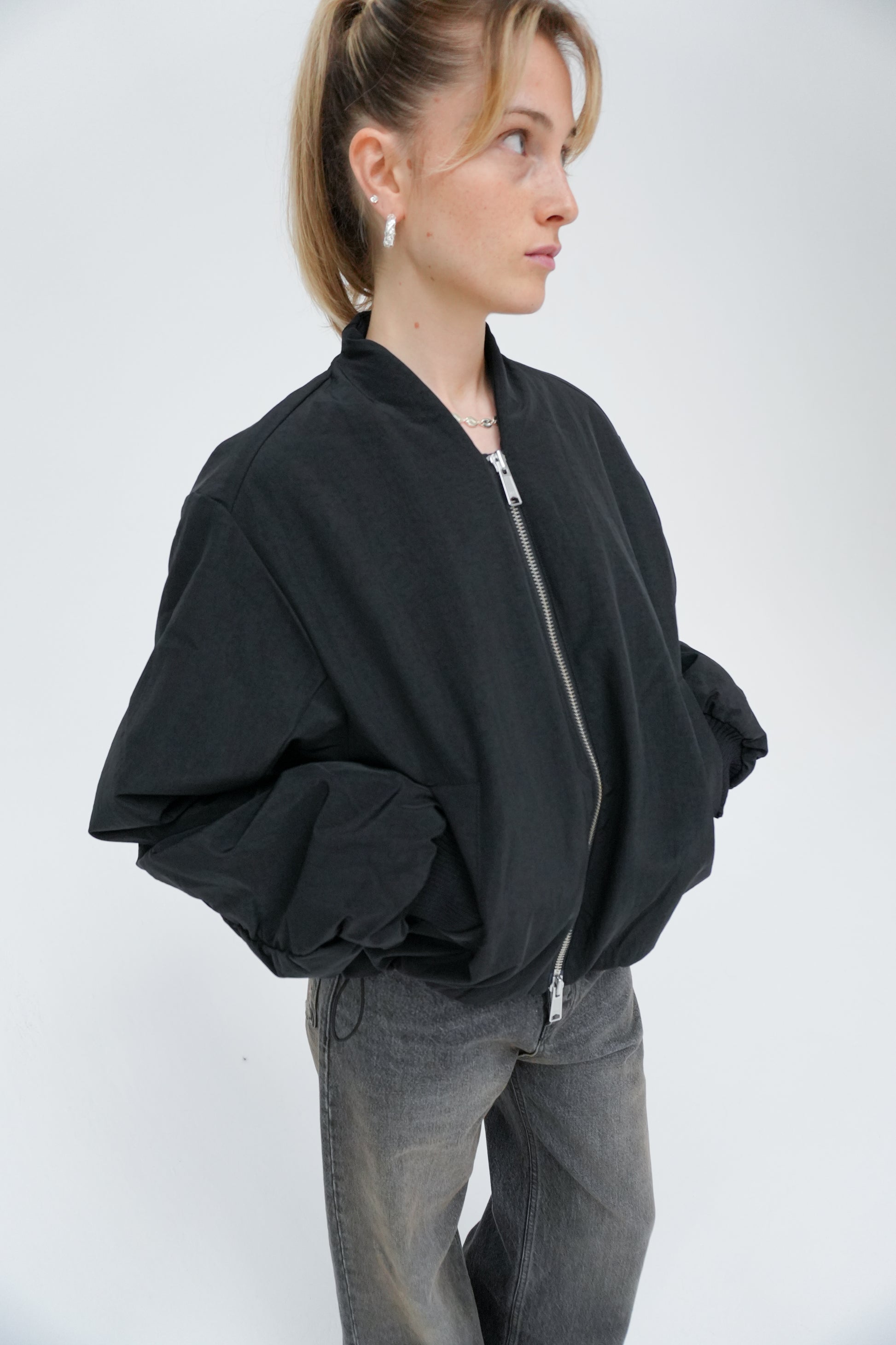 The Opal bomber jacket is designed in a cropped fit with a special high-neck collar and large sleeves for a drapey and bold aesthetic. This bomber jacket features a heavy front zipper, slanted side pockets, and an adjustable waist with inside elastic for a customizable fit.