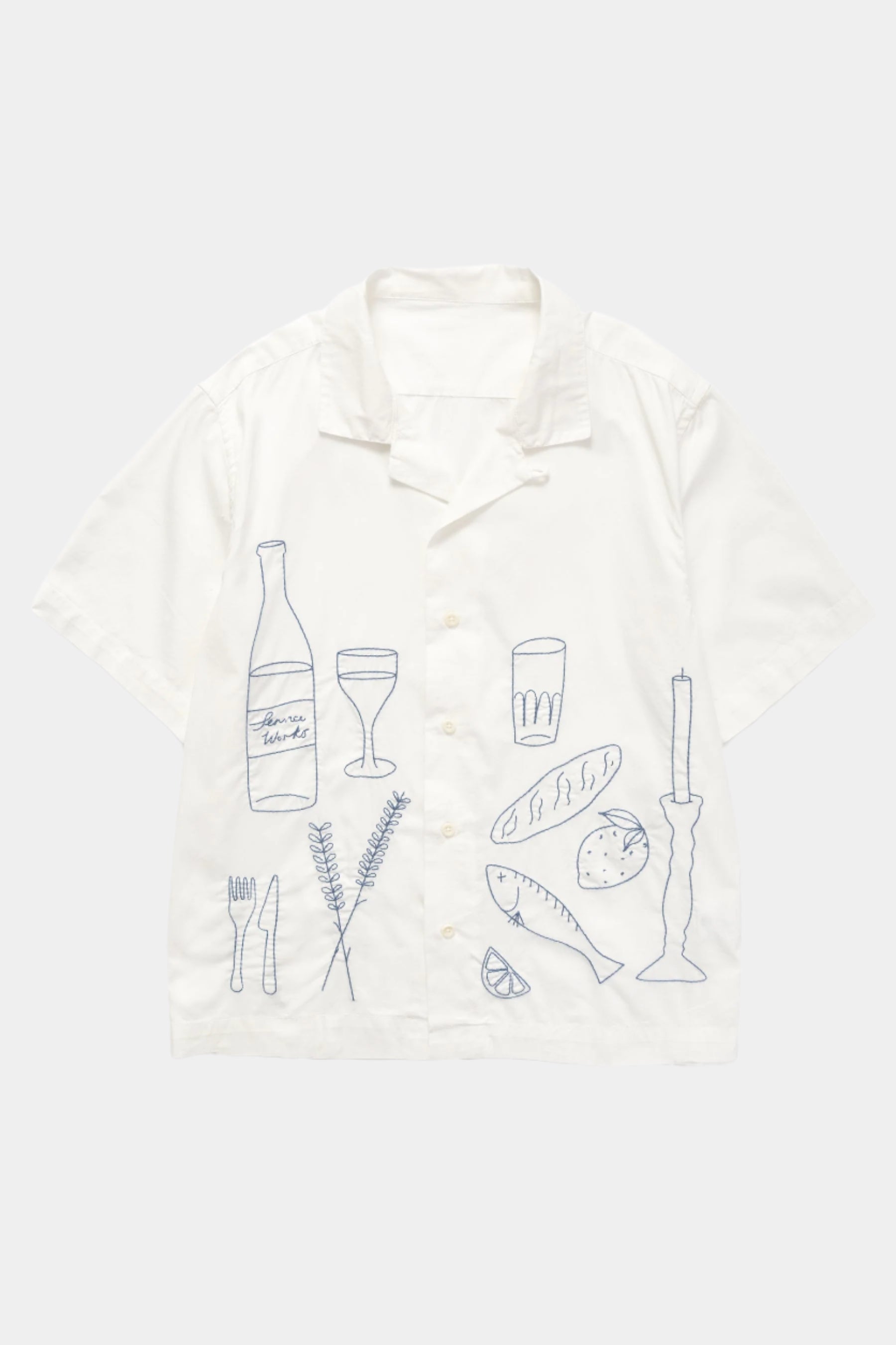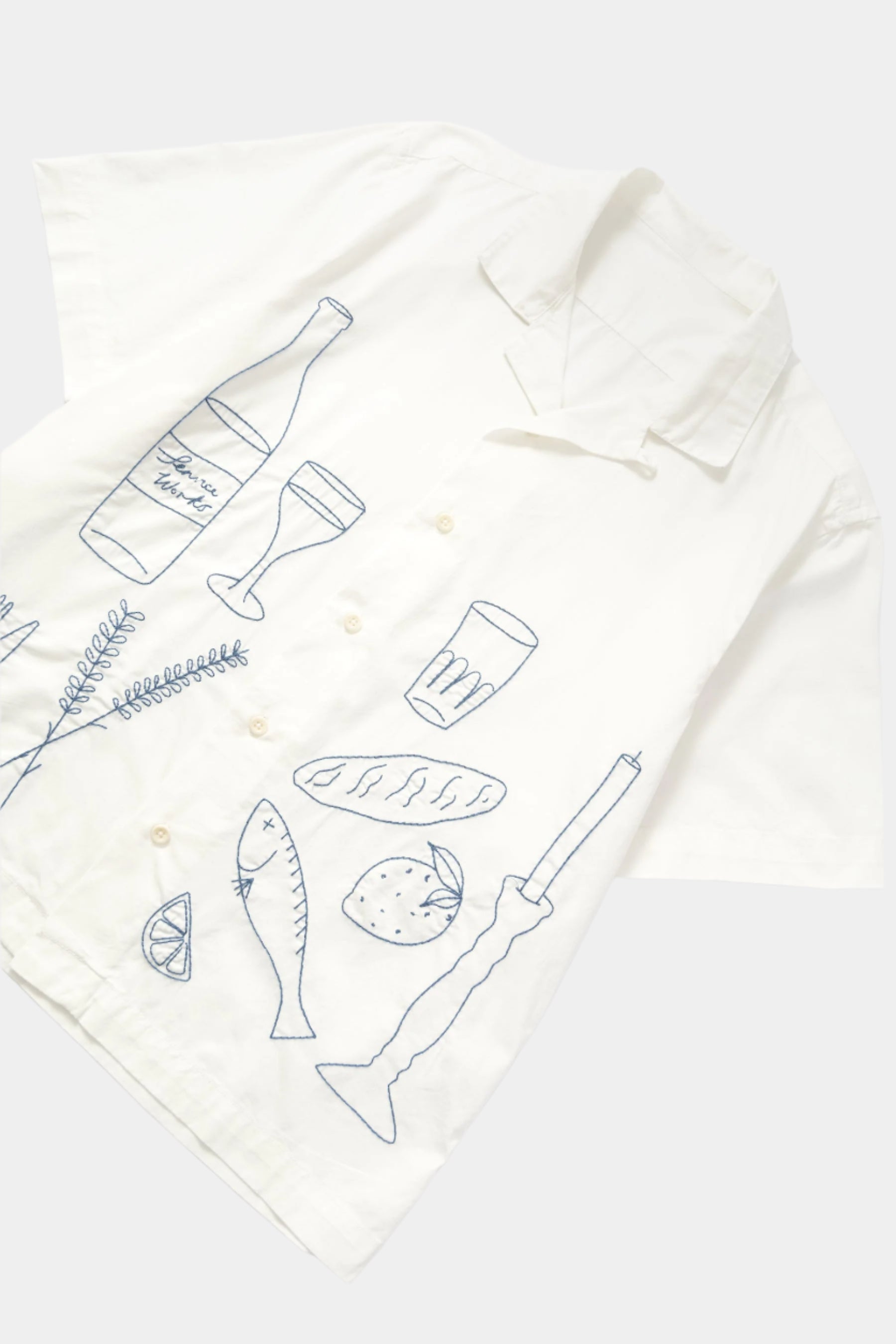 The Light Twill Picnic Short Sleeve Shirt by Service Works features off-white twill fabric and embroidered graphics that draw inspiration from the works of Oeuvres Sensibles and designer Sarah Espeute.