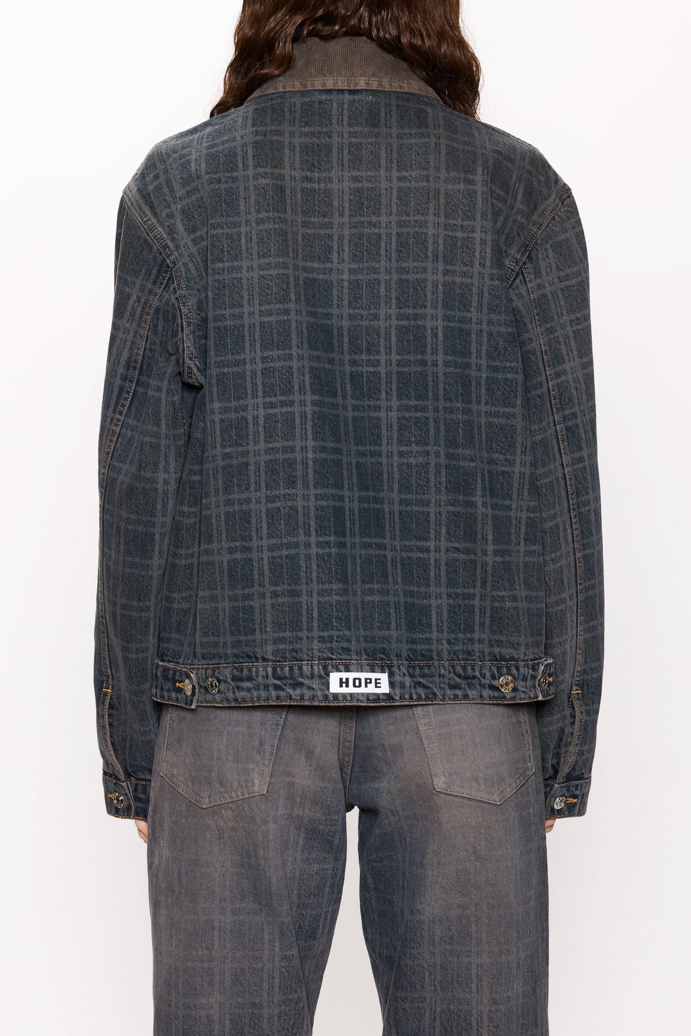 Pond Jacket is a boxy zip-up jacket with two zip pockets and a corduroy collar. Crafted from rigid denim in a dusty blue wash with a laser-etched check pattern. All HOPE denim washes are achieved with advanced techniques that drastically reduce the amount of energy, chemicals, and water used.
