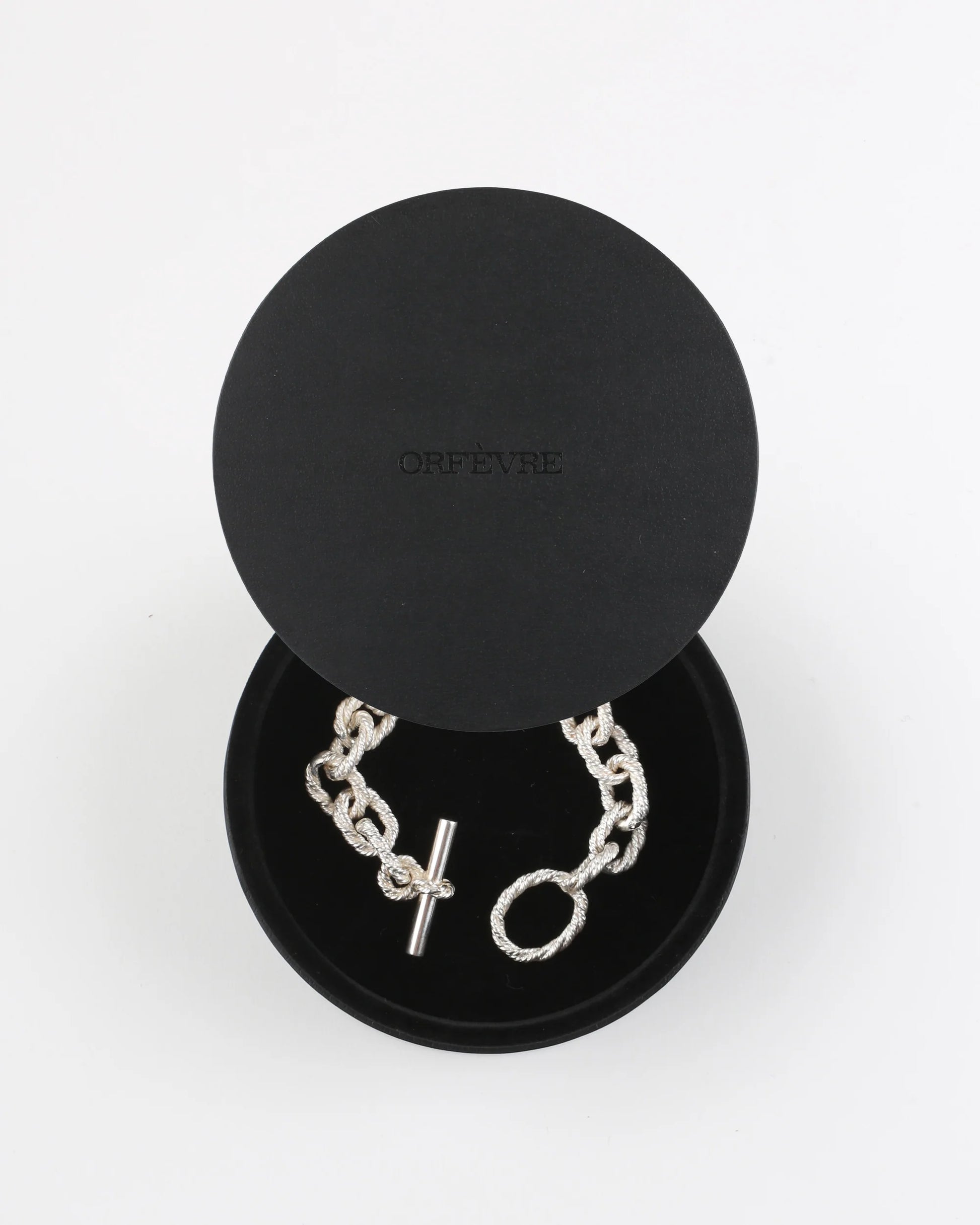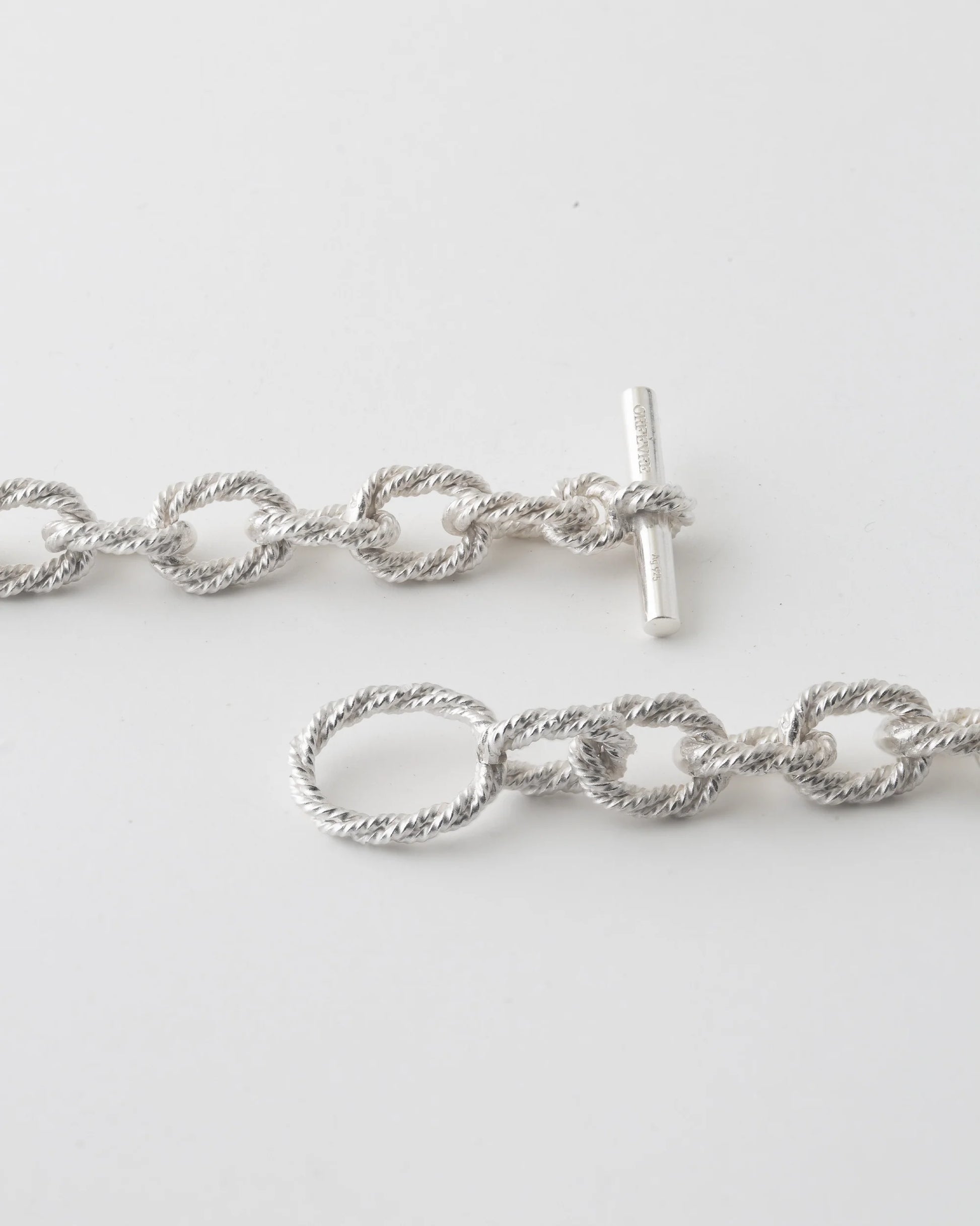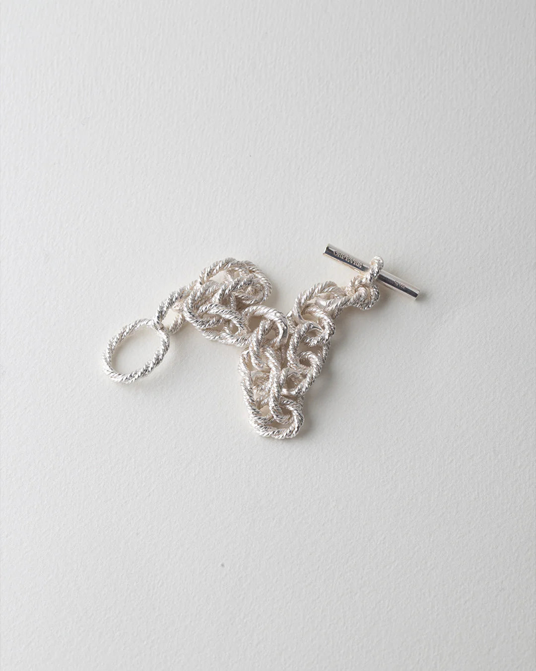 The ROPE BONDED BRACELET unites pure form with subtle movement. Its triple-twisted structure recalls the artistry of traditional ropework, lending the design a quiet sense of dynamism. The bracelet features a signature T-bar clasp. Handcrafted in Düsseldorf from sterling silver.