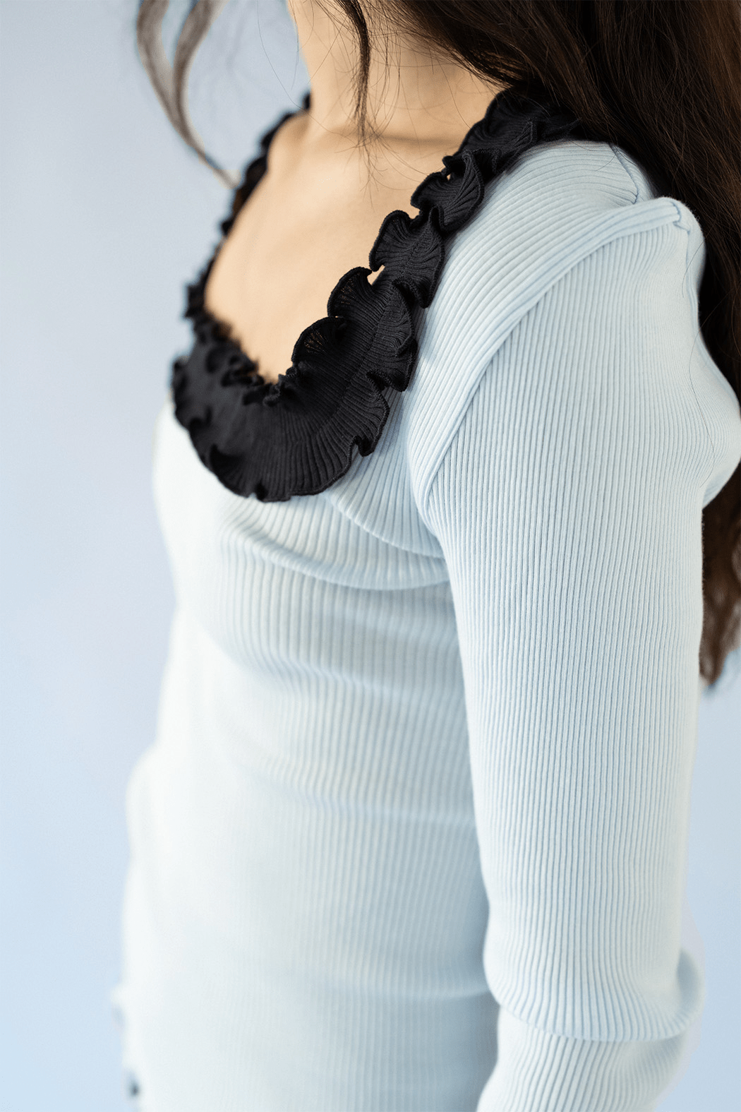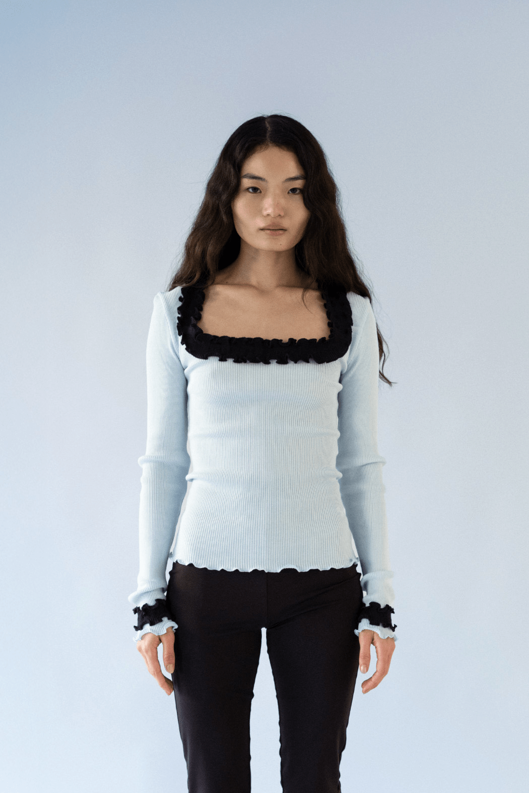 Our Rosie Seamless Top is crafted from soft 100% ice blue organic cotton. The top is all-over ribbed and hugs all shapes and sizes beautifully. The neckline features an open, square-shaped cut-out adorned with a lovely white ruffled edge that extends to the sleeve ends.